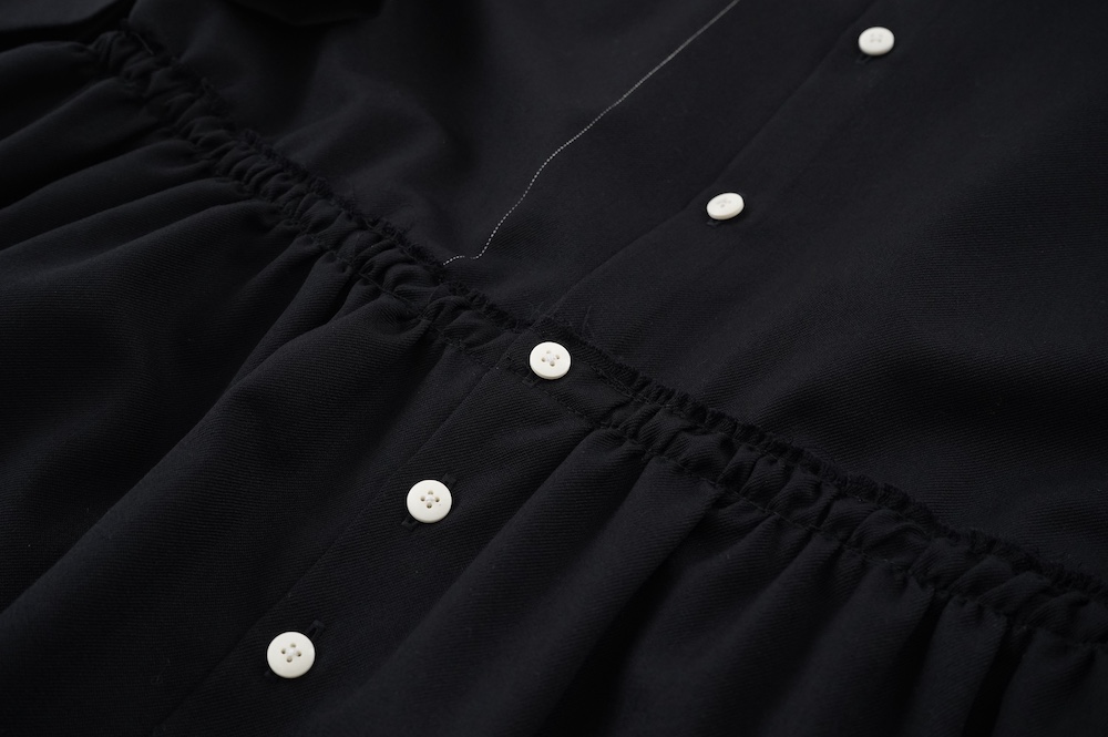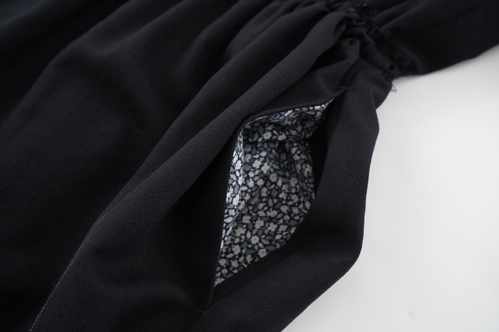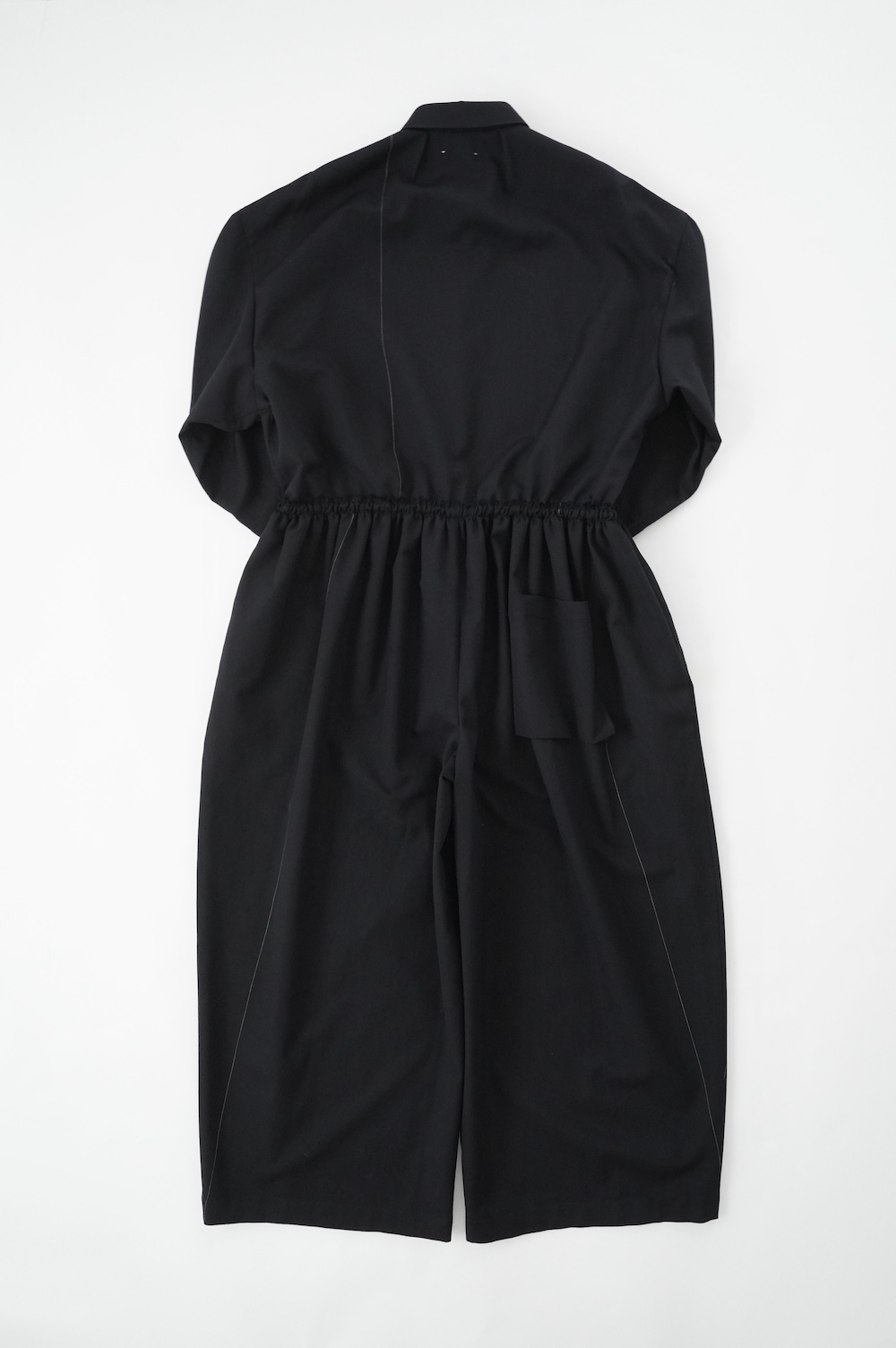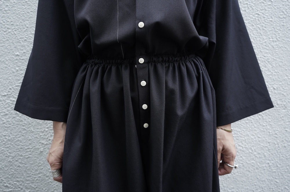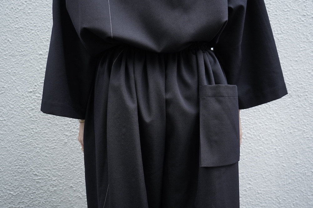 デザインはレギュラーカラーを配したジャンプスーツ。全体的にゆったりとリラックスして着ていただけるサイジングで、パンツ部分もワイド幅です。ウエストよりやや下目に切り替えが施してあり、切り替え部分には紐がついているのでキュッと絞ってシルエットを変えていただけます。ウエストでキュッと絞って、パンツ部分には裁ち切りでギャザーが入っているのでちょうど腰位置で丸みのあるシルエットが出るように仕立てています。裏地はついていませんが、ポケットの袋布やパイピングに小花柄の生地を使用しているのが可愛らしい。マニッシュな雰囲気が格好良いジャンプスーツです。