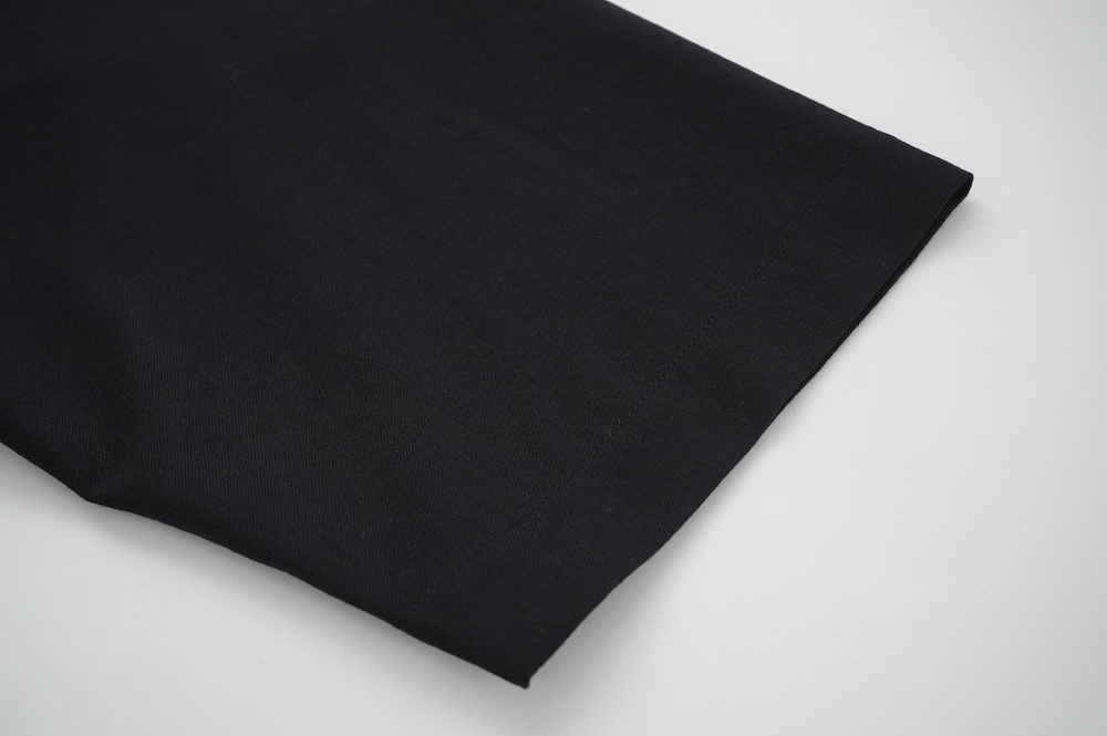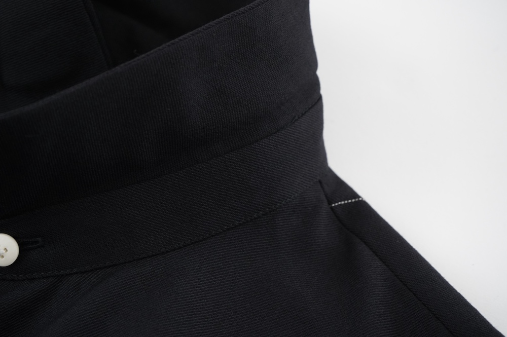 キタンのパンツ。毛織物の産地である尾州で、メリノウールの梳毛糸を使用して織り上げた濃紺のサージ生地を使用。白いラインがとても映える、黒に近い綺麗な濃紺色です。アクセントになっている白いラインは、ヴィンテージのキャンバス生地の耳(端)のラインをイメージしたもの。さりげないラインですが、存在感があります。スーツにもよく使用されるウールサージ生地は暖かさとしなやかさがあり、上品な素材です。