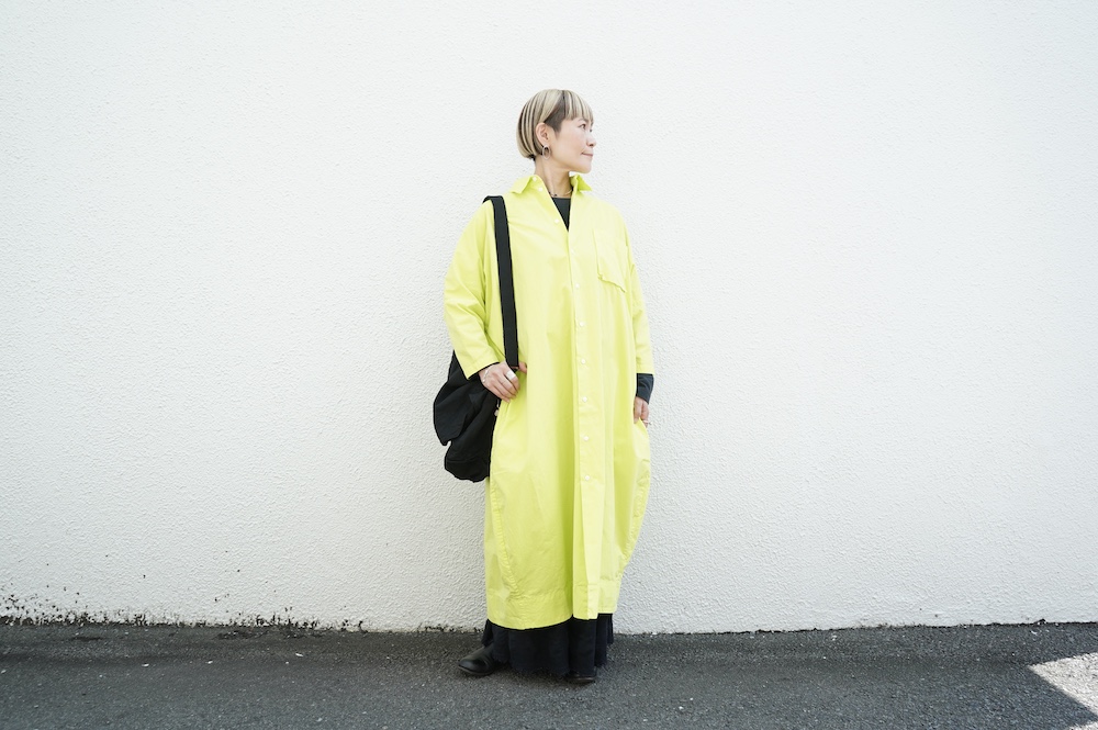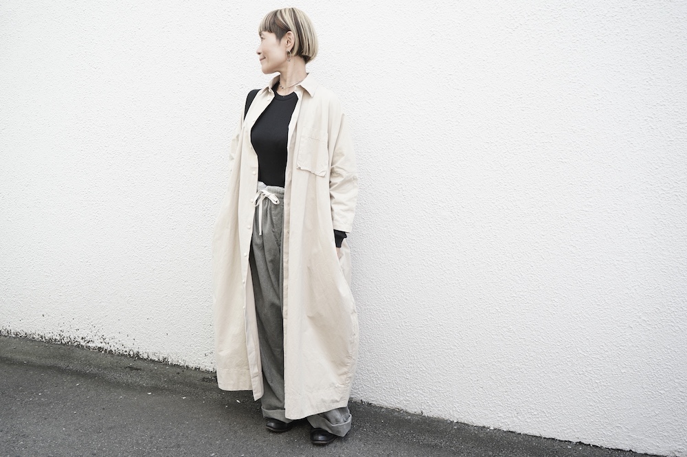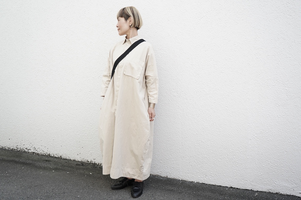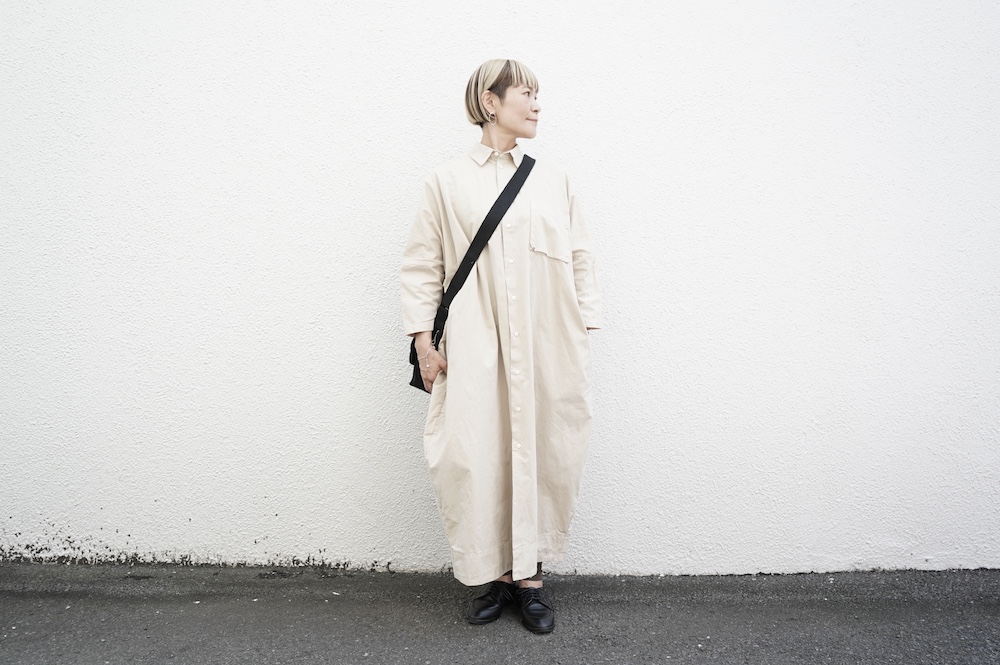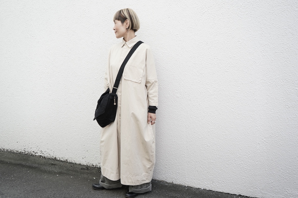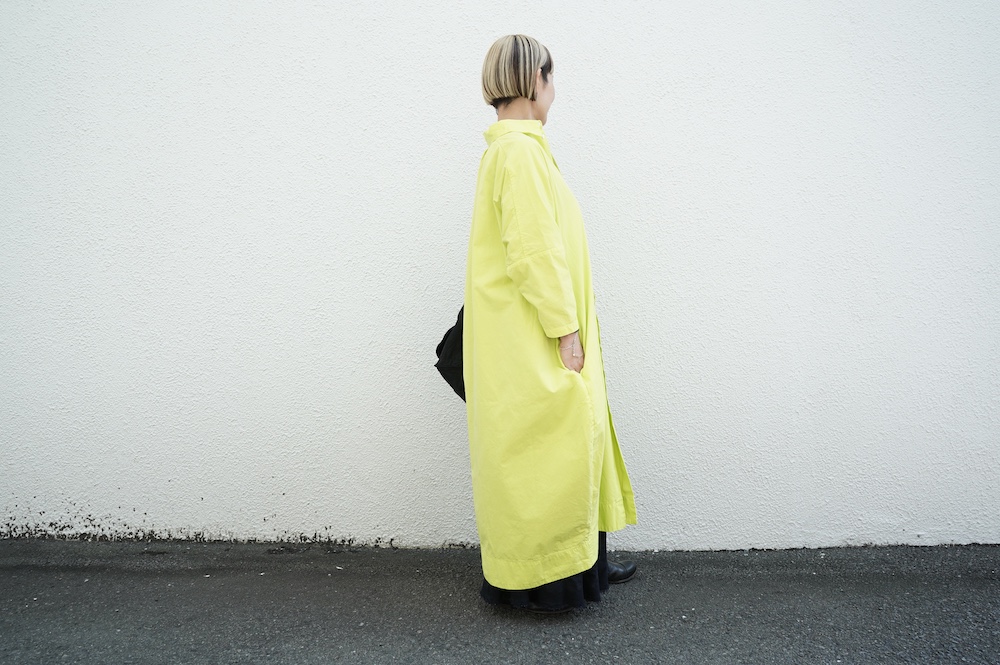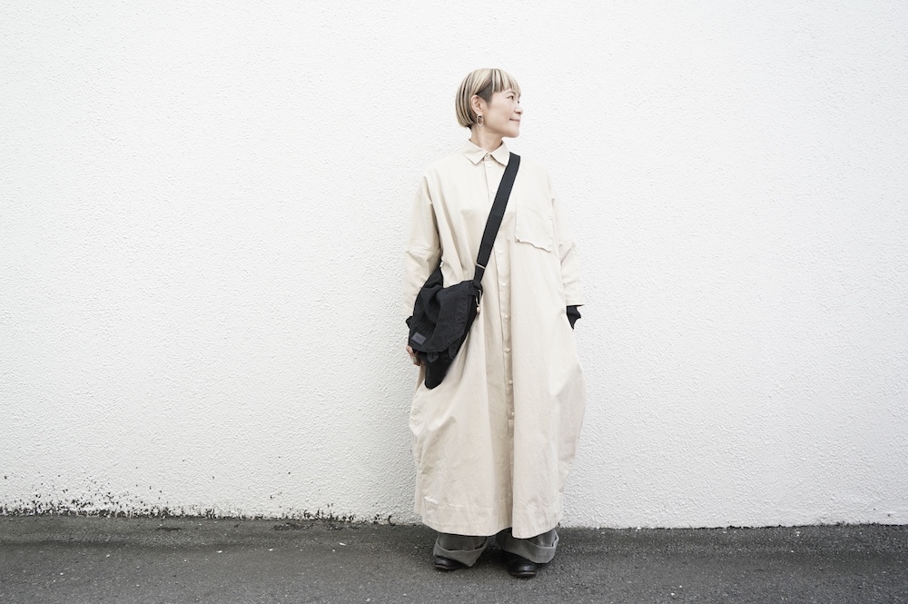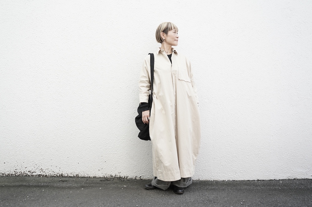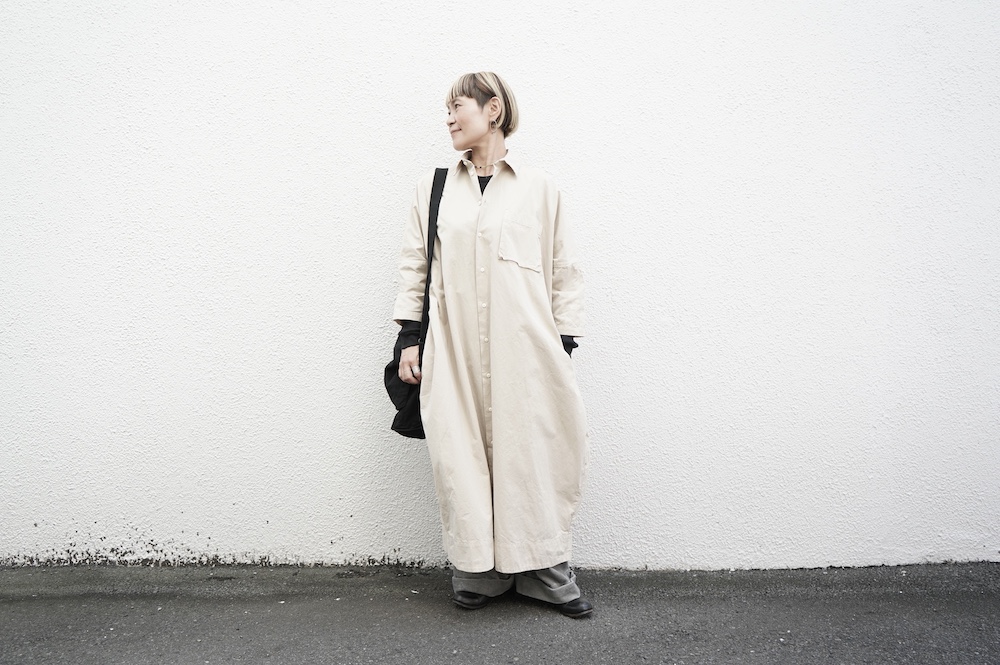 デザインは、レギュラーカラーを配したロングシャツワンピース。ヒップ〜裾にかけて丸みのあるバルーンシルエットになっています。肩周りはドロップショルダーになっており、身幅もゆとりがあり羽織りとしてコートのようにも着て頂きやすい。袖丈は手首が出る少し短め丈です。アウターのように羽織りとして、また冬は上にニットカーデやベストを組み合わせたり、レイヤードが楽しいロングシャツワンピースです。