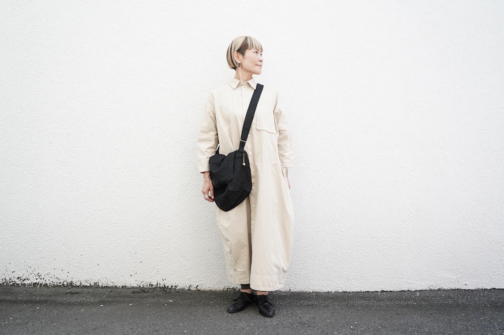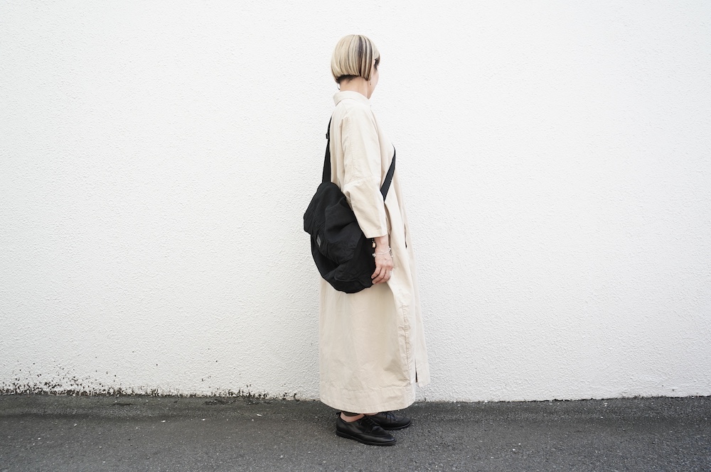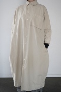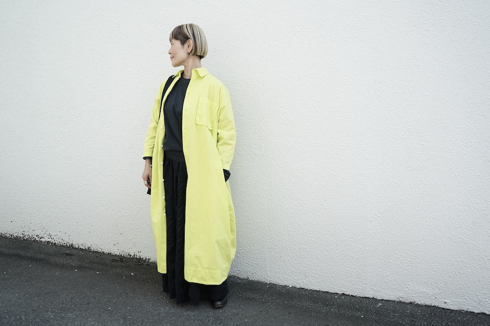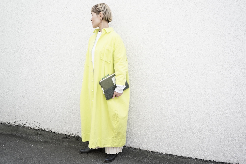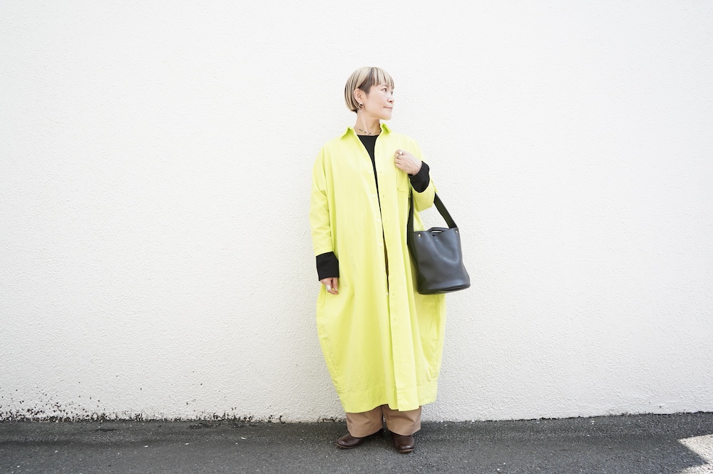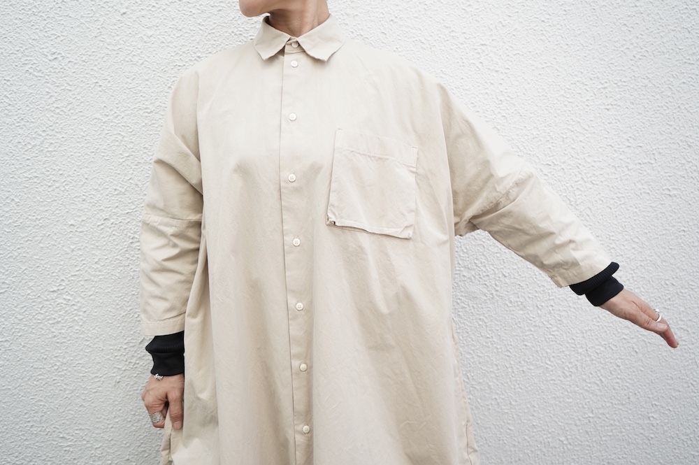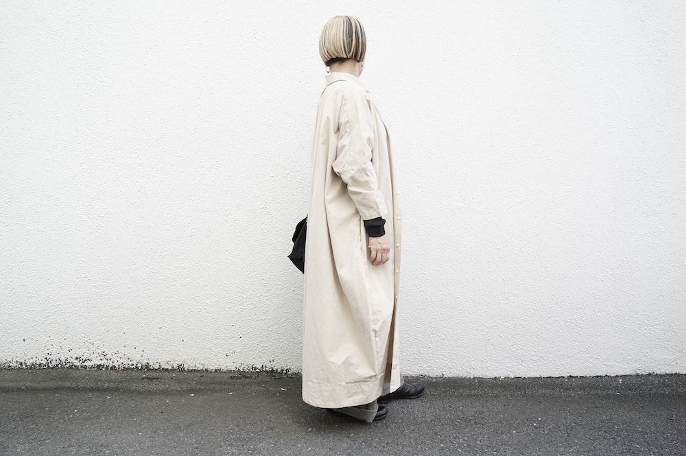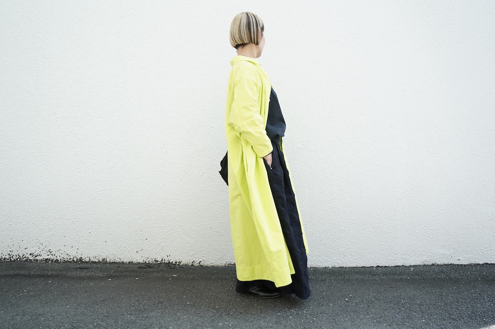 デザインは、レギュラーカラーを配したロングシャツワンピース。ヒップ〜裾にかけて丸みのあるバルーンシルエットになっています。肩周りはドロップショルダーになっており、身幅もゆとりがあり羽織りとしてコートのようにも着て頂きやすい。袖丈は手首が出る少し短め丈です。アウターのように羽織りとして、また冬は上にニットカーデやベストを組み合わせたり、レイヤードが楽しいロングシャツワンピースです。