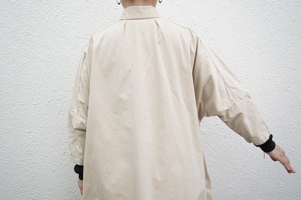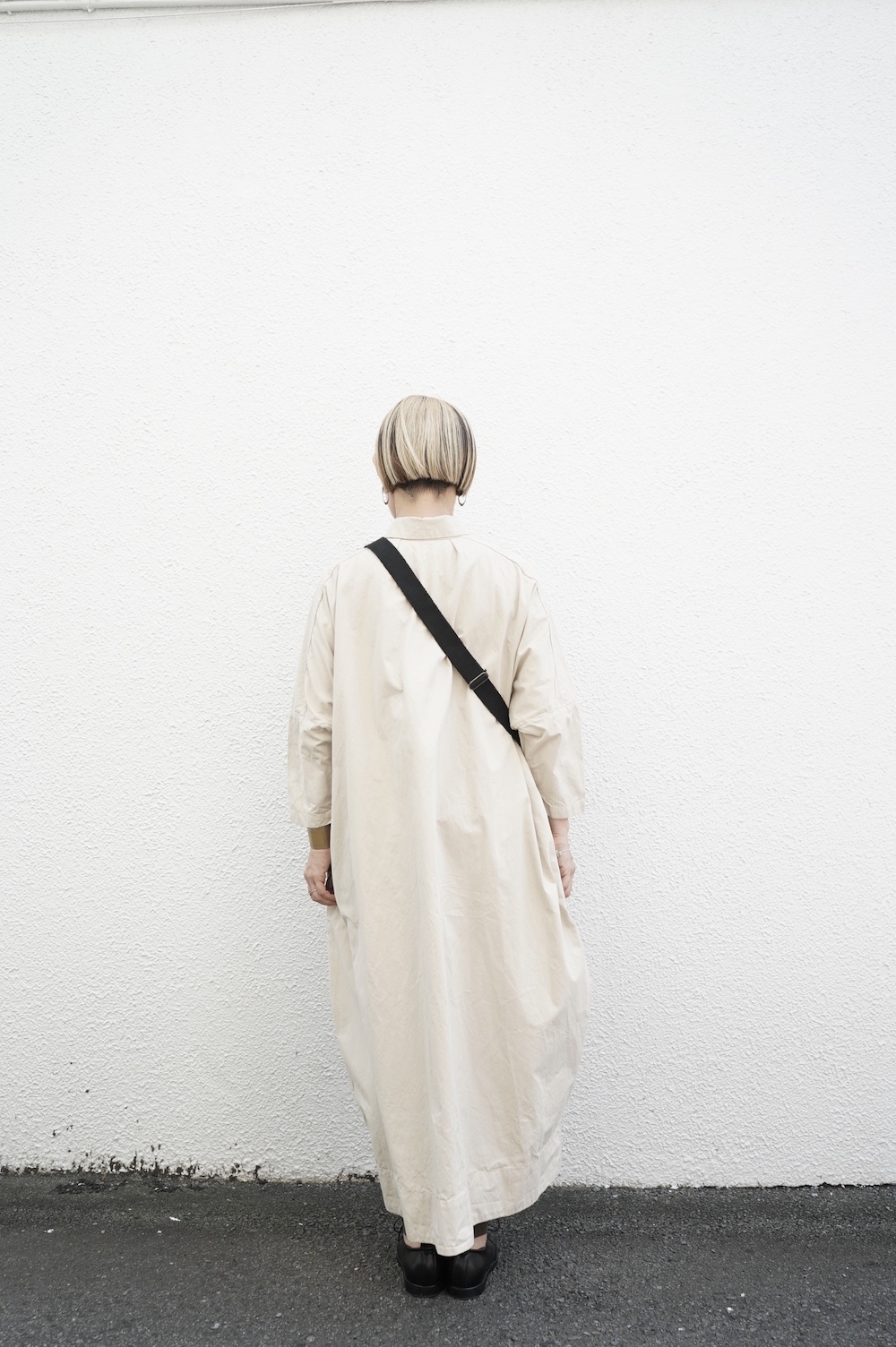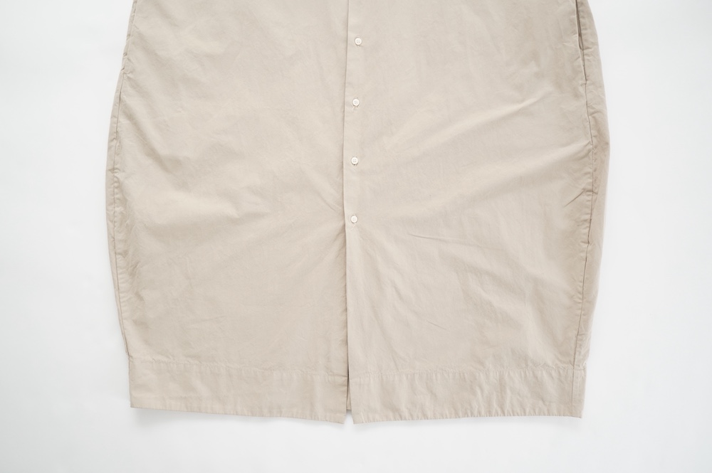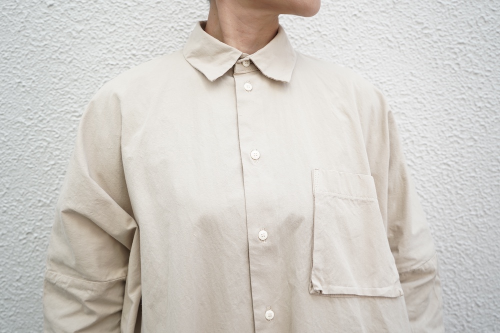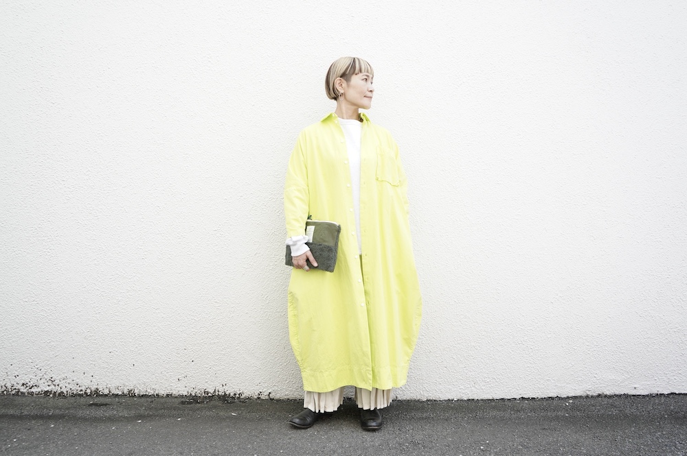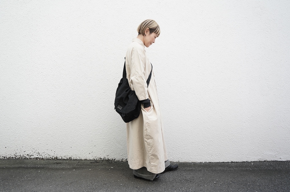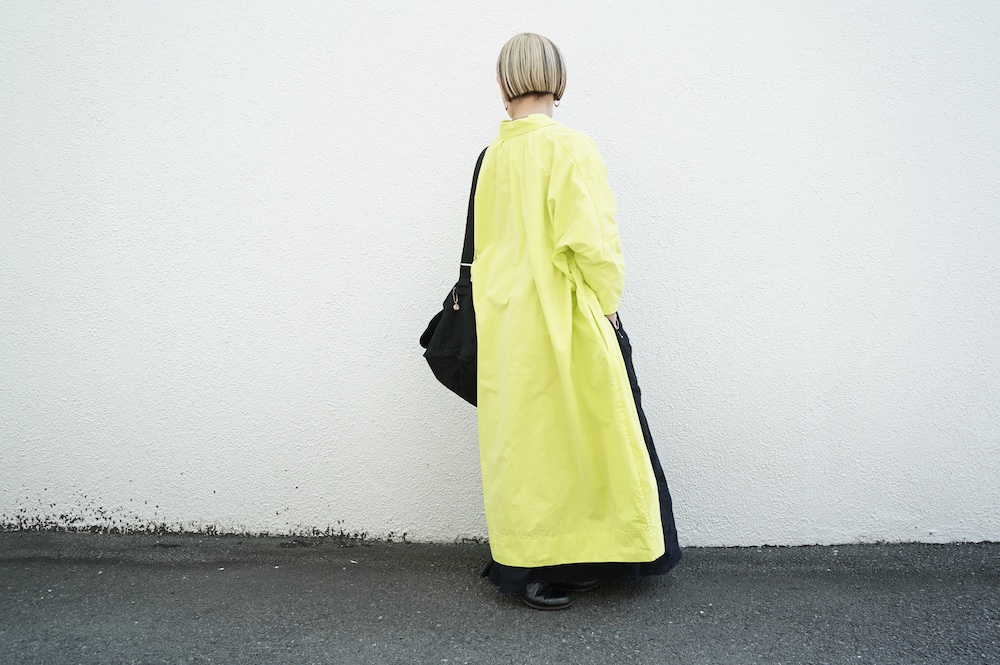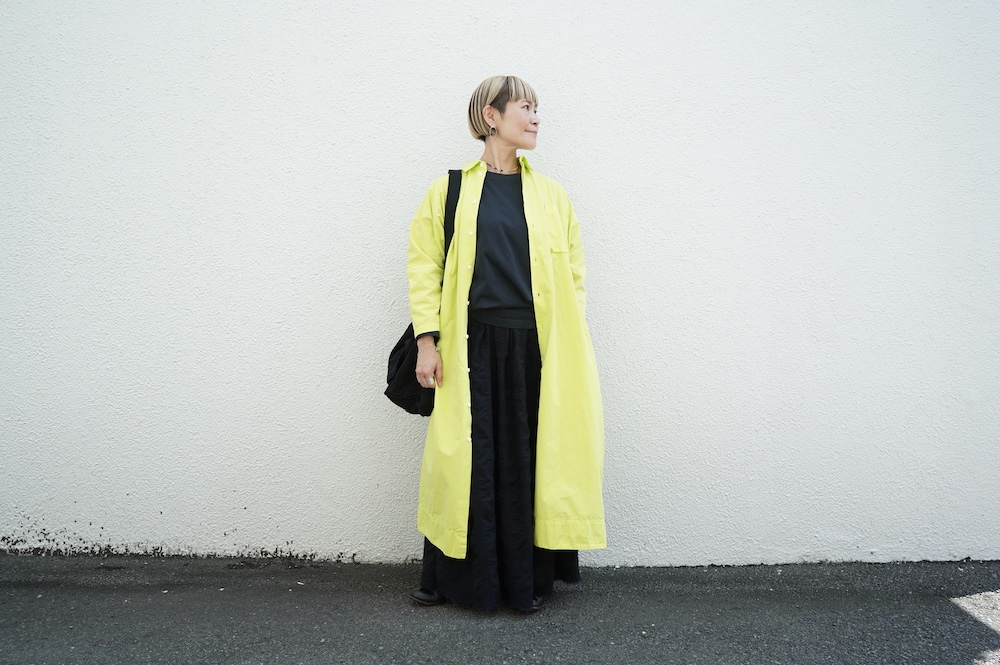 デザインは、レギュラーカラーを配したロングシャツワンピース。ヒップ〜裾にかけて丸みのあるバルーンシルエットになっています。肩周りはドロップショルダーになっており、身幅もゆとりがあり羽織りとしてコートのようにも着て頂きやすい。袖丈は手首が出る少し短め丈です。アウターのように羽織りとして、また冬は上にニットカーデやベストを組み合わせたり、レイヤードが楽しいロングシャツワンピースです。