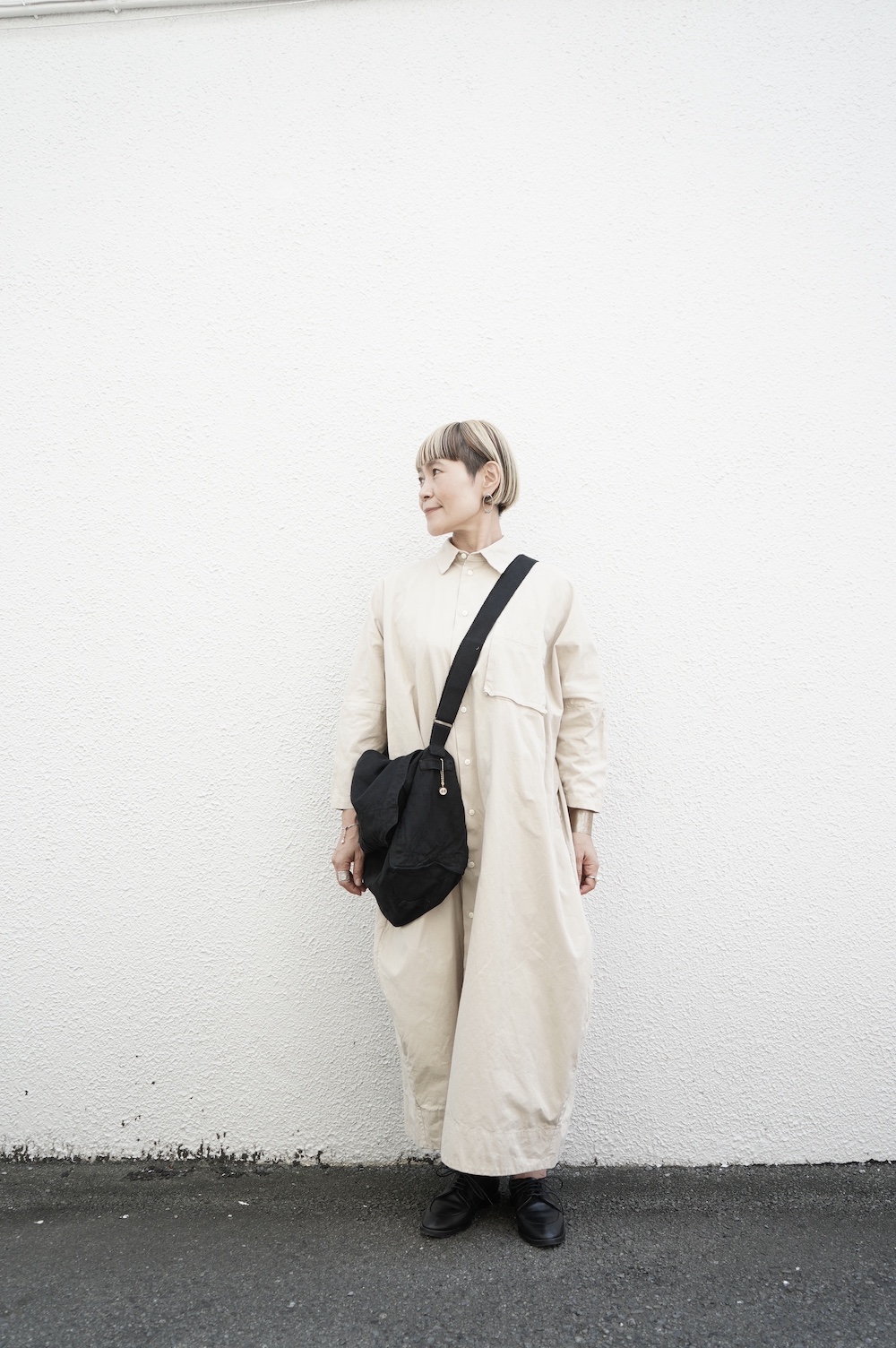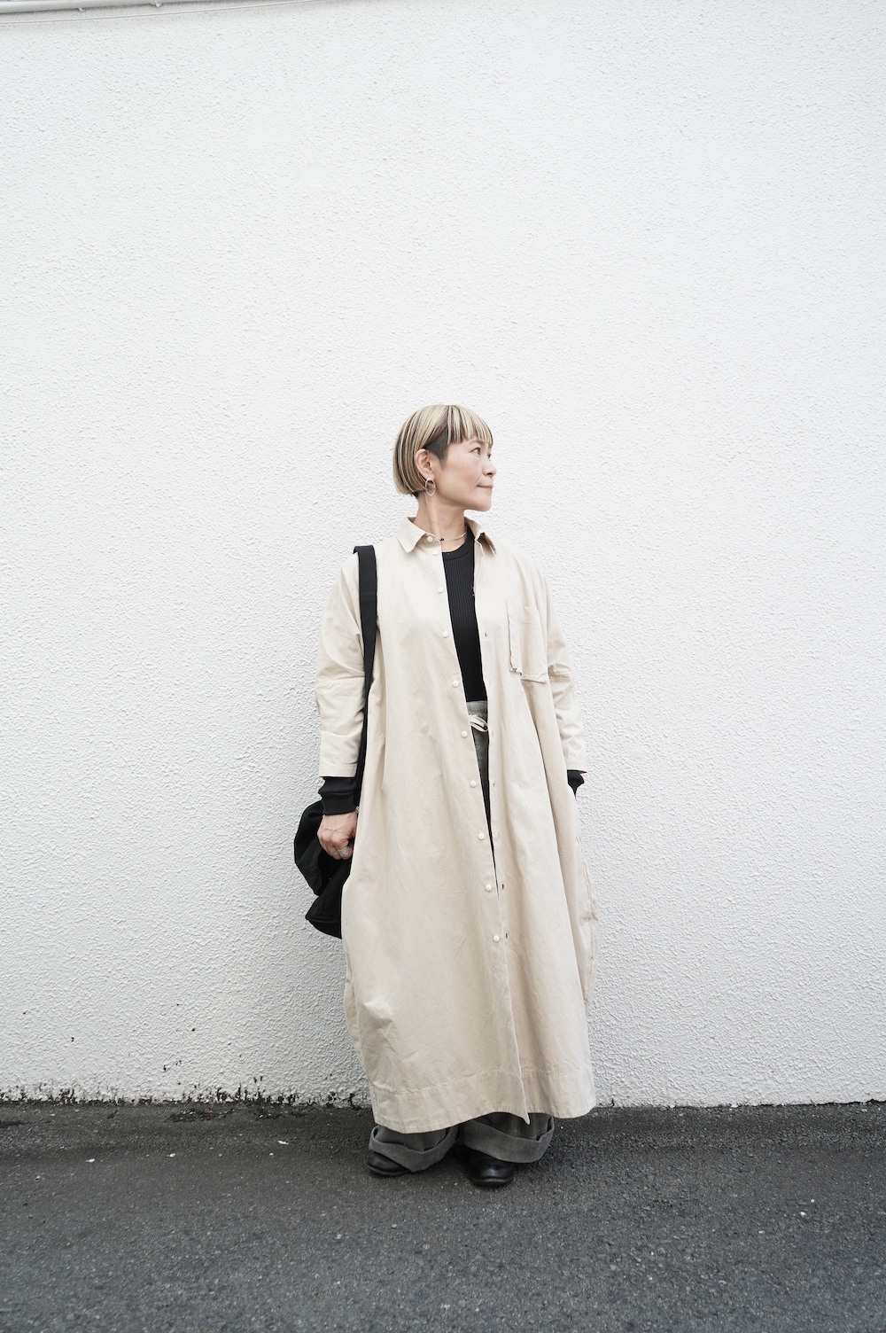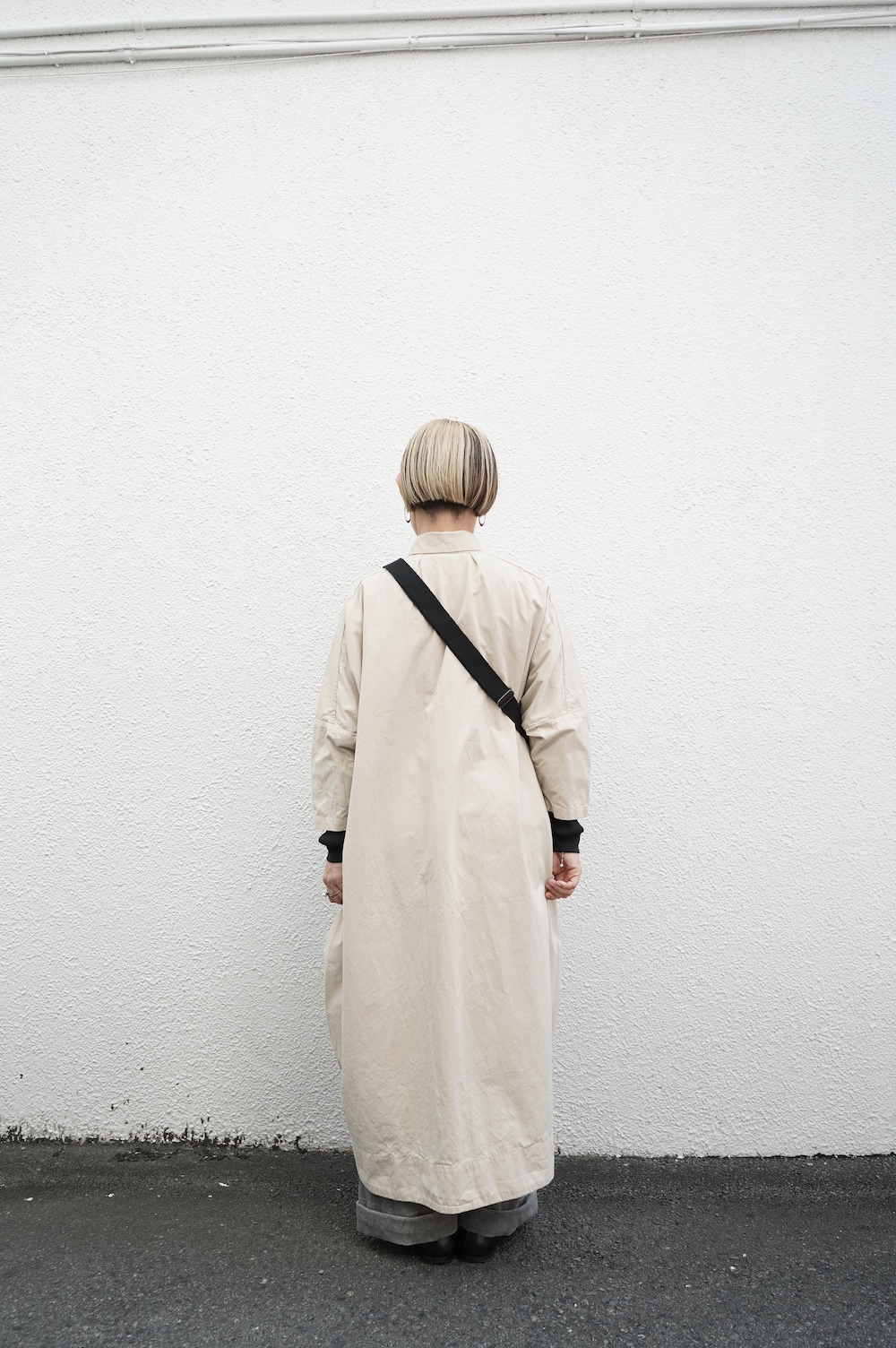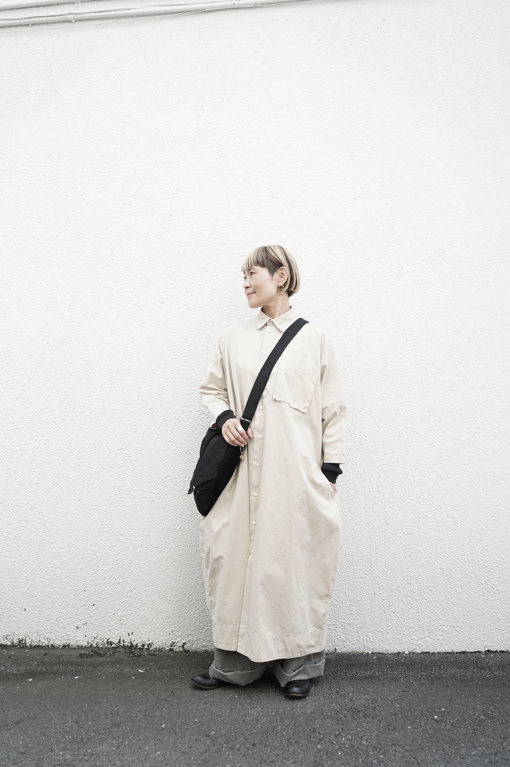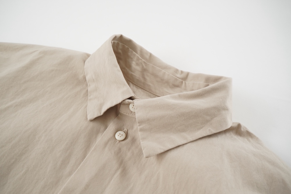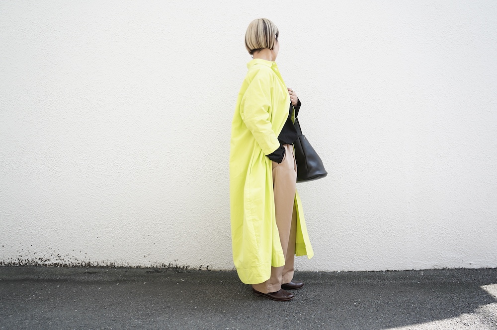 デザインは、レギュラーカラーを配したロングシャツワンピース。ヒップ〜裾にかけて丸みのあるバルーンシルエットになっています。肩周りはドロップショルダーになっており、身幅もゆとりがあり羽織りとしてコートのようにも着て頂きやすい。袖丈は手首が出る少し短め丈です。アウターのように羽織りとして、また冬は上にニットカーデやベストを組み合わせたり、レイヤードが楽しいロングシャツワンピースです。