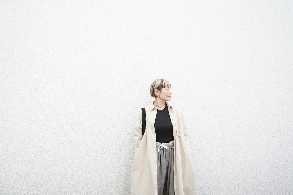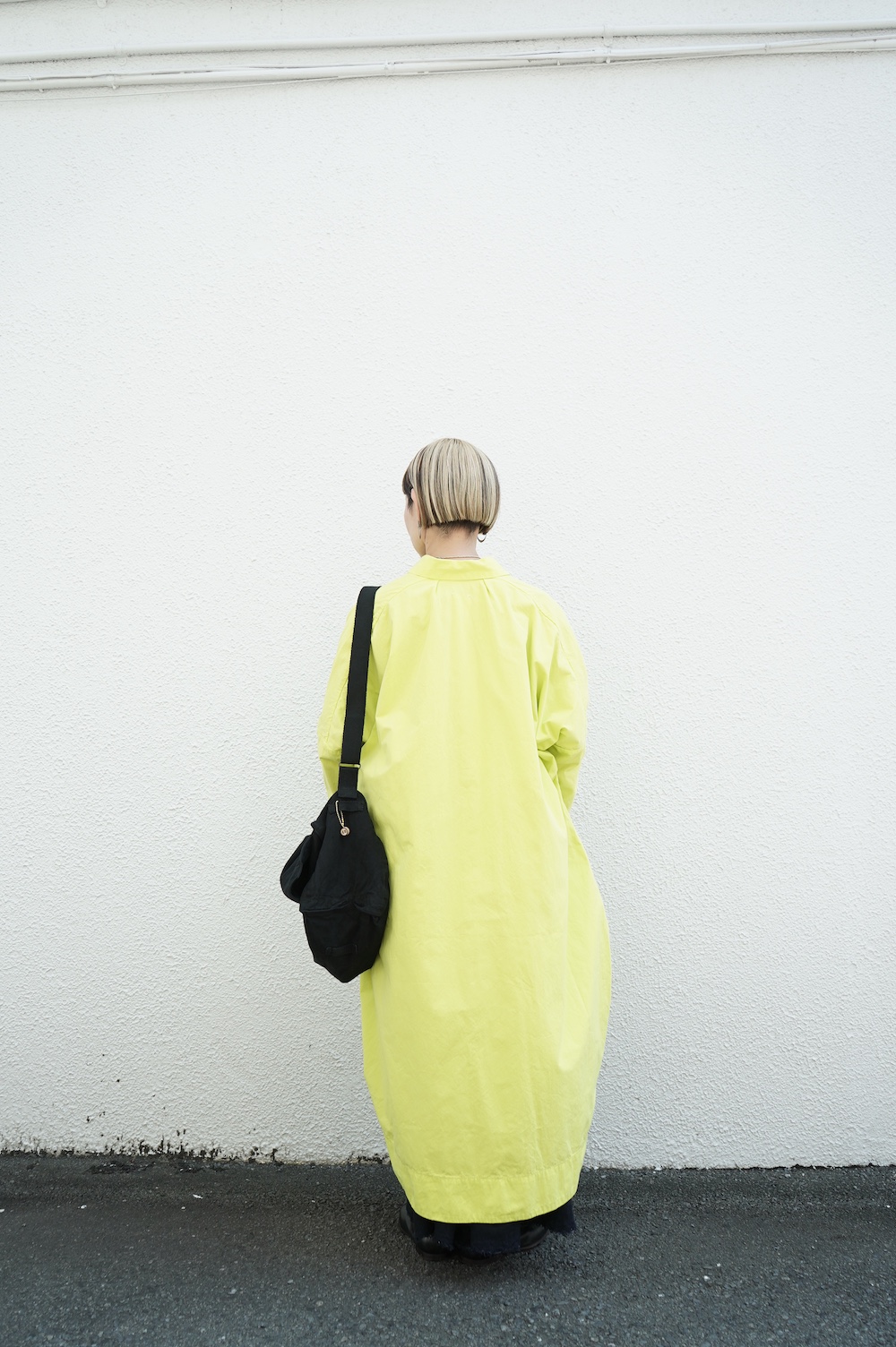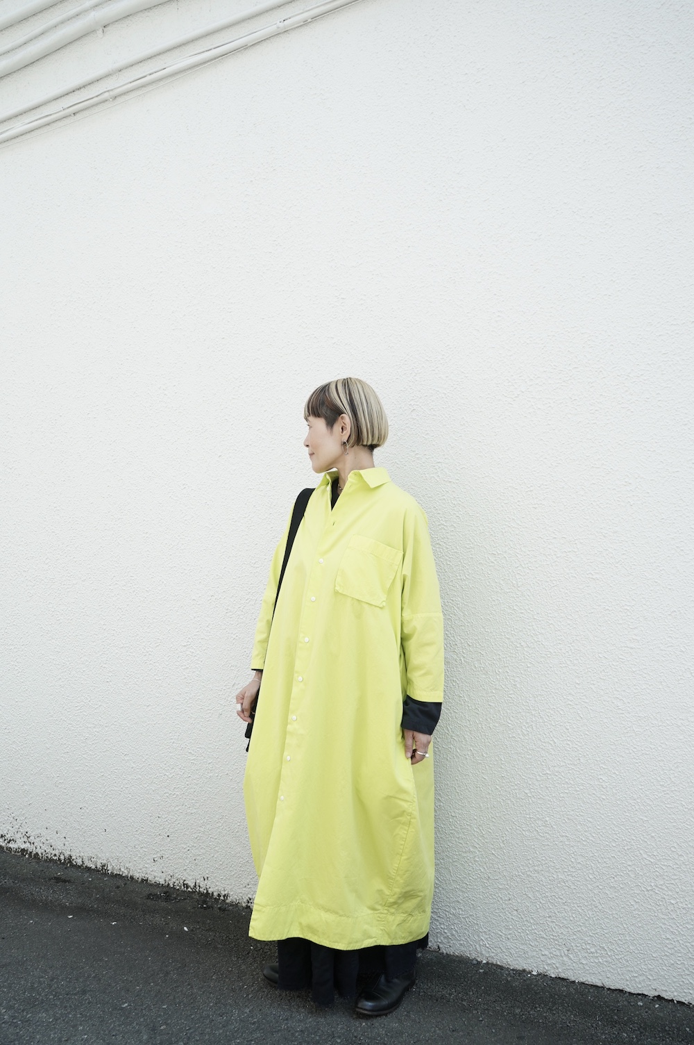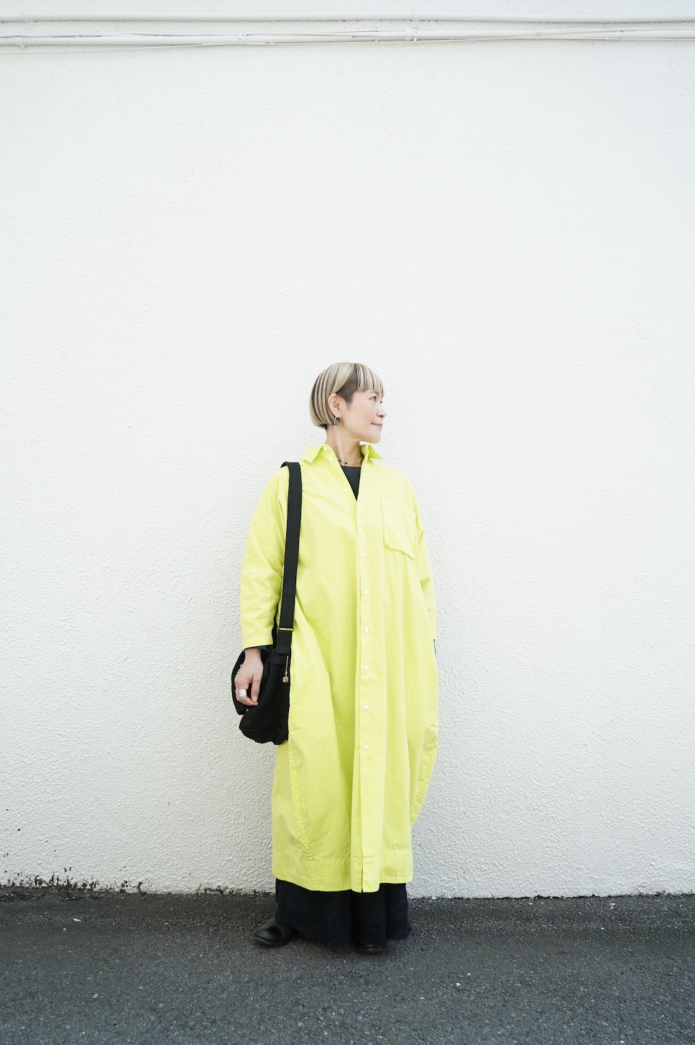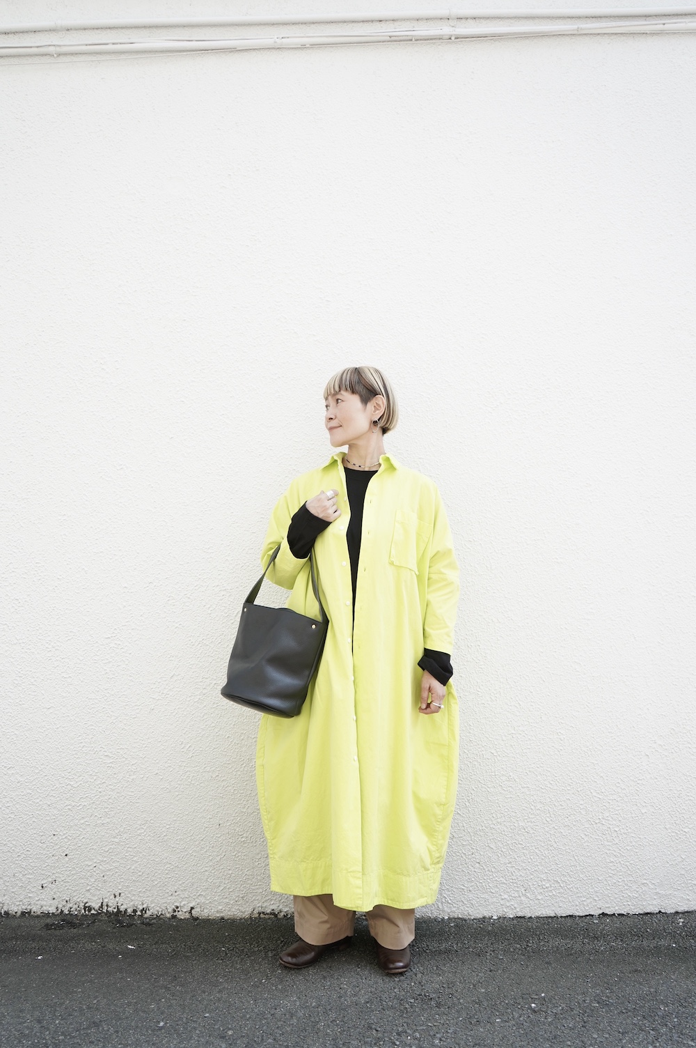 デザインは、レギュラーカラーを配したロングシャツワンピース。ヒップ〜裾にかけて丸みのあるバルーンシルエットになっています。肩周りはドロップショルダーになっており、身幅もゆとりがあり羽織りとしてコートのようにも着て頂きやすい。袖丈は手首が出る少し短め丈です。アウターのように羽織りとして、また冬は上にニットカーデやベストを組み合わせたり、レイヤードが楽しいロングシャツワンピースです。