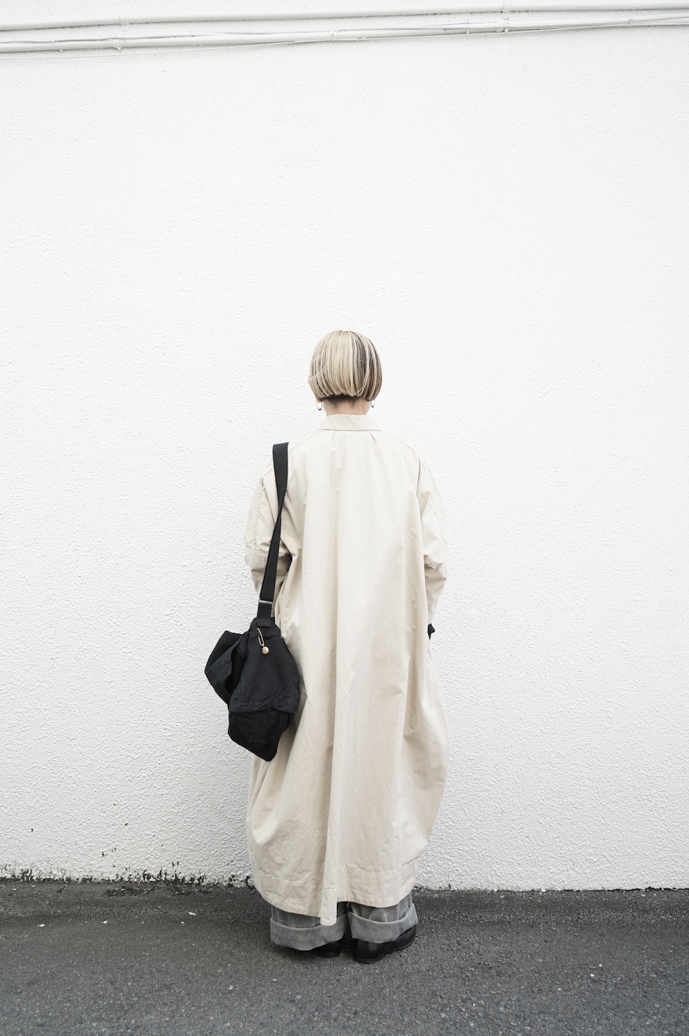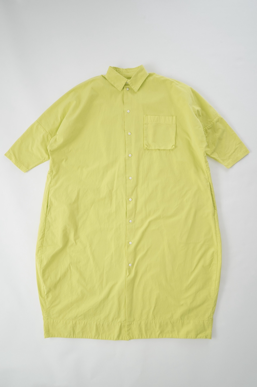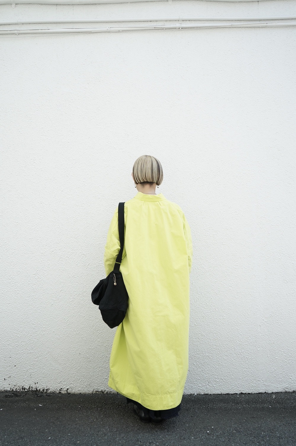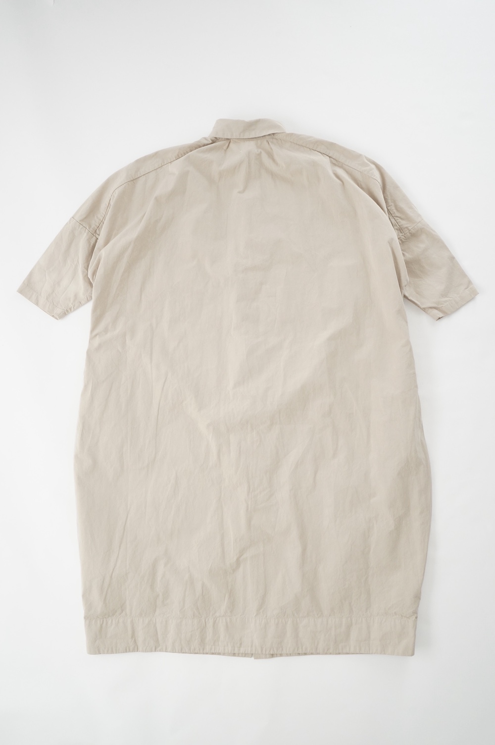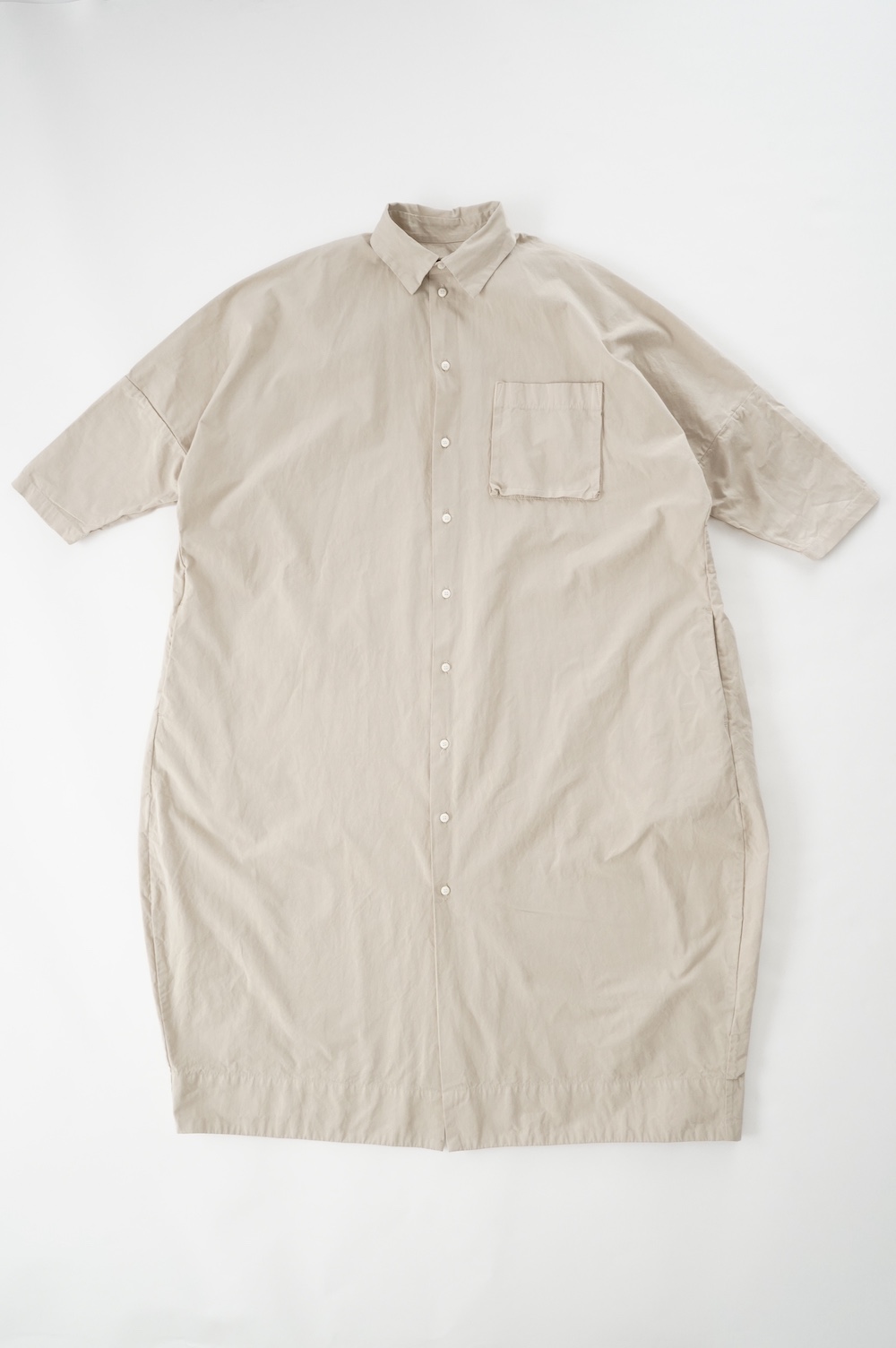 デザインは、レギュラーカラーを配したロングシャツワンピース。ヒップ〜裾にかけて丸みのあるバルーンシルエットになっています。肩周りはドロップショルダーになっており、身幅もゆとりがあり羽織りとしてコートのようにも着て頂きやすい。袖丈は手首が出る少し短め丈です。アウターのように羽織りとして、また冬は上にニットカーデやベストを組み合わせたり、レイヤードが楽しいロングシャツワンピースです。