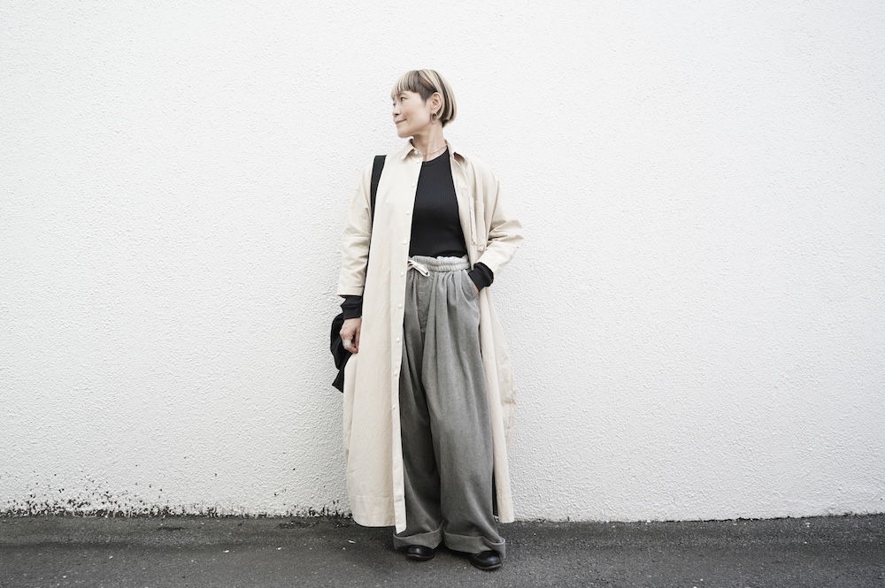 こちらもパンツスタイルに羽織って