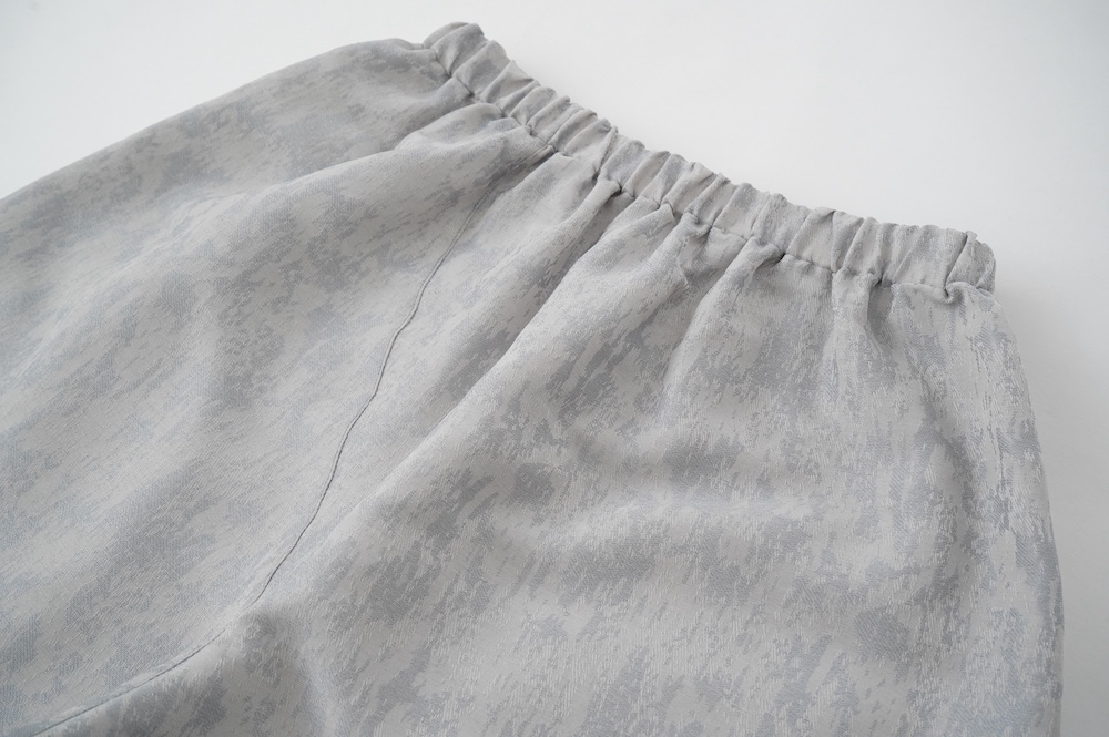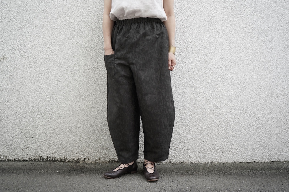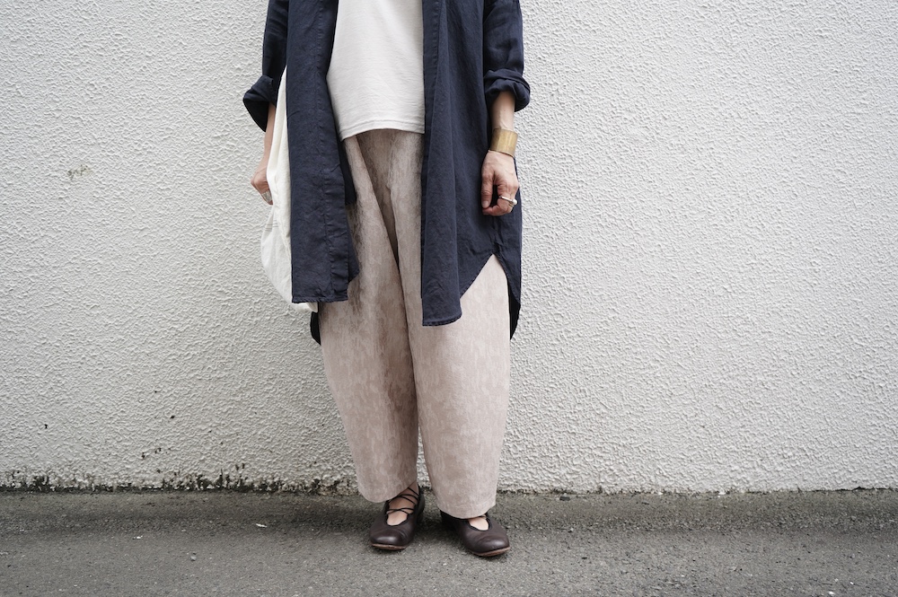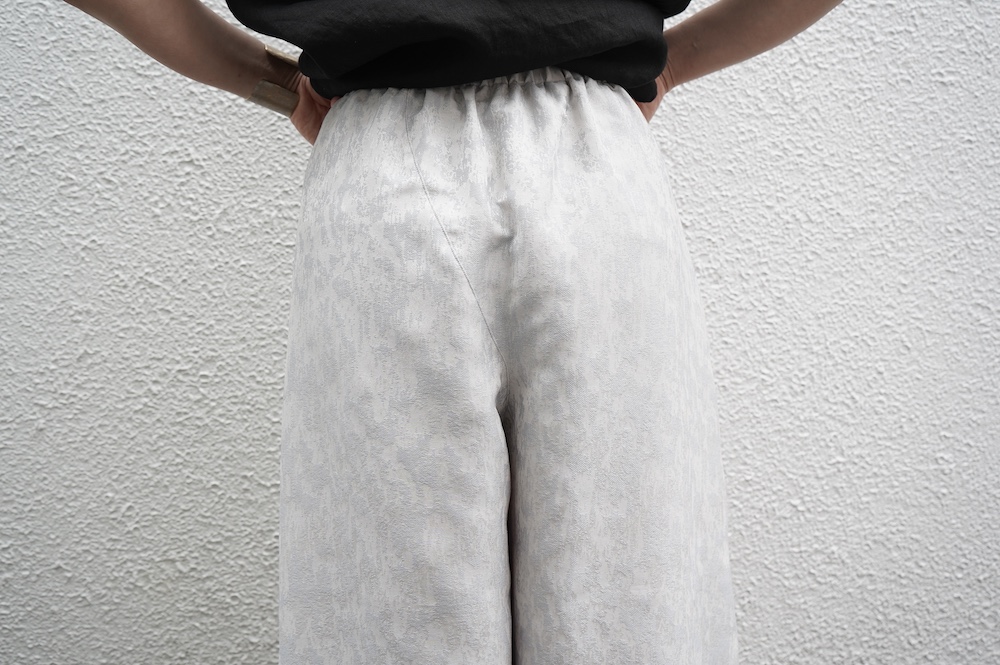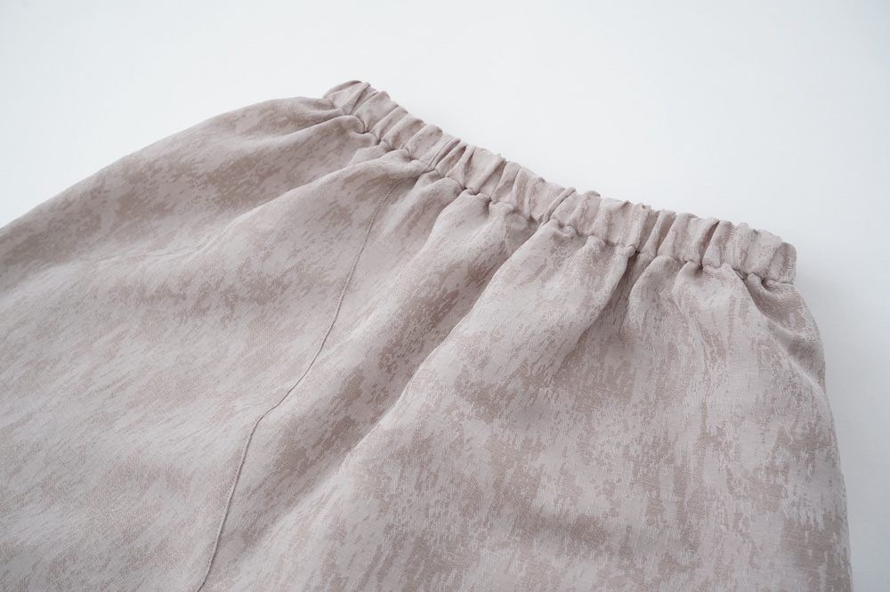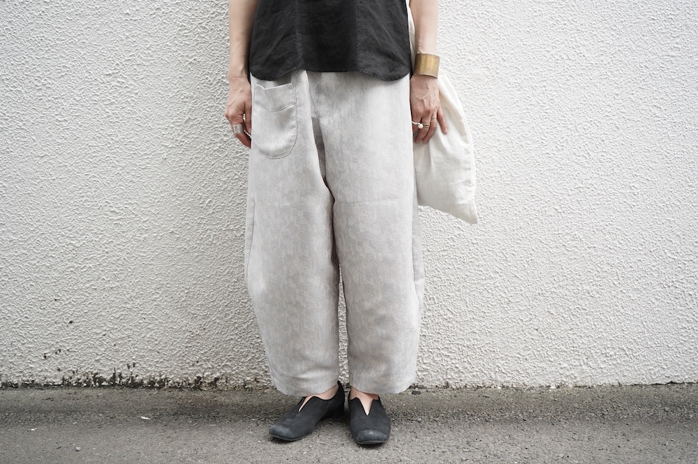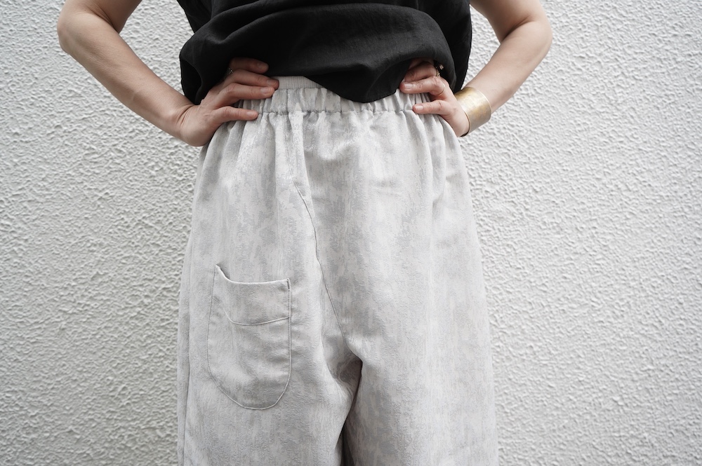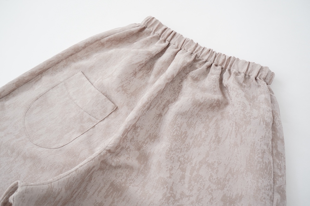 ユイのパンツ。ポリエステル100%のイージーケア素材でありながら、ナチュラルな雰囲気と表情のあるジャガード生地が特徴です。光沢感があり、独特なカスレ柄がさりげなく施されており、スタイリングのポイントになる柄生地です。