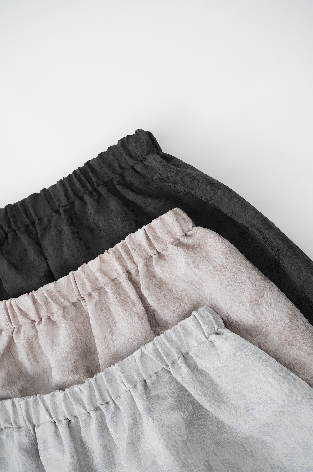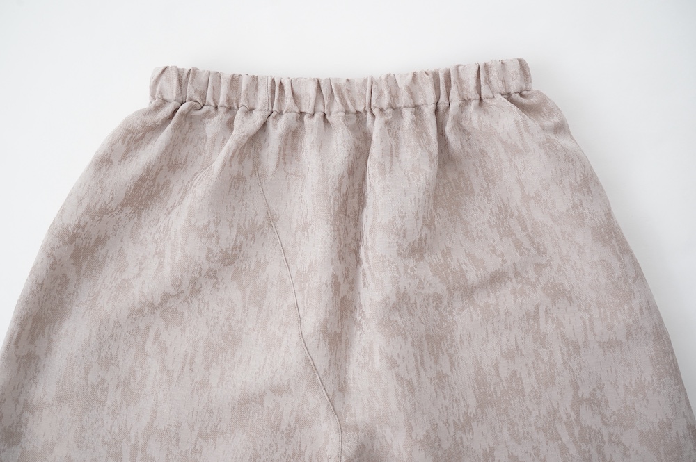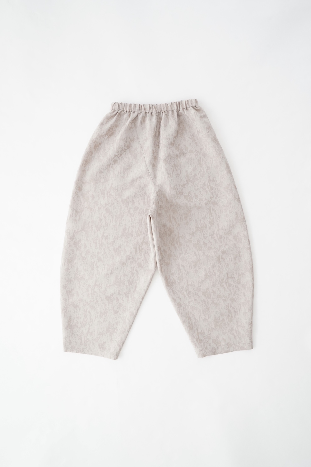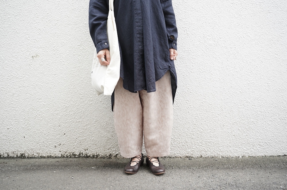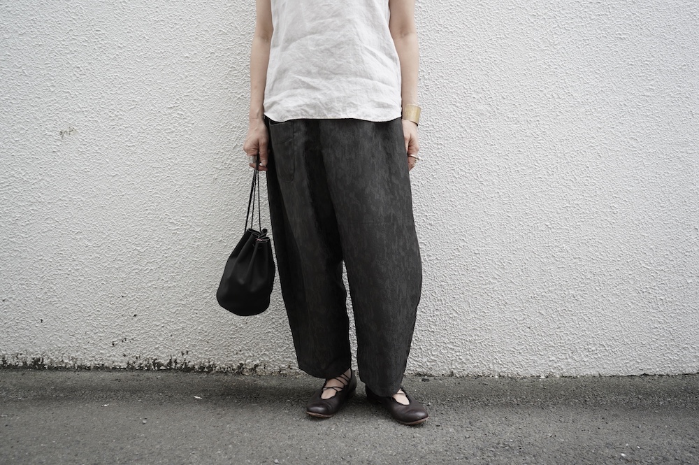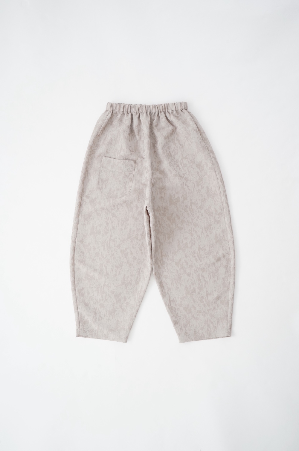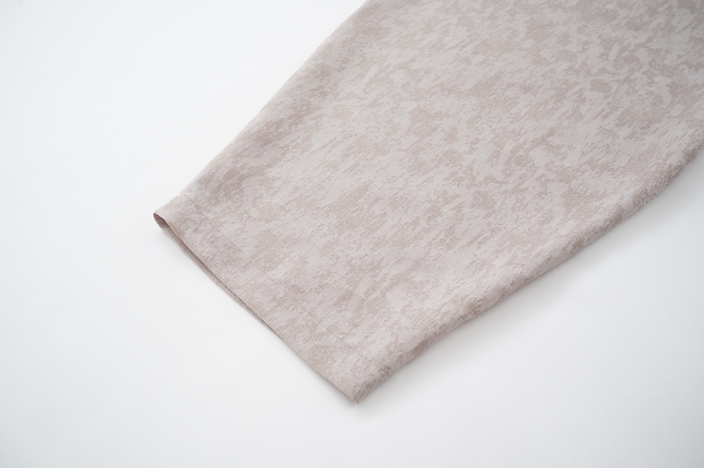 ユイのパンツ。ポリエステル100%のイージーケア素材でありながら、ナチュラルな雰囲気と表情のあるジャガード生地が特徴です。光沢感があり、独特なカスレ柄がさりげなく施されており、スタイリングのポイントになる柄生地です。