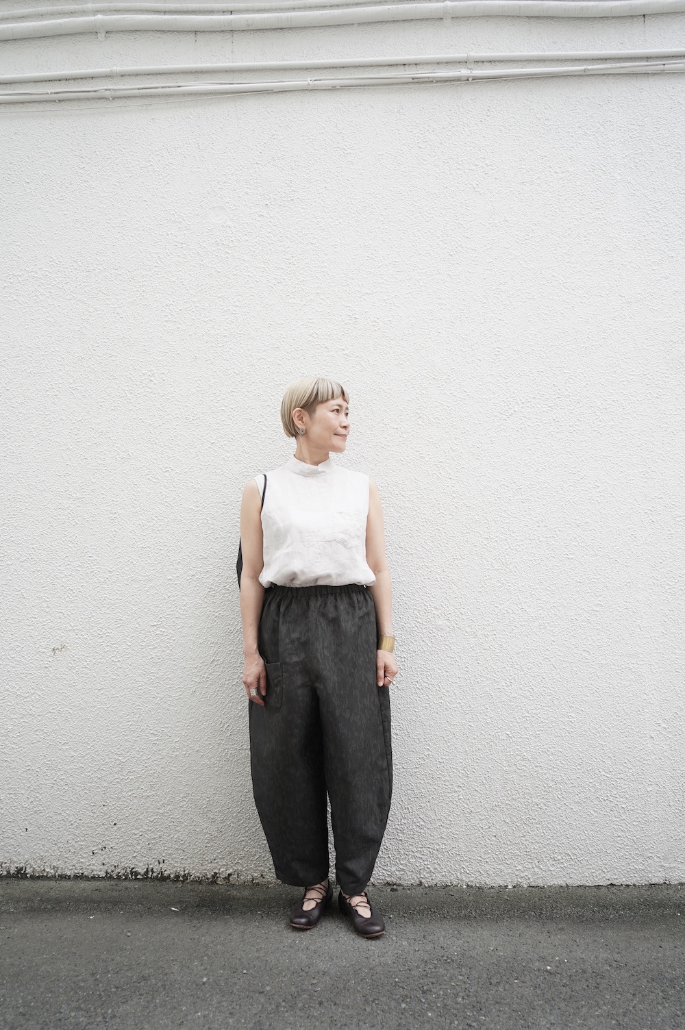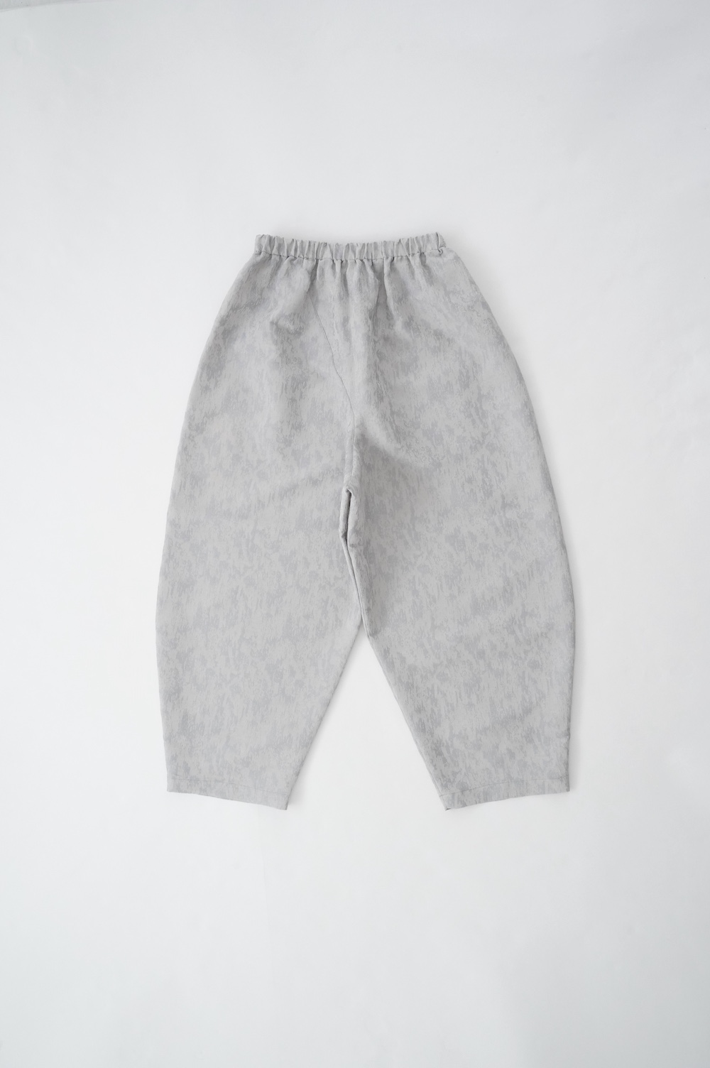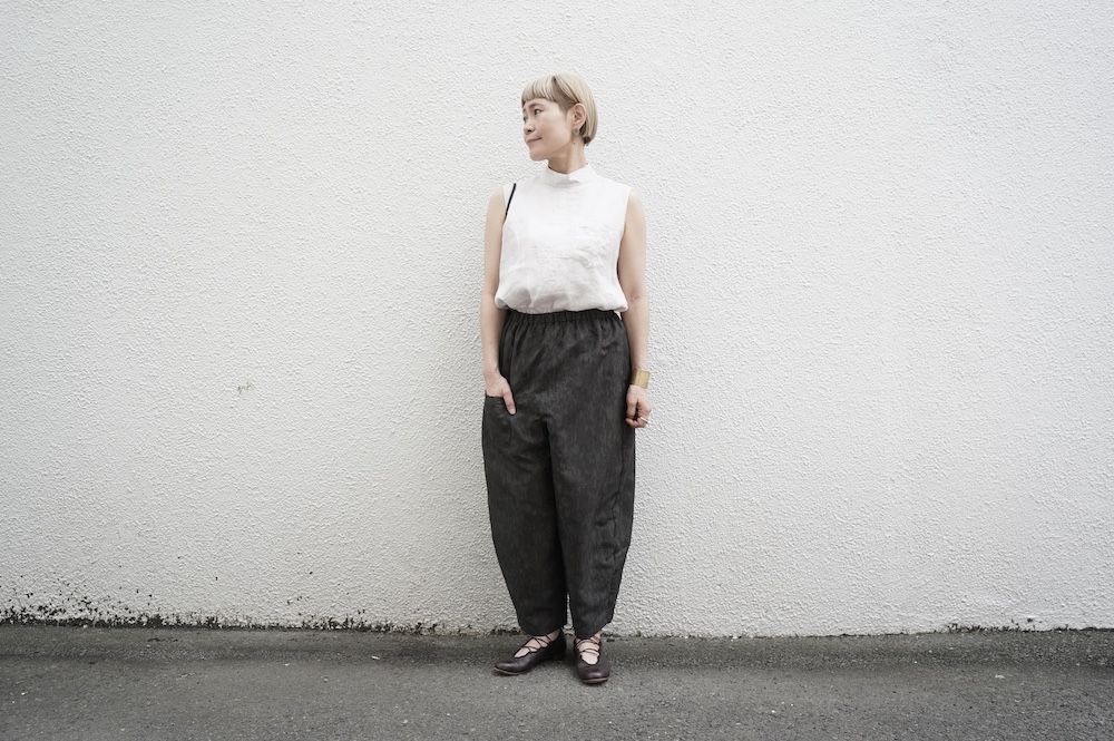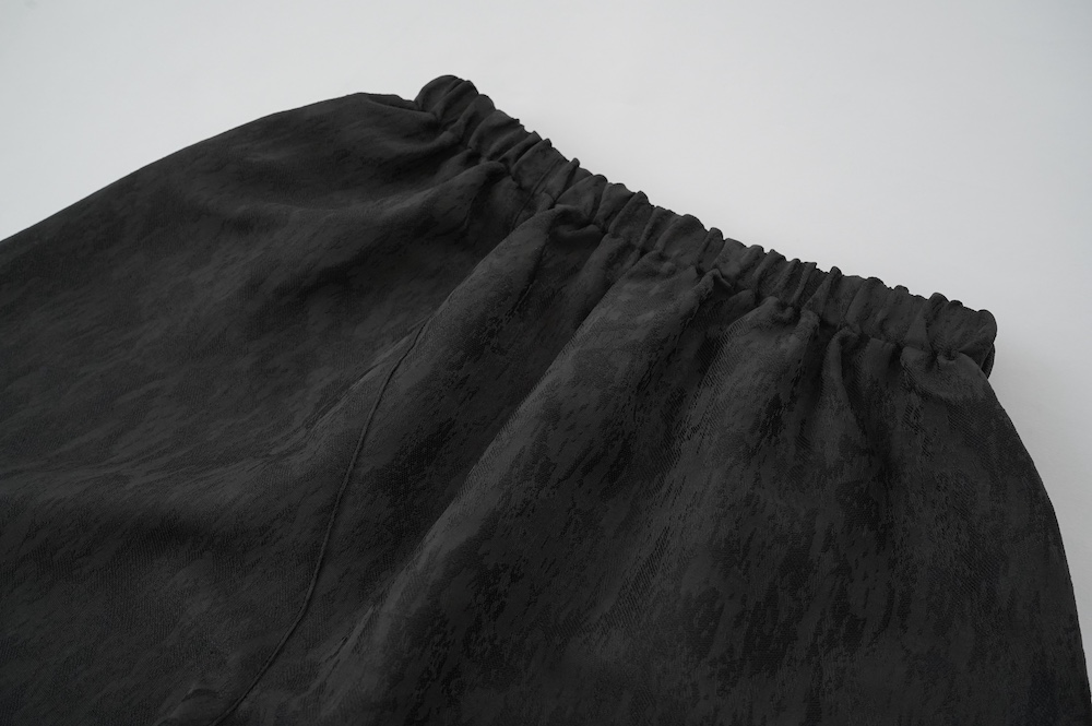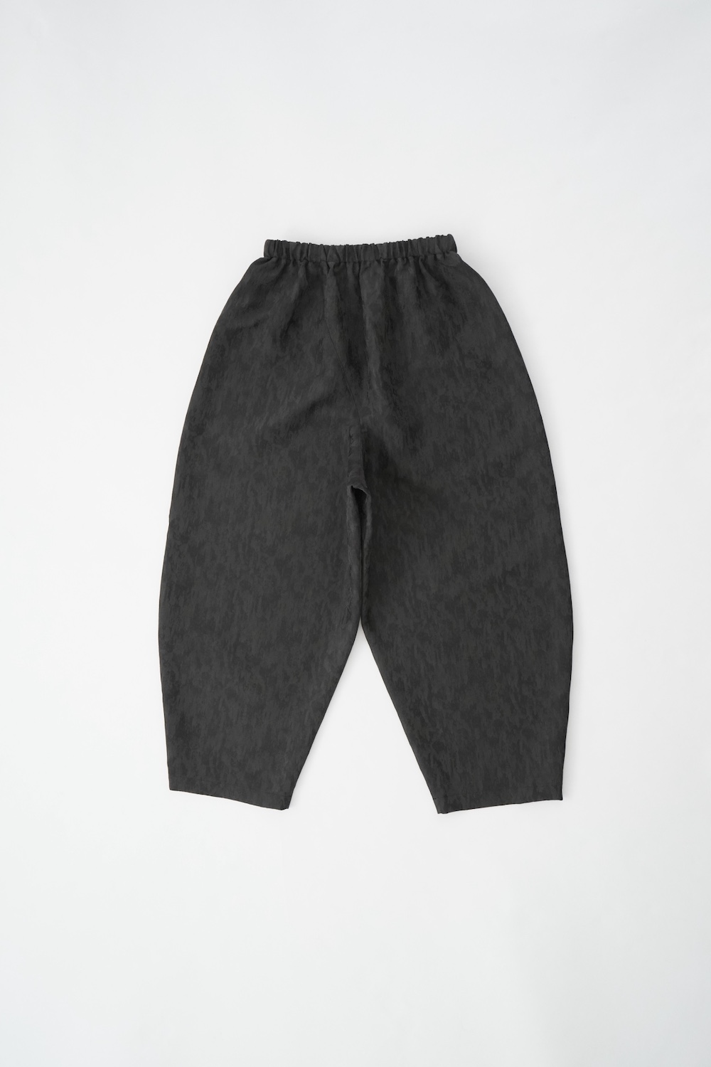 ユイのパンツ。ポリエステル100%のイージーケア素材でありながら、ナチュラルな雰囲気と表情のあるジャガード生地が特徴です。光沢感があり、独特なカスレ柄がさりげなく施されており、スタイリングのポイントになる柄生地です。