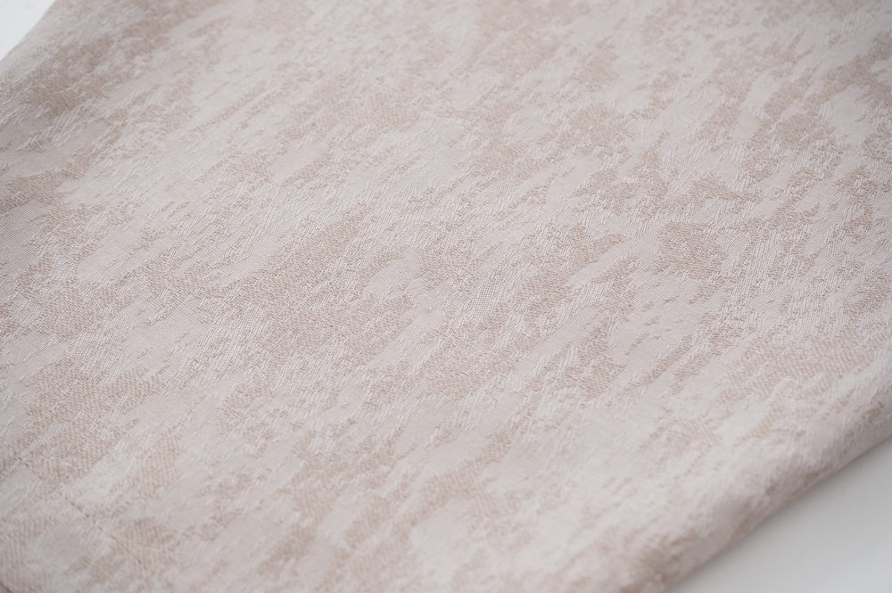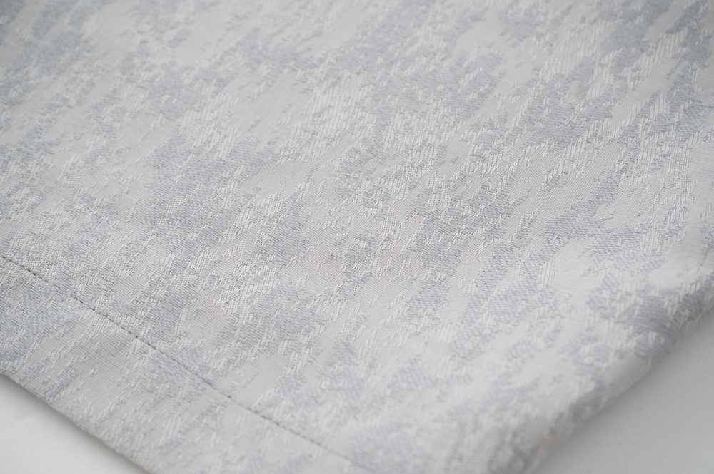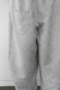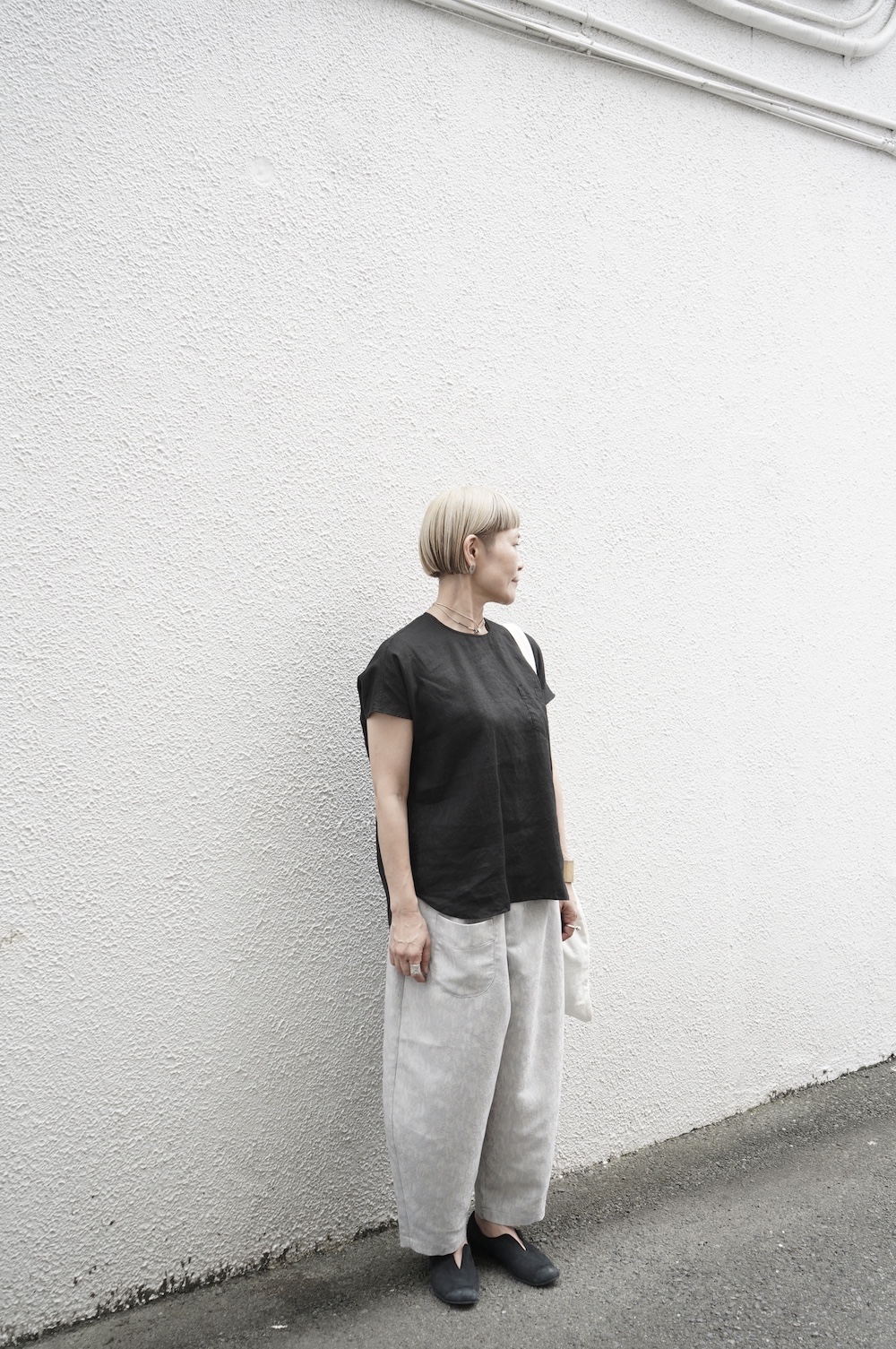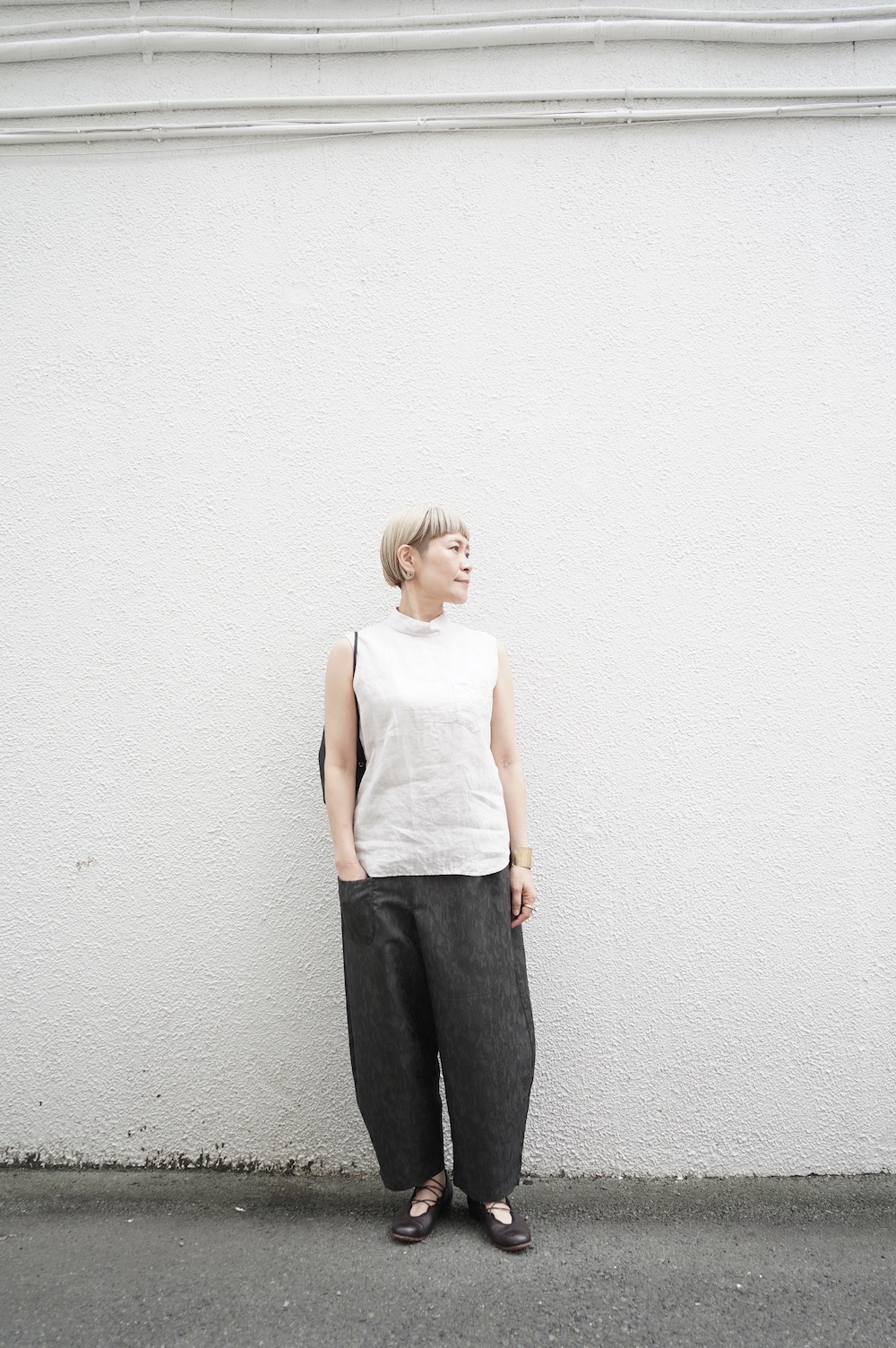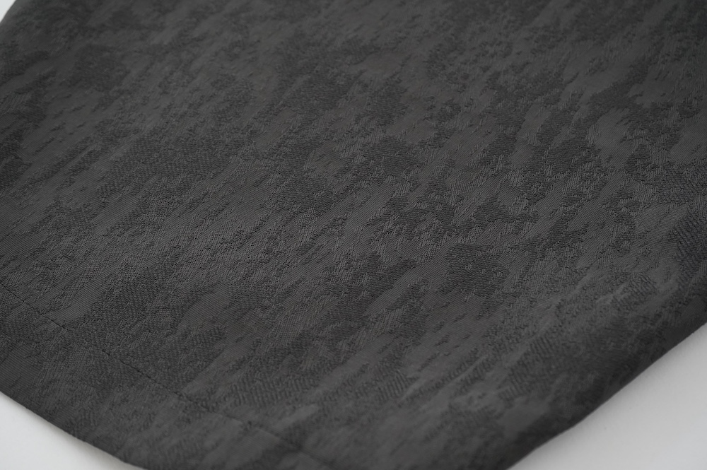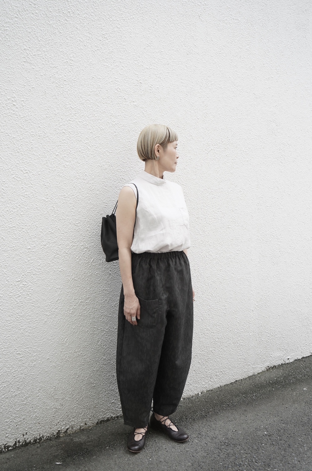 ユイのパンツ。ポリエステル100%のイージーケア素材でありながら、ナチュラルな雰囲気と表情のあるジャガード生地が特徴です。光沢感があり、独特なカスレ柄がさりげなく施されており、スタイリングのポイントになる柄生地です。