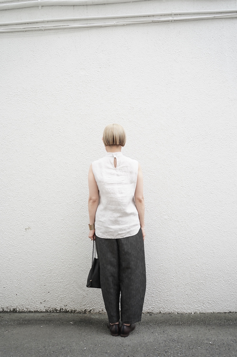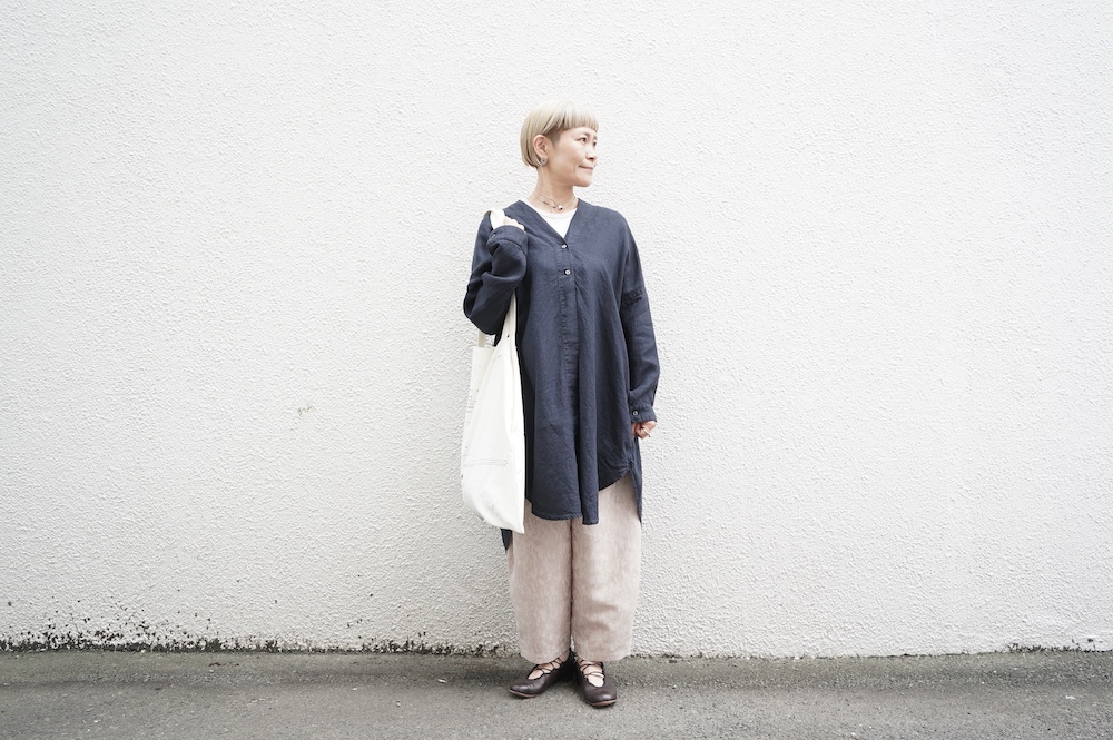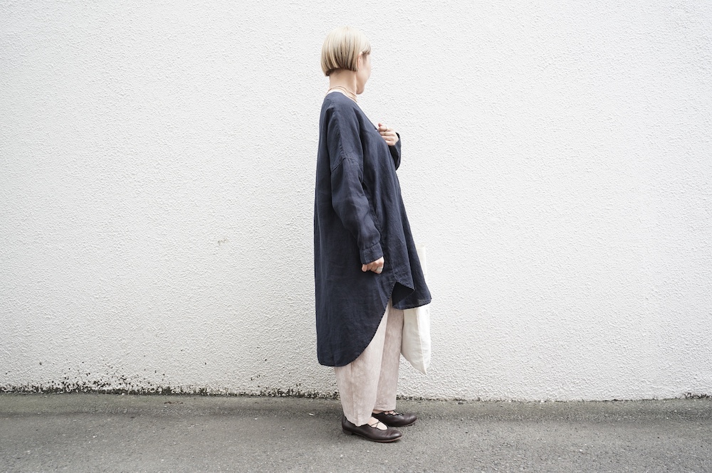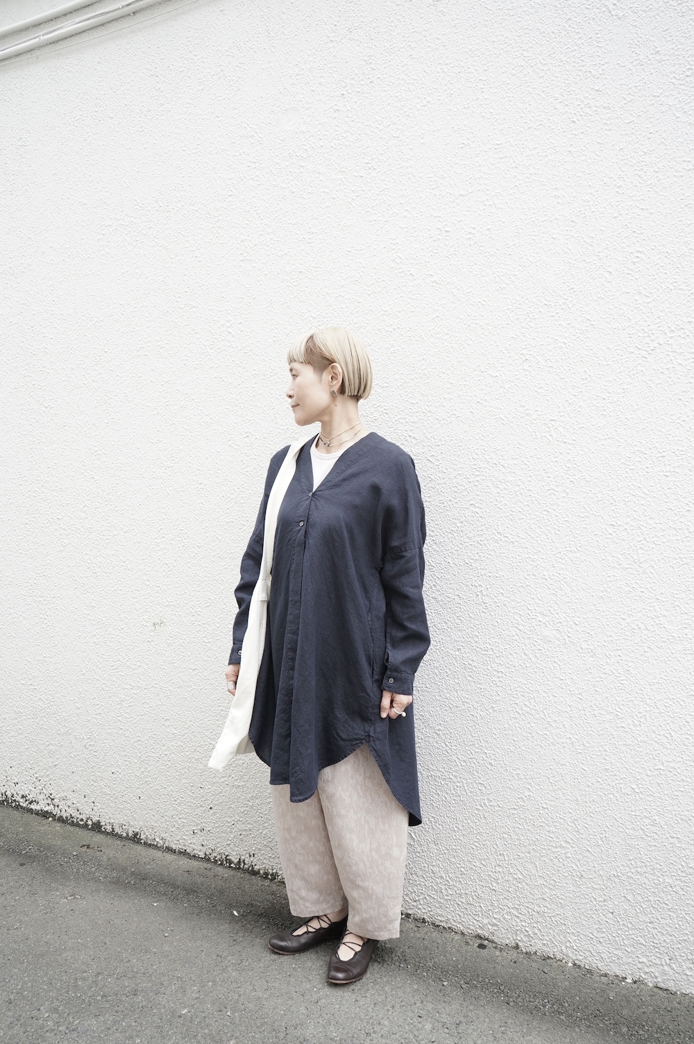 デザインは丸みのあるテーパードシルエットで、前後どちらを前にしても着用可能です。羽織ワンピースなどを重ねた際には、パッチポケットを前にしていただくとさりげなく便利です。透け感は多少ぼんやりと気にならない程度にございますので、ワンピースやチュニックなどの丈の長いものに合わせていただくのがメインですが、両色とも短いトップスでのスタイリングで撮影もしておりますので、ぜひ参考にしてみてください。