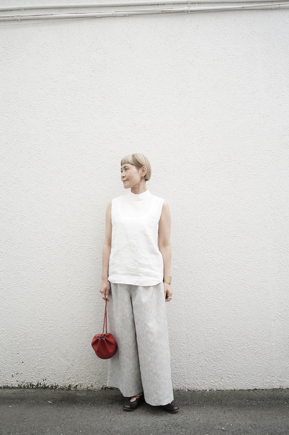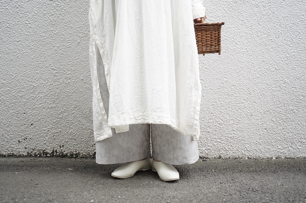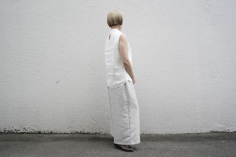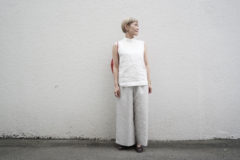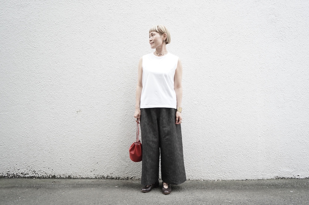 デザインはシンプルなワイドシルエットで、重ね着に便利に使っていただくことを目指して誕生したパンツです。このワイドシルエットは昨年からの新型です。パッチポケットが使用しやすいよう前後どちらを前にしても着用可能です。ワンピースやチュニックなどの丈の長いものに合わせていただくのがメインとして、撮影ではブラウスなども合わせていますので、そちらをぜひ参考にご覧ください。透け感は我々の感覚ではほとんど気にならないと思いますが、自然光でよくよく見て、ぼんやりとシルエットがわかるかどうか程度です。ぜひ普通の着丈にもラフに合わせてお使いください。