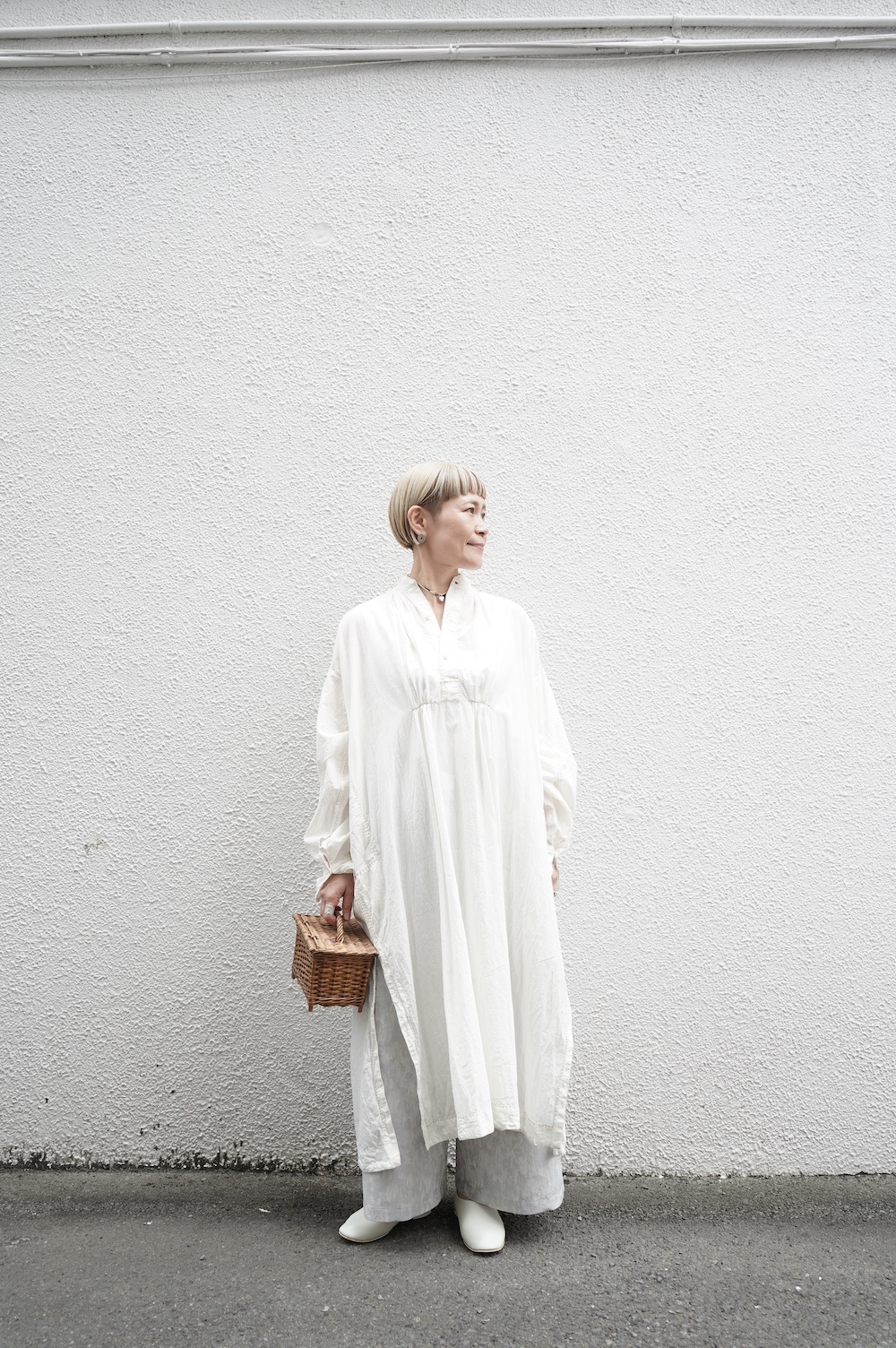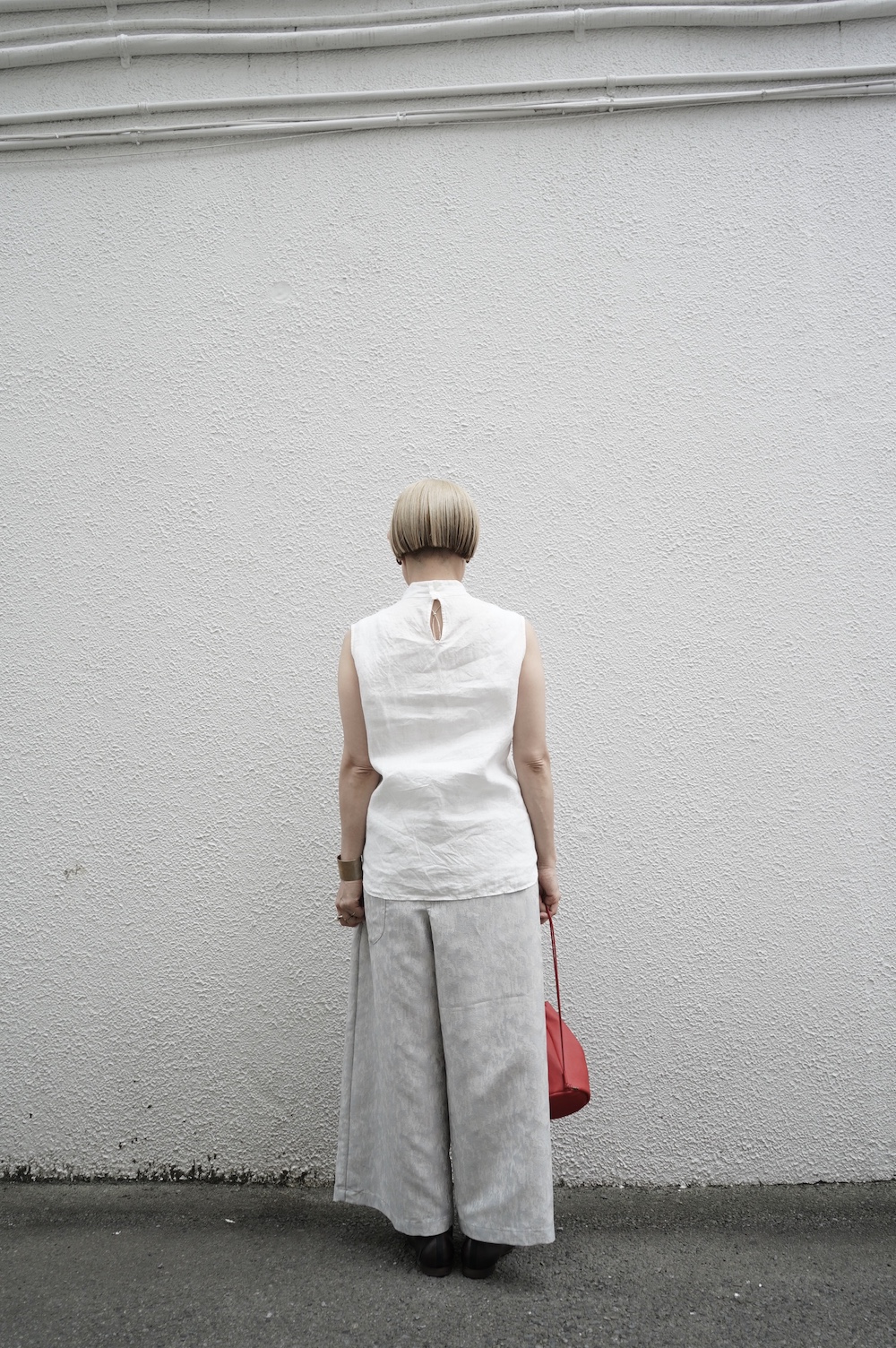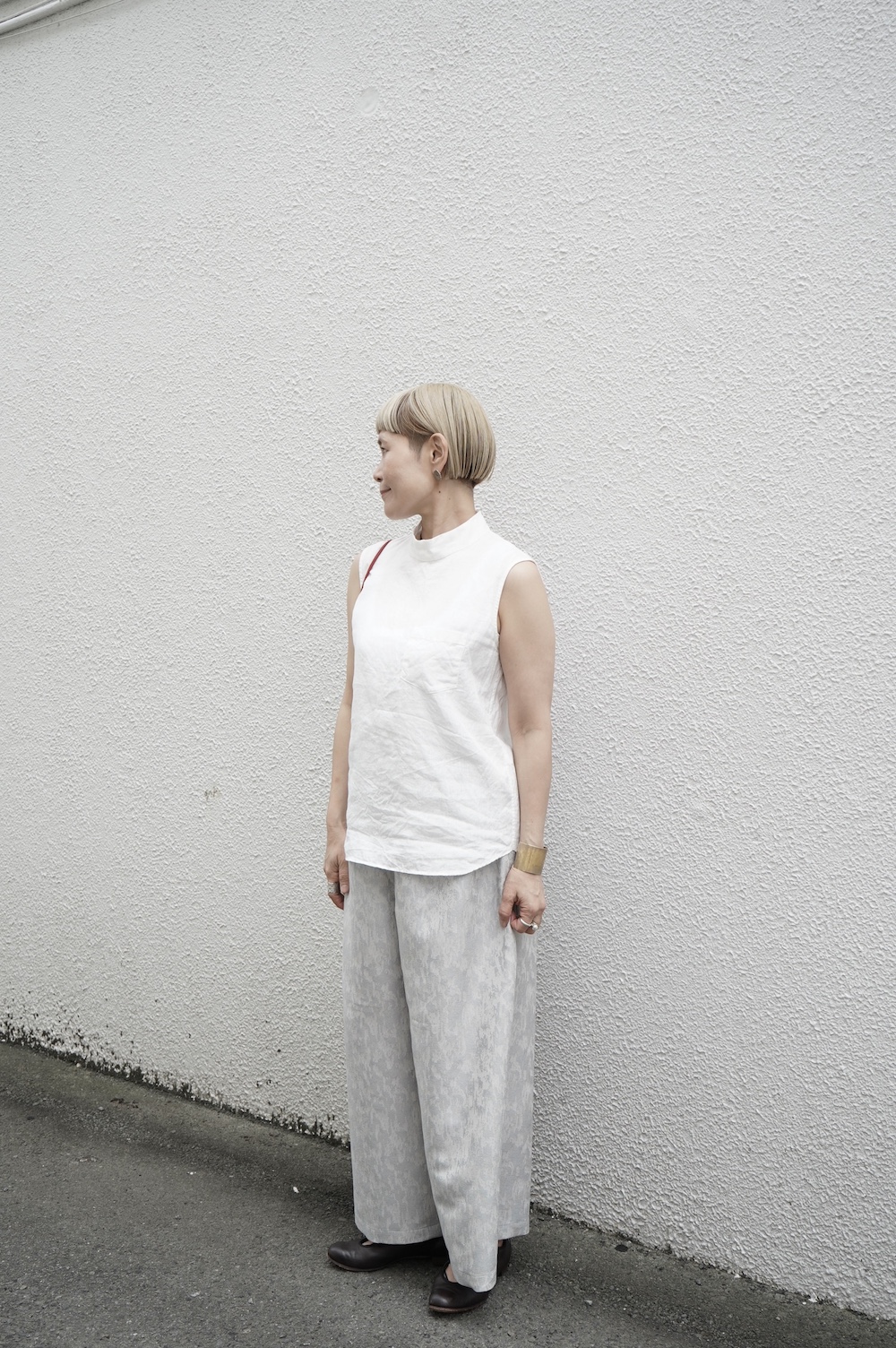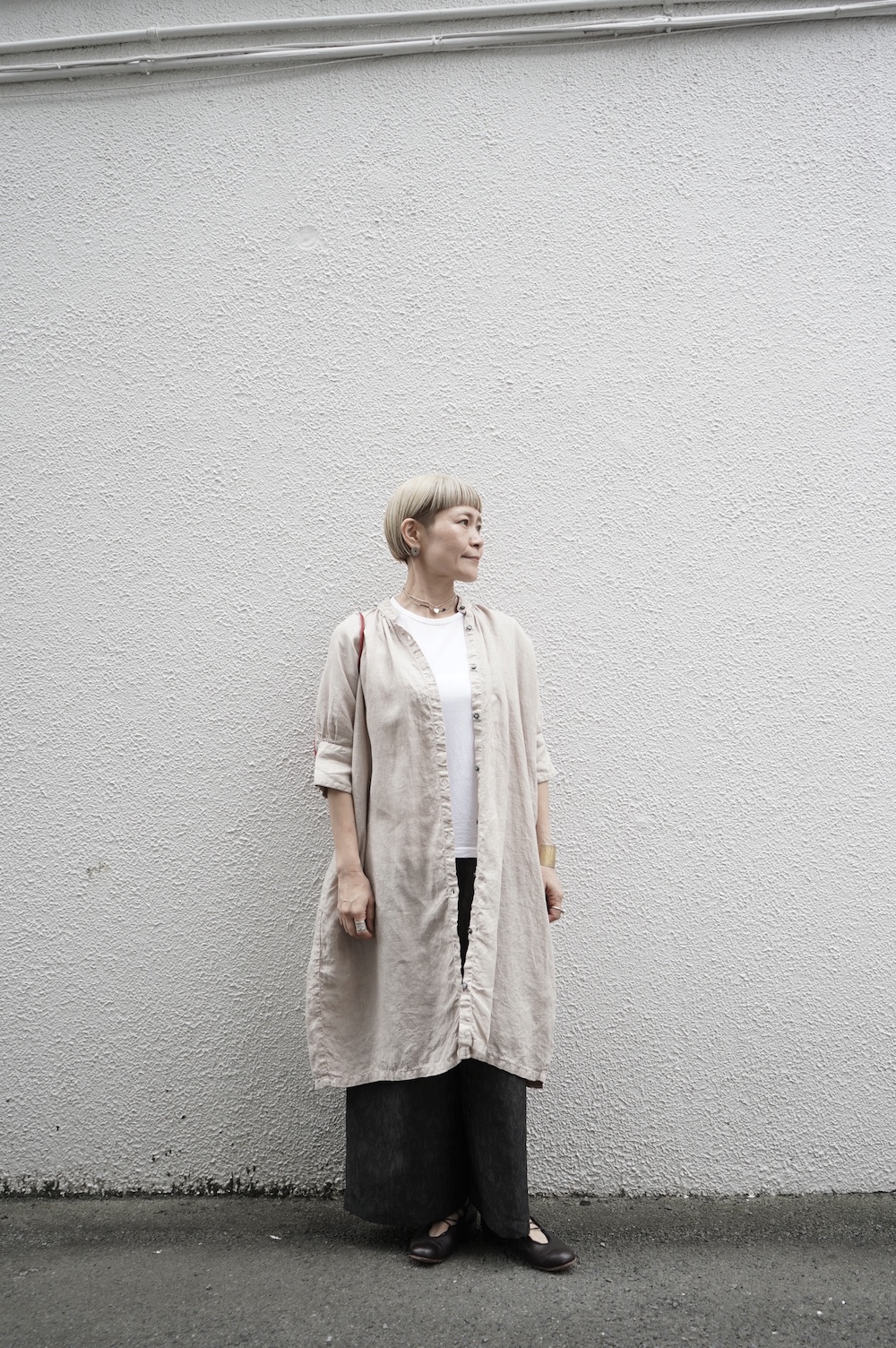 デザインはシンプルなワイドシルエットで、重ね着に便利に使っていただくことを目指して誕生したパンツです。このワイドシルエットは昨年からの新型です。パッチポケットが使用しやすいよう前後どちらを前にしても着用可能です。ワンピースやチュニックなどの丈の長いものに合わせていただくのがメインとして、撮影ではブラウスなども合わせていますので、そちらをぜひ参考にご覧ください。透け感は我々の感覚ではほとんど気にならないと思いますが、自然光でよくよく見て、ぼんやりとシルエットがわかるかどうか程度です。ぜひ普通の着丈にもラフに合わせてお使いください。