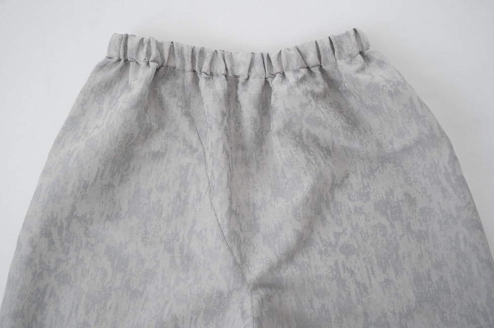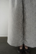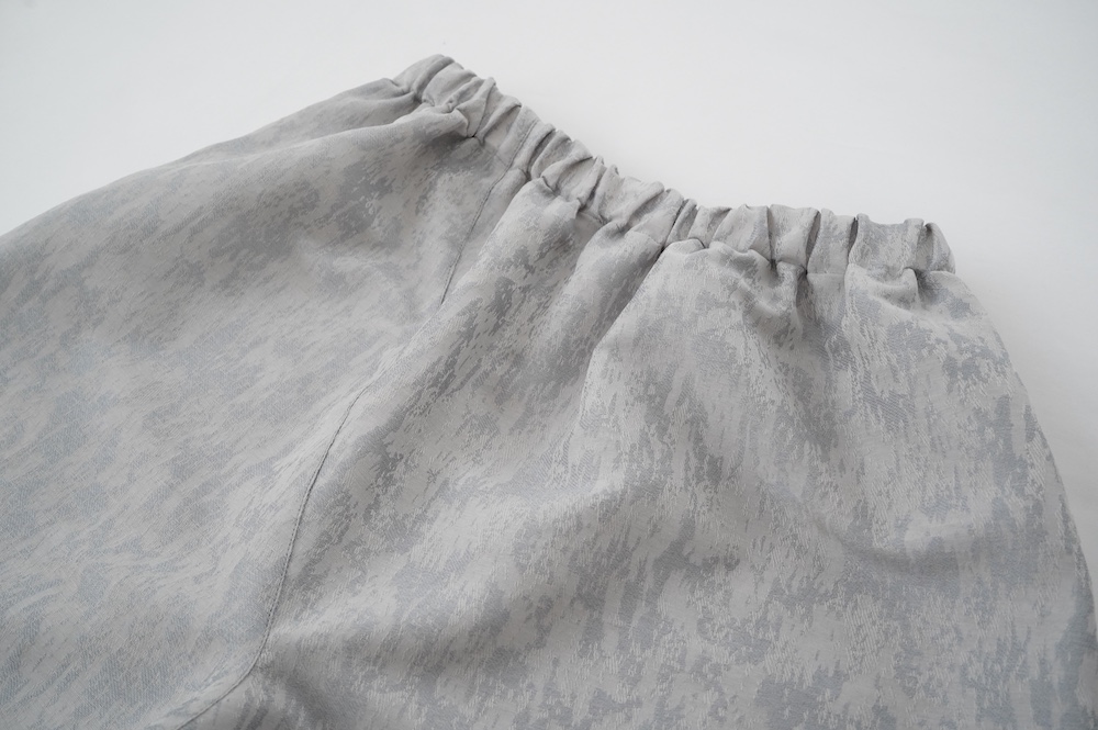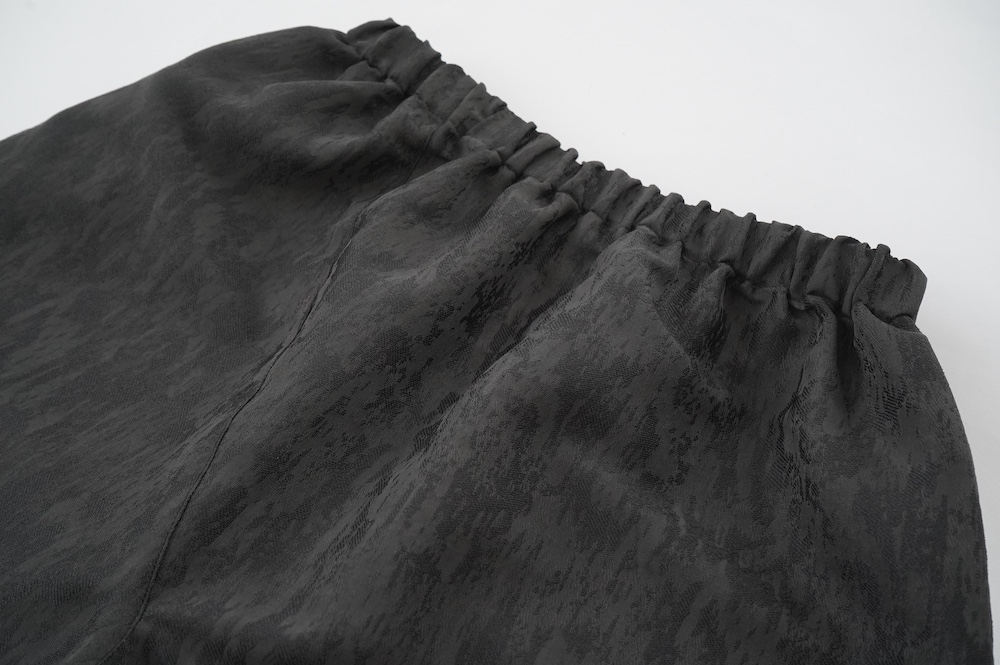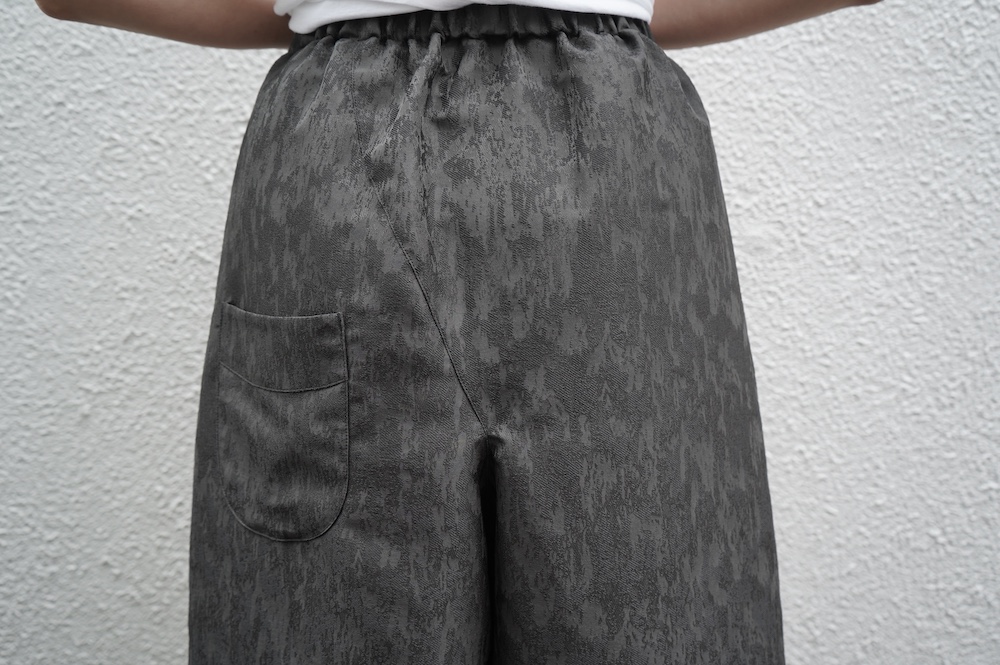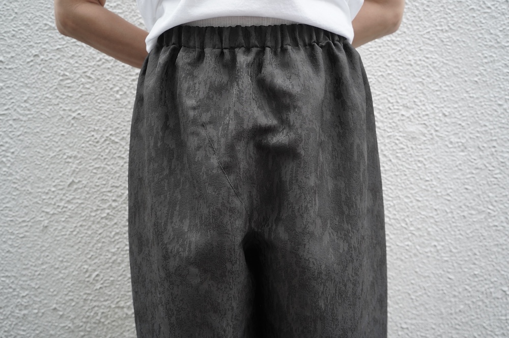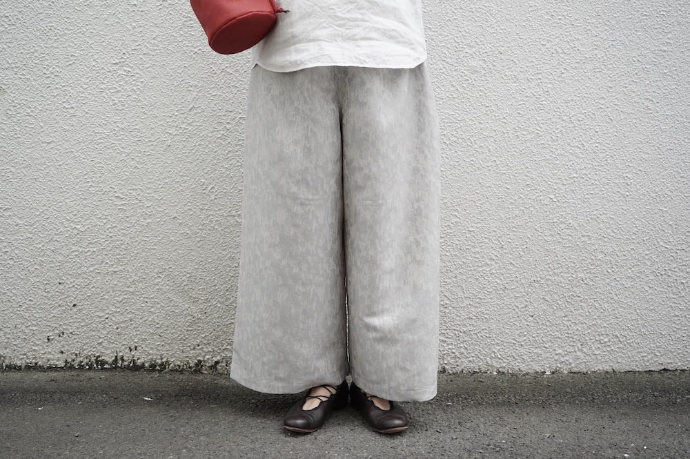 ユイのパンツ。ポリエステル100%のイージーケア素材でありながら、ナチュラルな天然素材とも相性の良いジャガード生地を使用しています。光沢感があり、独特なかすれ柄がさりげなく施されており、スタイリングに馴染みのいい素材です。