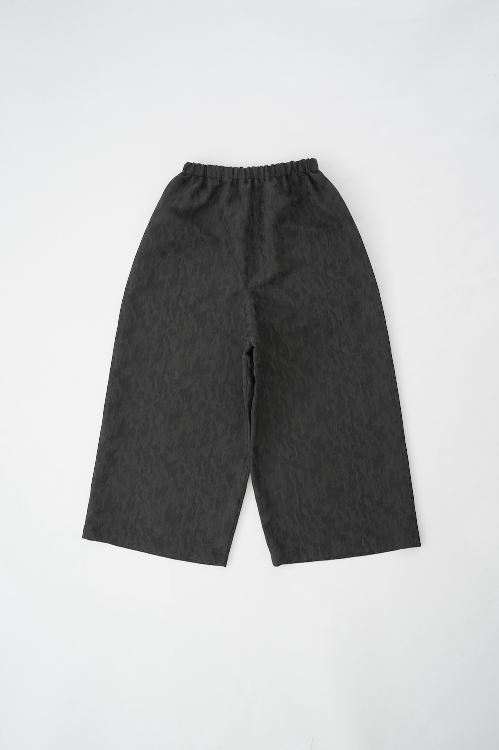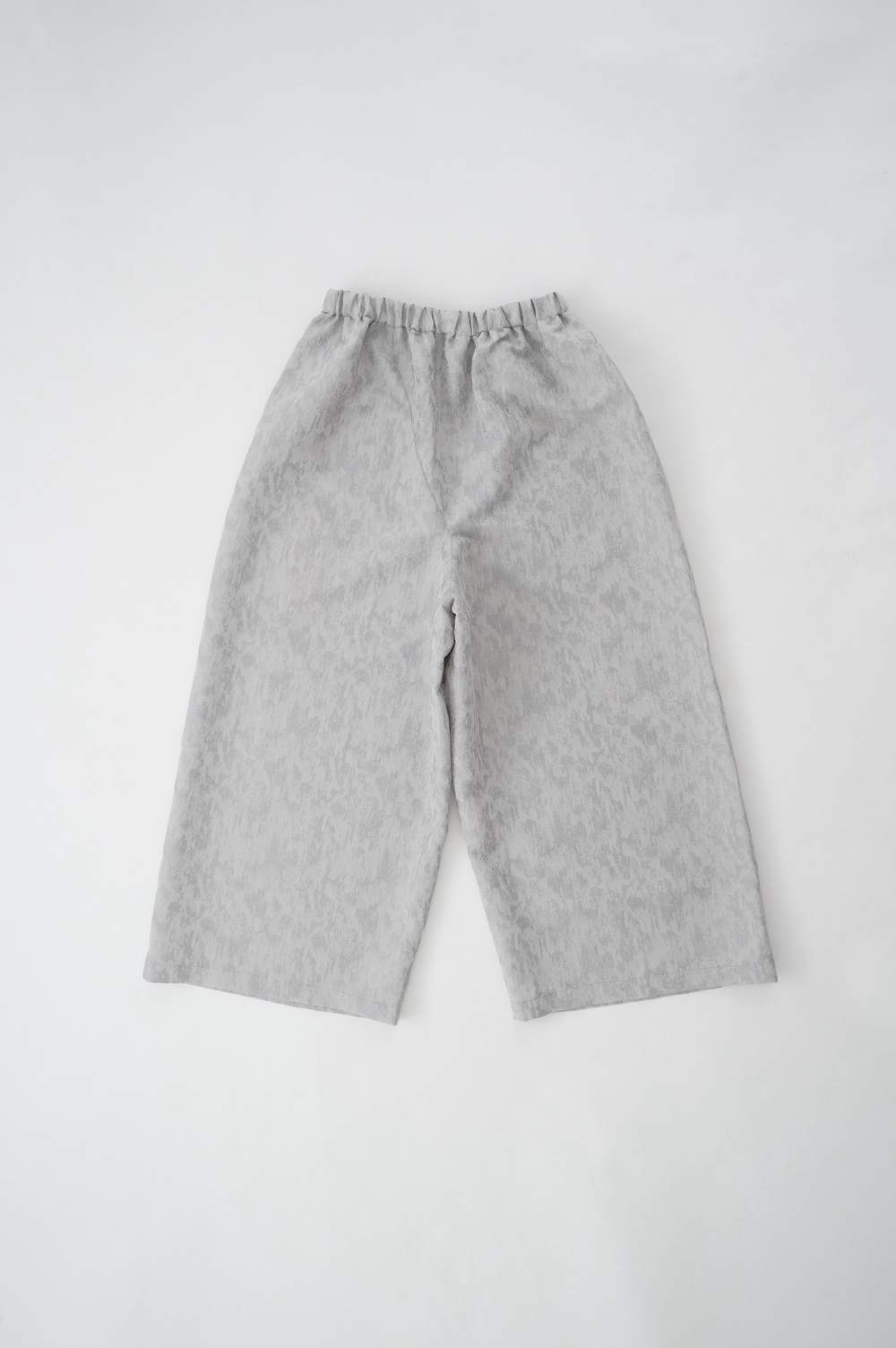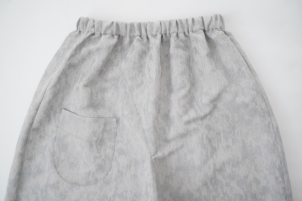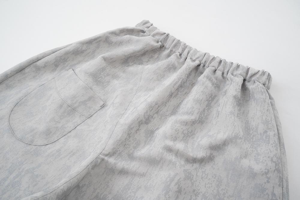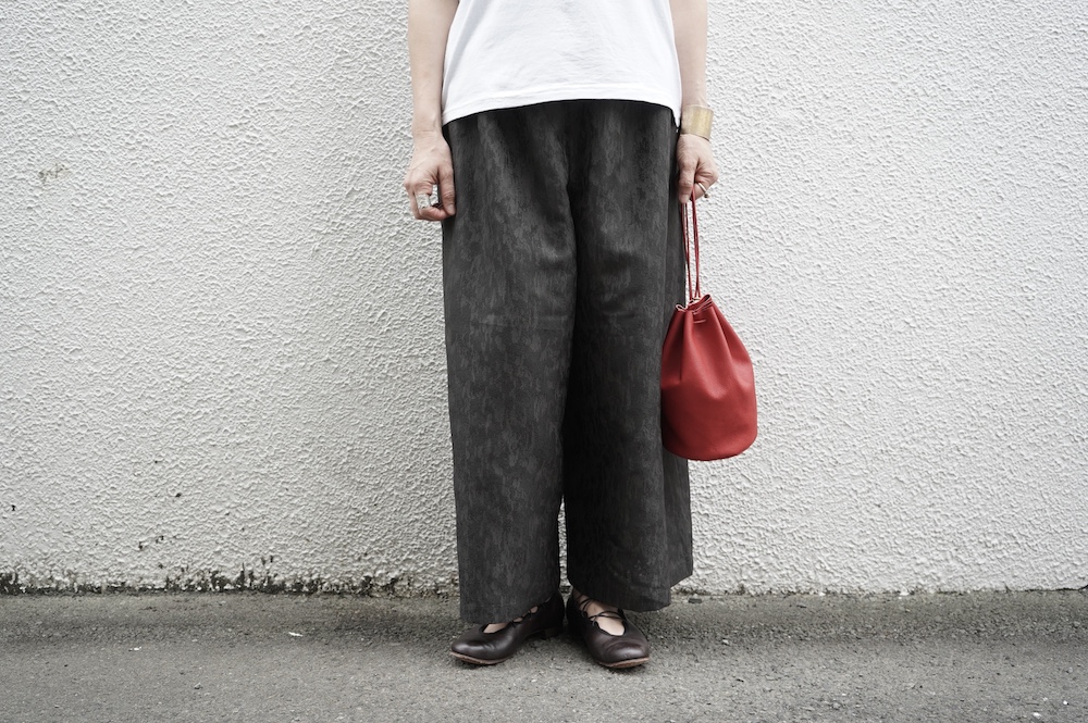 ユイのパンツ。ポリエステル100%のイージーケア素材でありながら、ナチュラルな天然素材とも相性の良いジャガード生地を使用しています。光沢感があり、独特なかすれ柄がさりげなく施されており、スタイリングに馴染みのいい素材です。