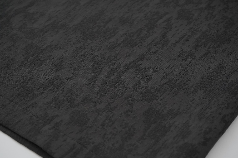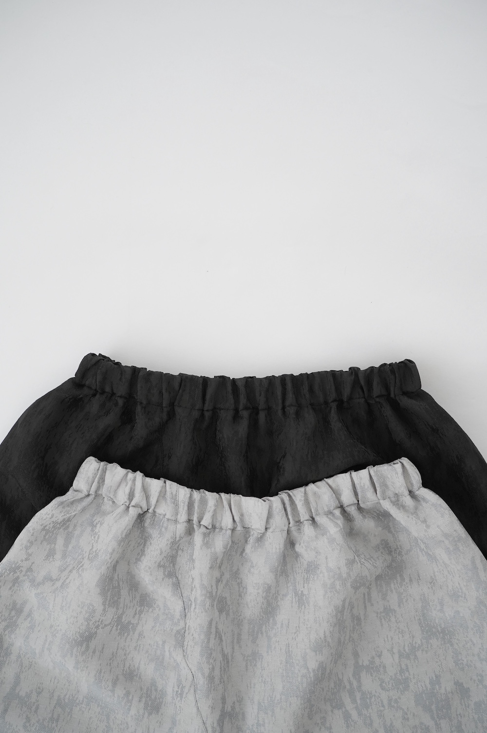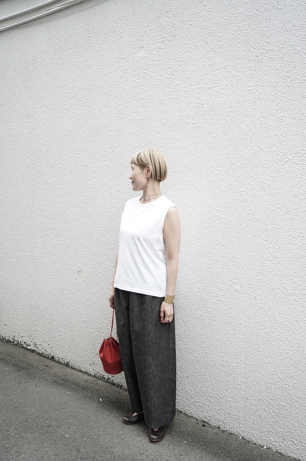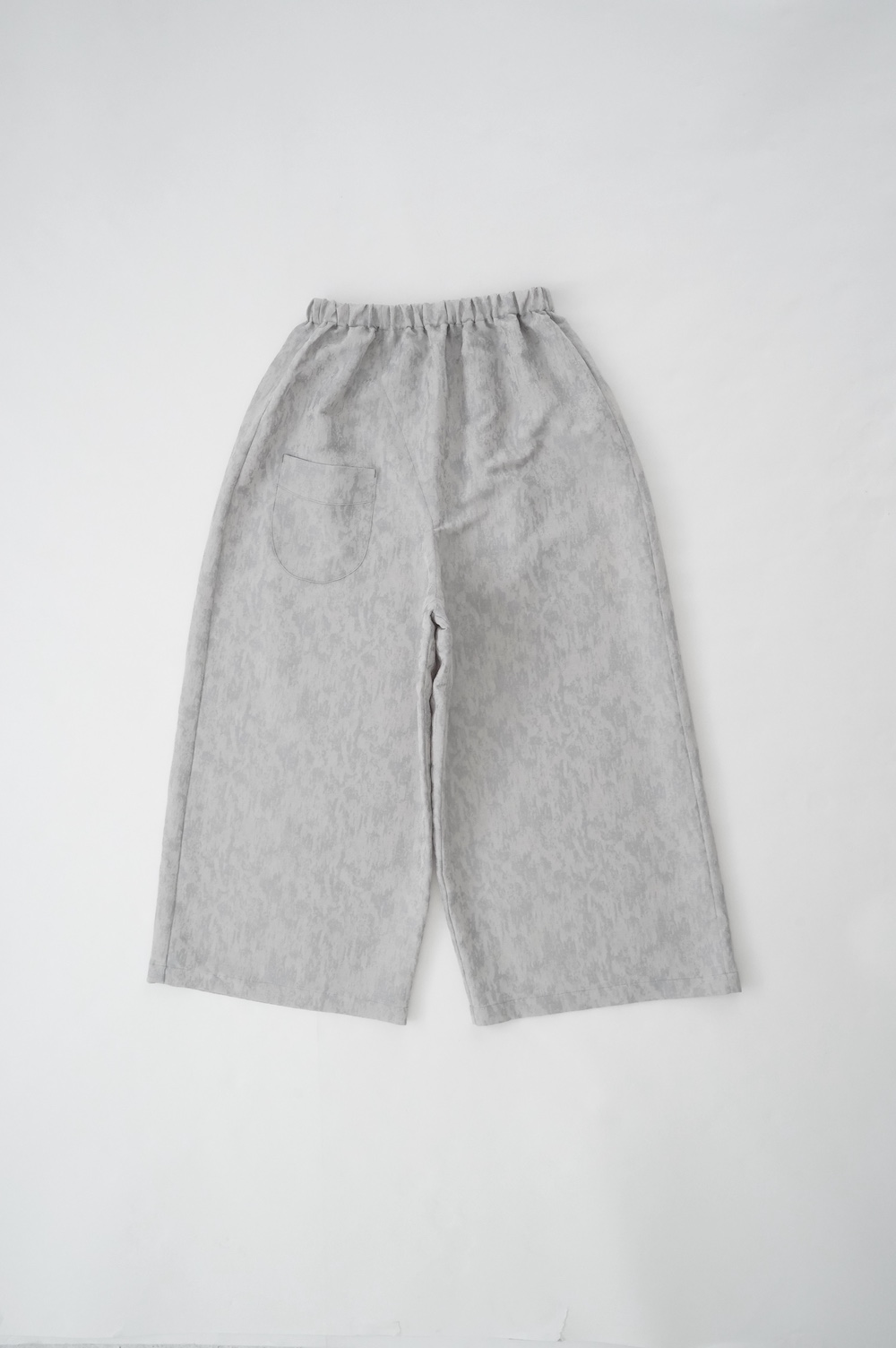 ユイのパンツ。ポリエステル100%のイージーケア素材でありながら、ナチュラルな天然素材とも相性の良いジャガード生地を使用しています。光沢感があり、独特なかすれ柄がさりげなく施されており、スタイリングに馴染みのいい素材です。