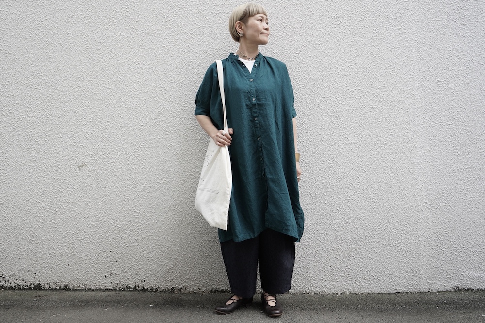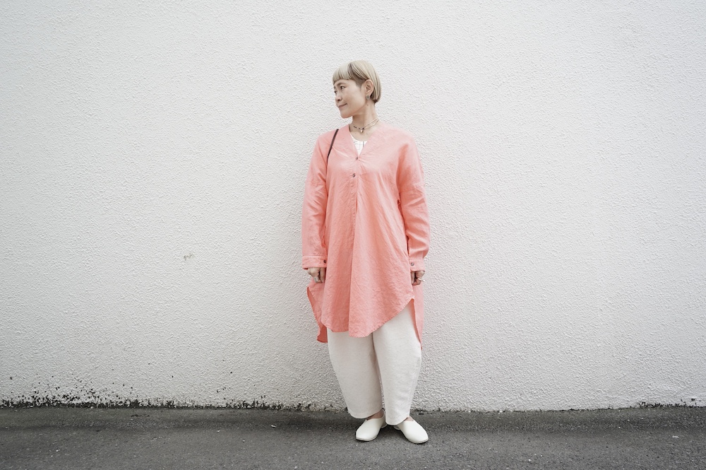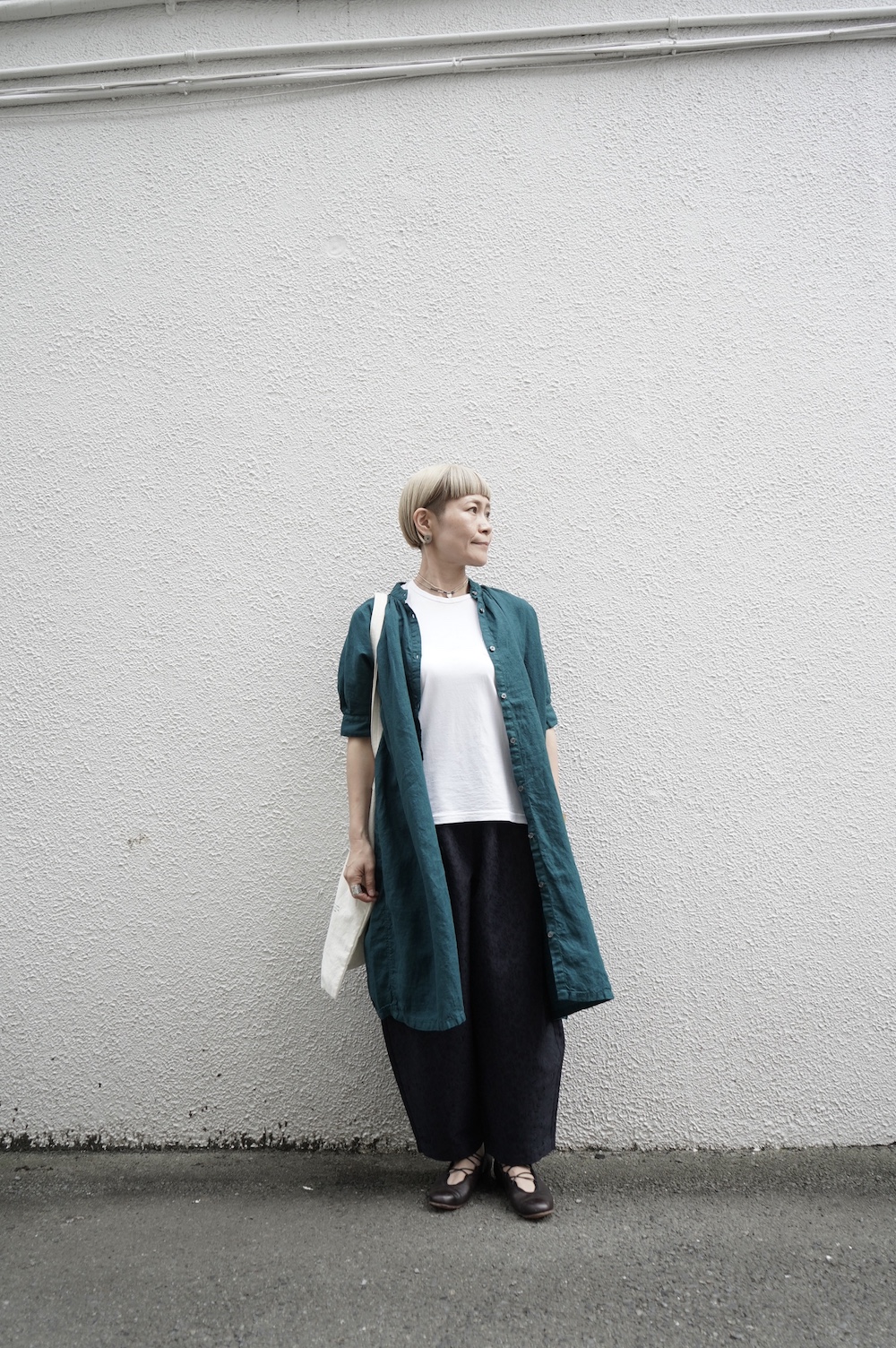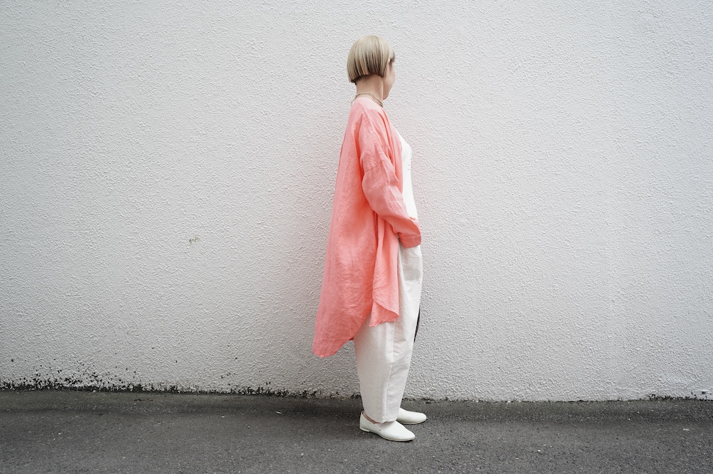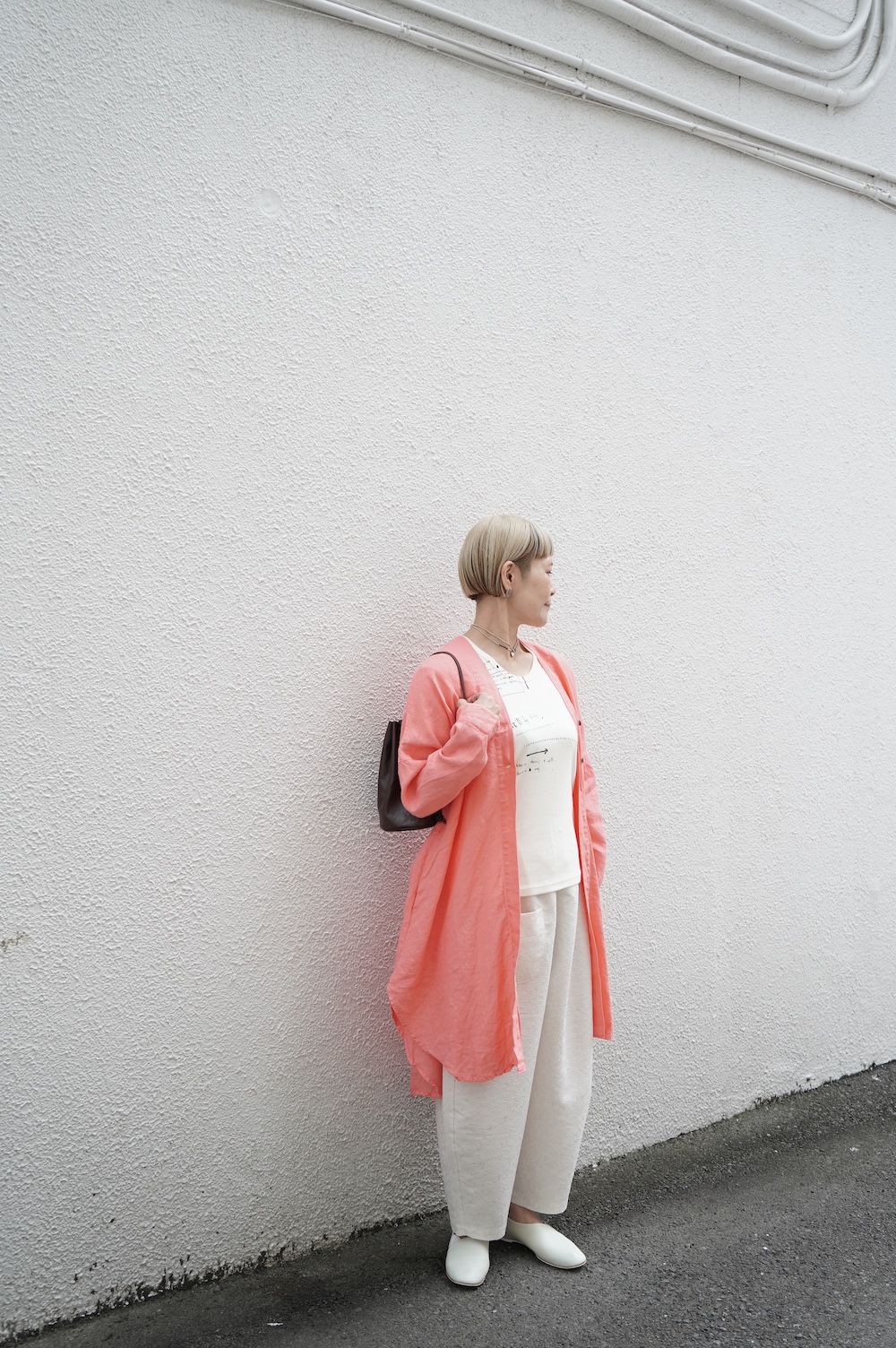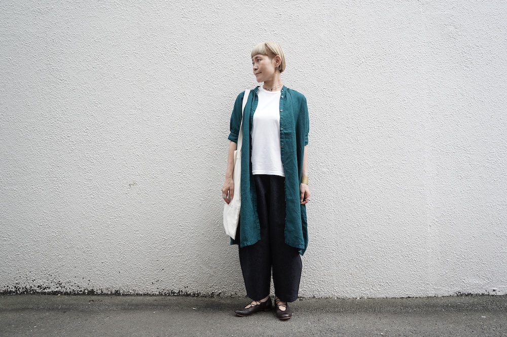 デザインは丸みのあるテーパードシルエットで、前後どちらを前にしても着用可能です。羽織ワンピースなどを重ねた際には、パッチポケットを前にしていただくとさりげなく便利です。ワンピースやチュニックなどの丈の長いものに合わせていただくのがメインですが、短いトップスでのスタイリングで撮影もしておりますので、ぜひ参考にしてみてください。透け感は我々の感覚ではほとんど気にならないと思いますが、自然光でよくよく見て、ぼんやりとシルエットがわかるかどうか程度です。ぜひ普通の着丈にもラフに合わせてお使いください。