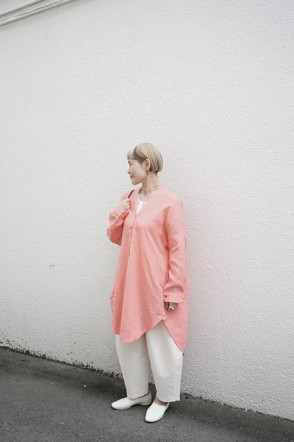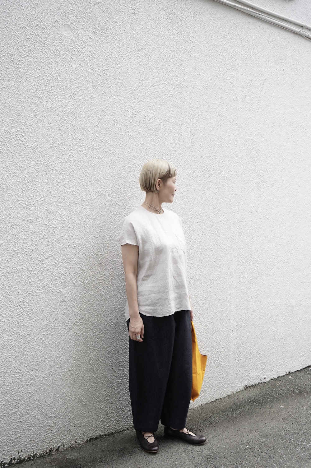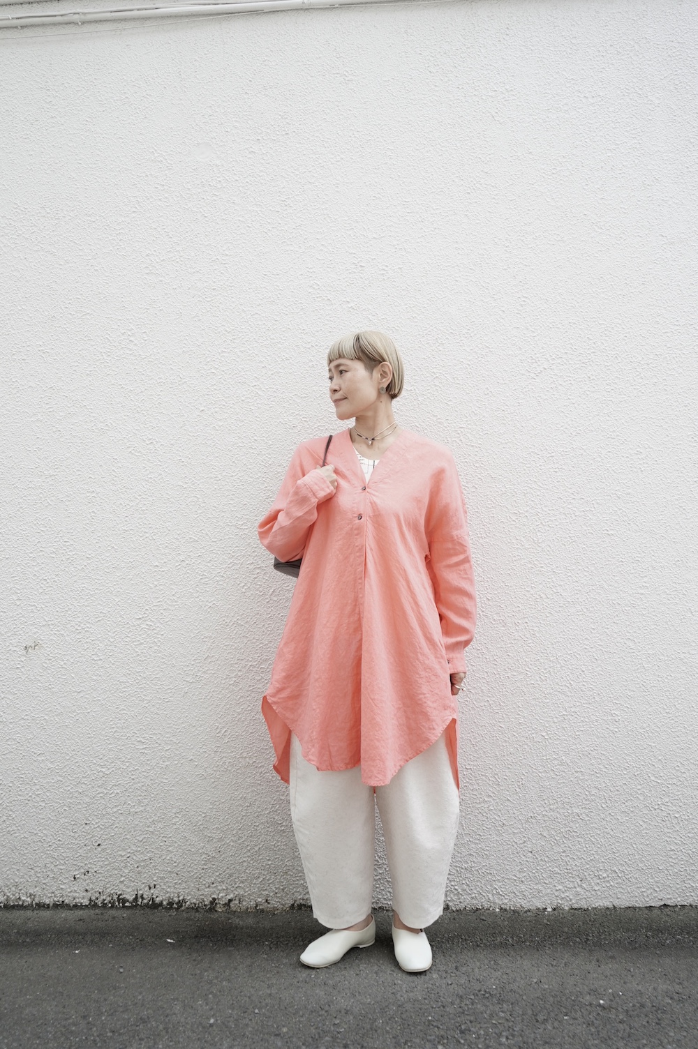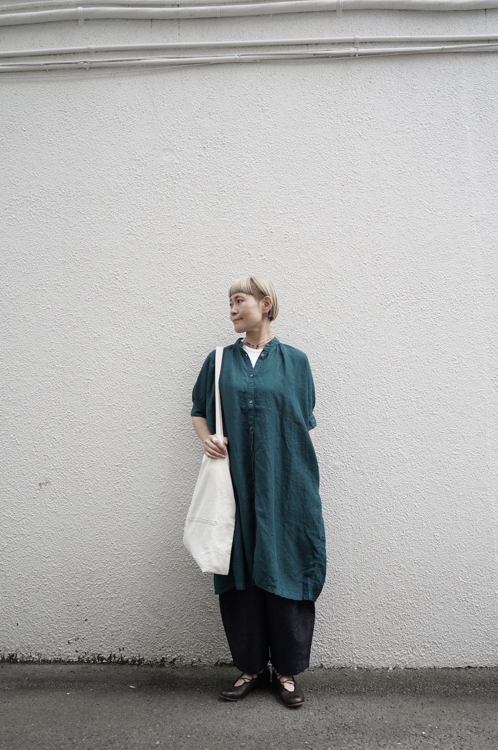 デザインは丸みのあるテーパードシルエットで、前後どちらを前にしても着用可能です。羽織ワンピースなどを重ねた際には、パッチポケットを前にしていただくとさりげなく便利です。ワンピースやチュニックなどの丈の長いものに合わせていただくのがメインですが、短いトップスでのスタイリングで撮影もしておりますので、ぜひ参考にしてみてください。透け感は我々の感覚ではほとんど気にならないと思いますが、自然光でよくよく見て、ぼんやりとシルエットがわかるかどうか程度です。ぜひ普通の着丈にもラフに合わせてお使いください。