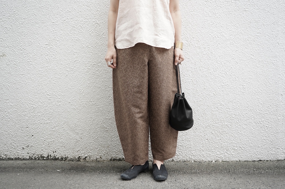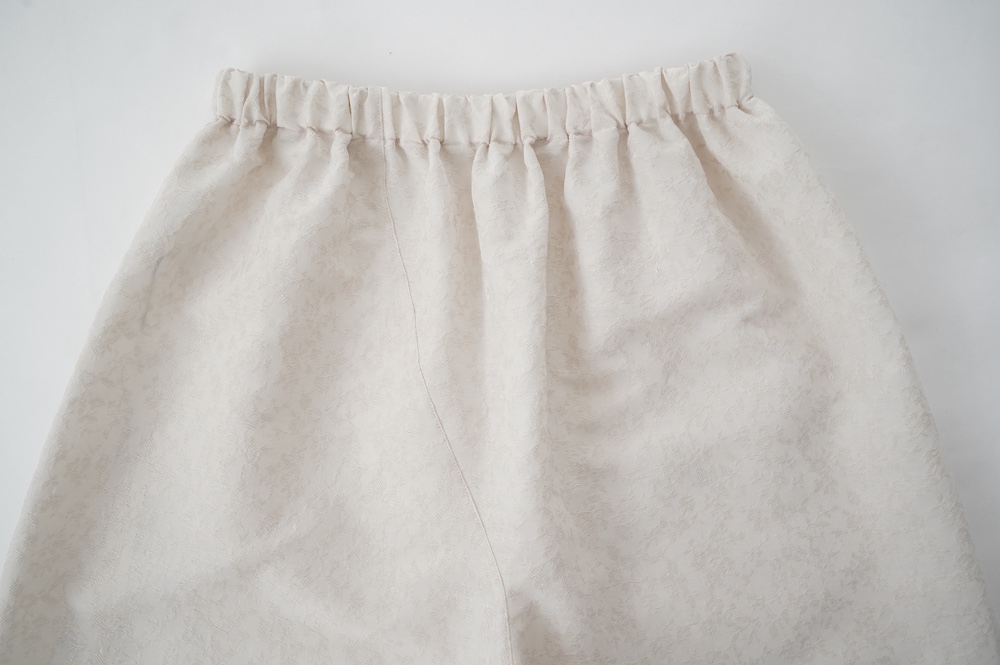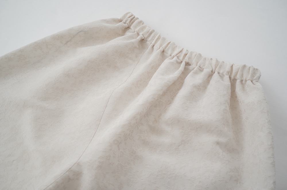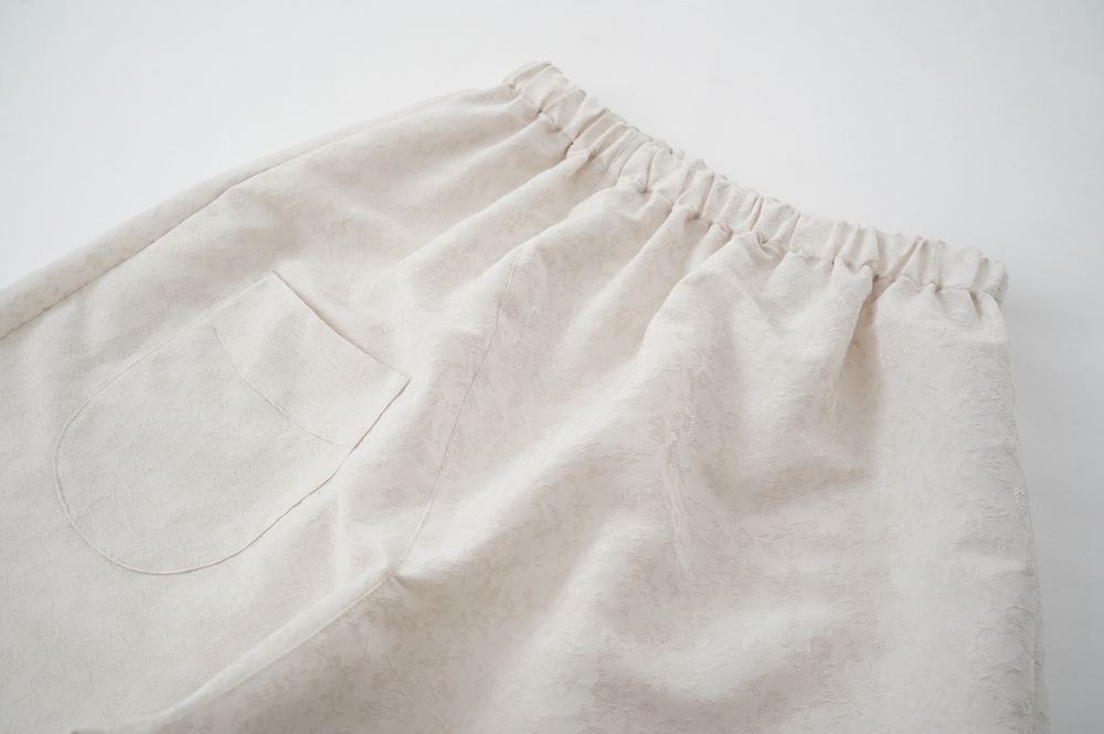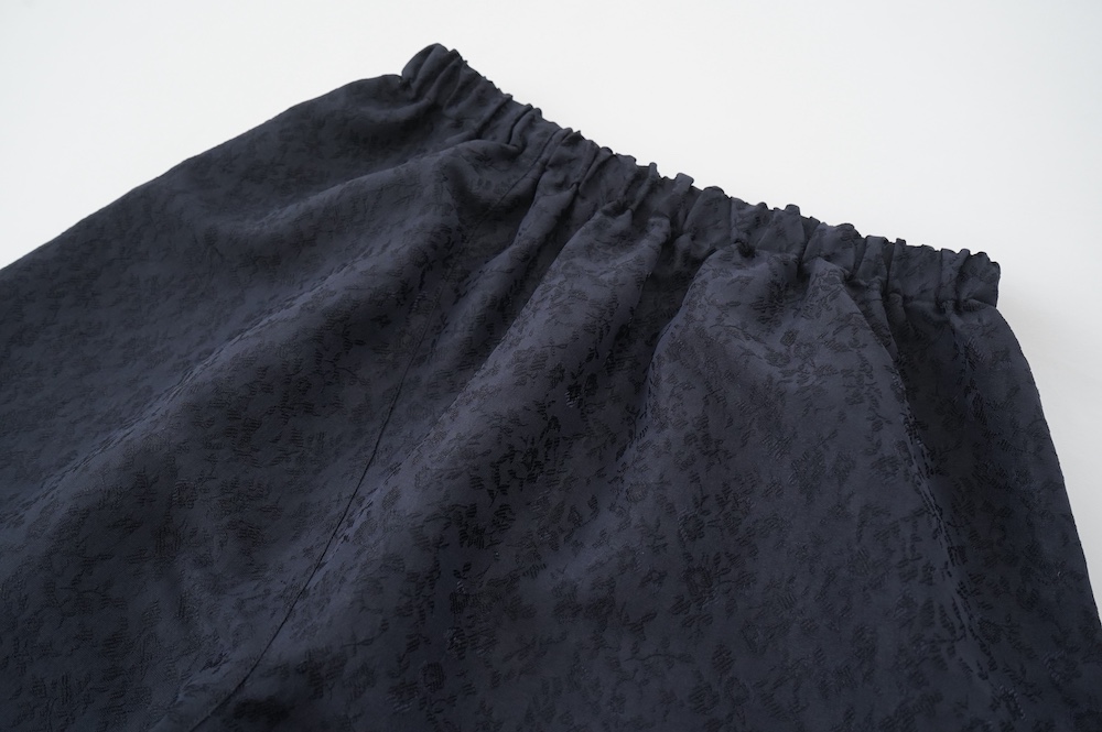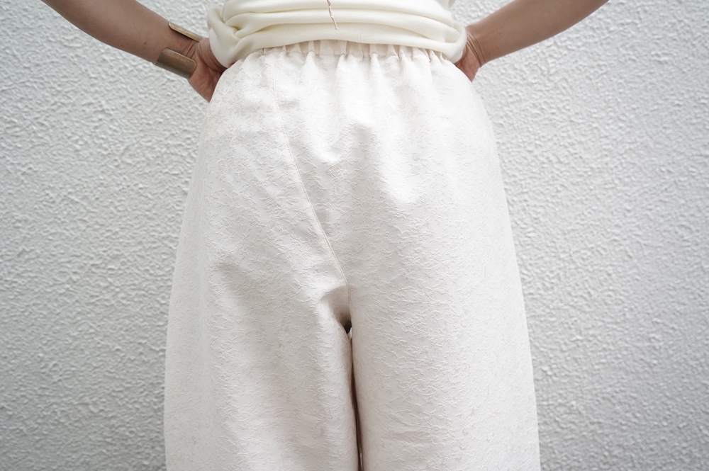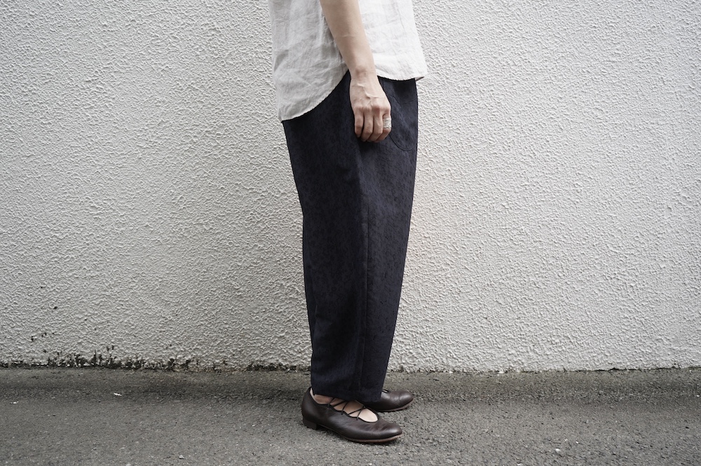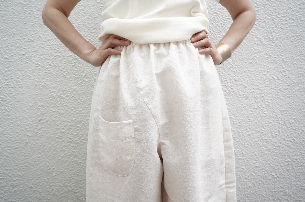 ユイのパンツ。ポリエステル100%のイージーケア素材でありながら、ナチュラルな雰囲気と表情のあるジャガード生地が特徴です。光沢感があり、さりげなく花柄が施されており、スタイリングのポイントになる柄生地です。