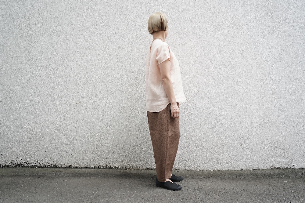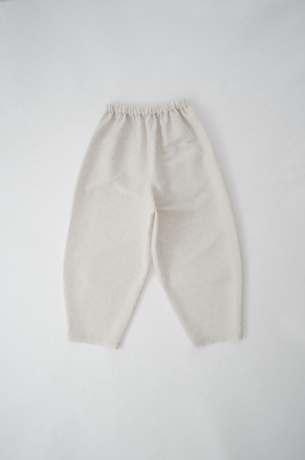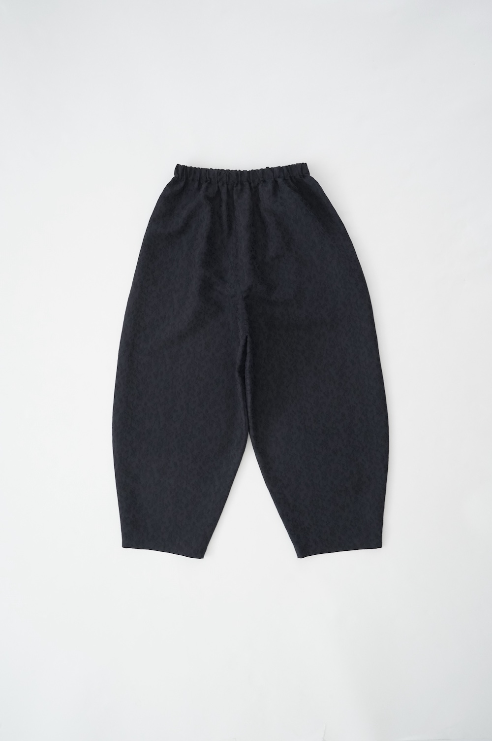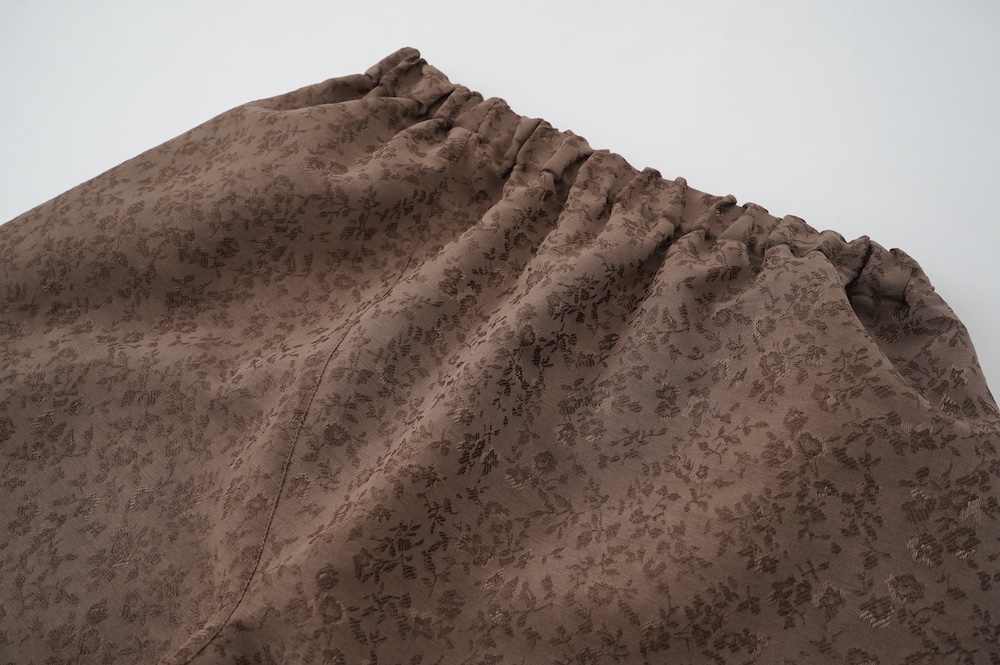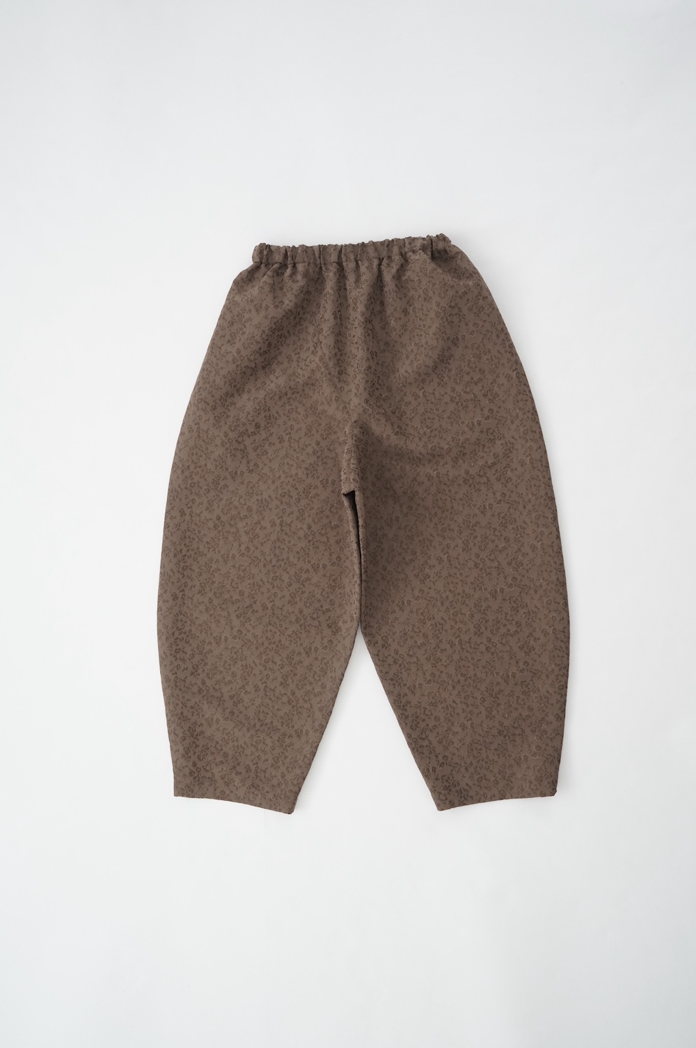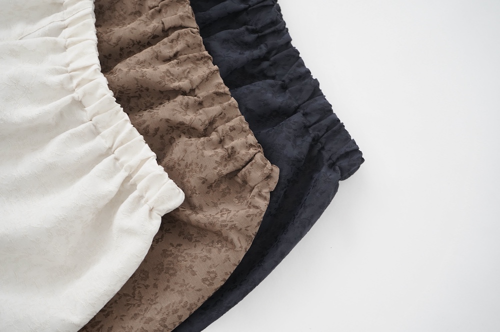 ユイのパンツ。ポリエステル100%のイージーケア素材でありながら、ナチュラルな雰囲気と表情のあるジャガード生地が特徴です。光沢感があり、さりげなく花柄が施されており、スタイリングのポイントになる柄生地です。