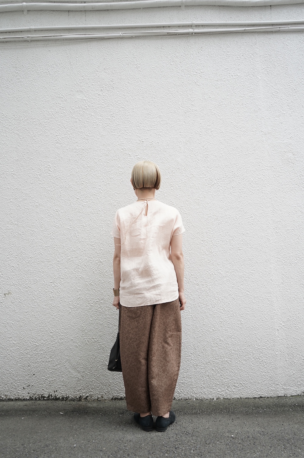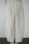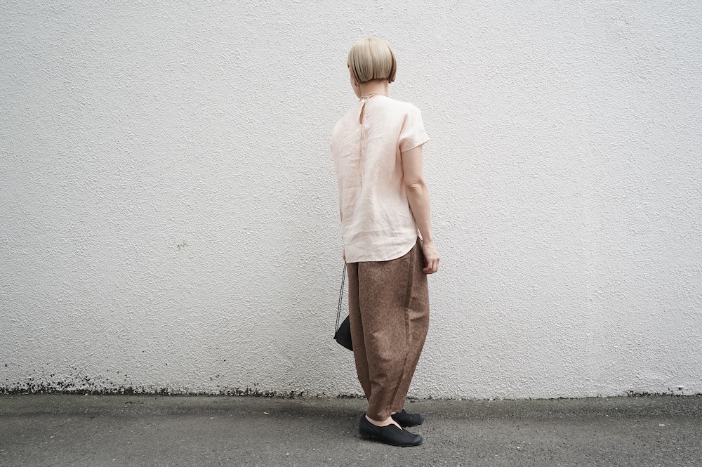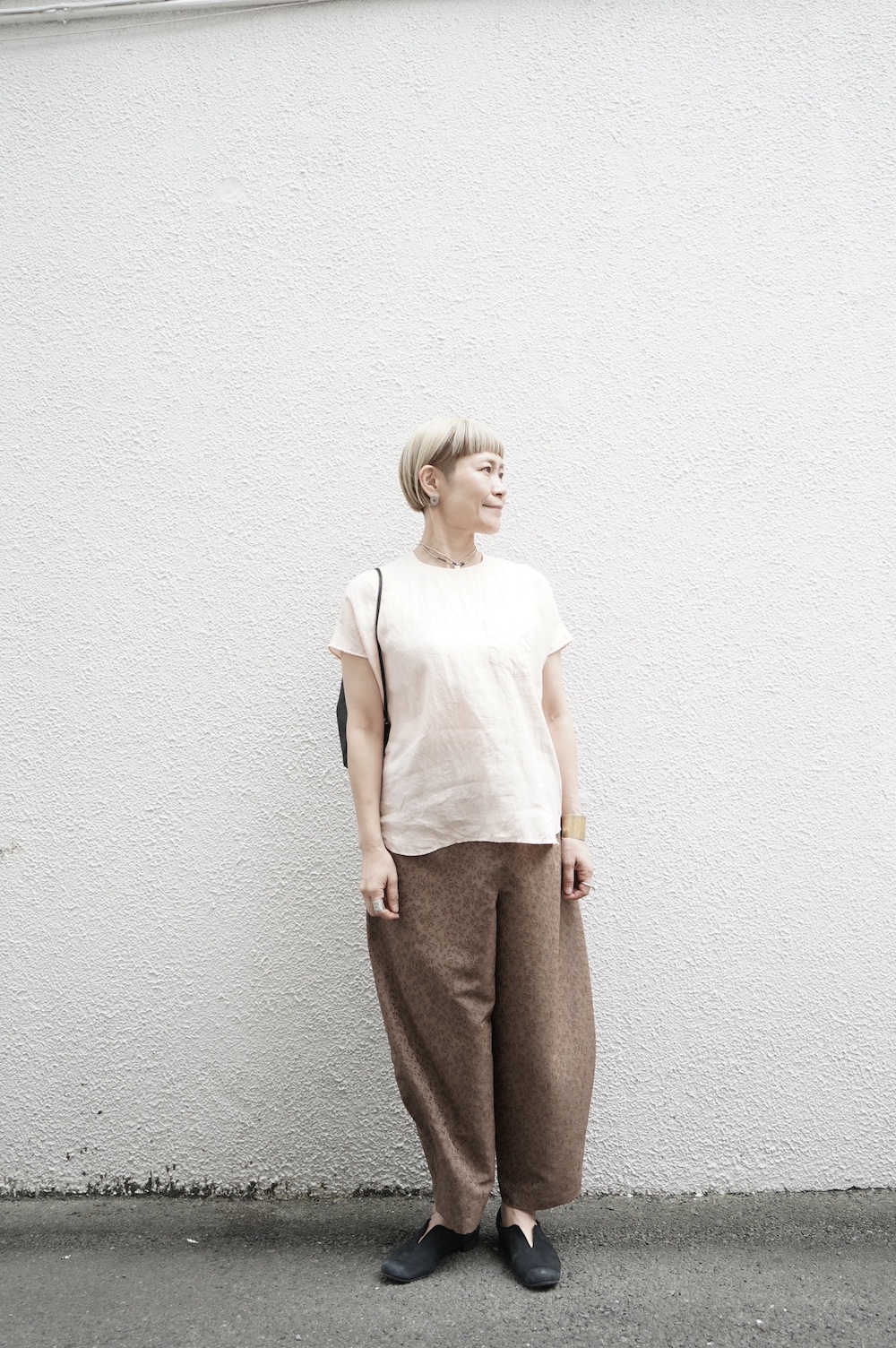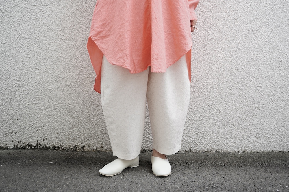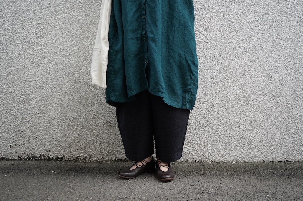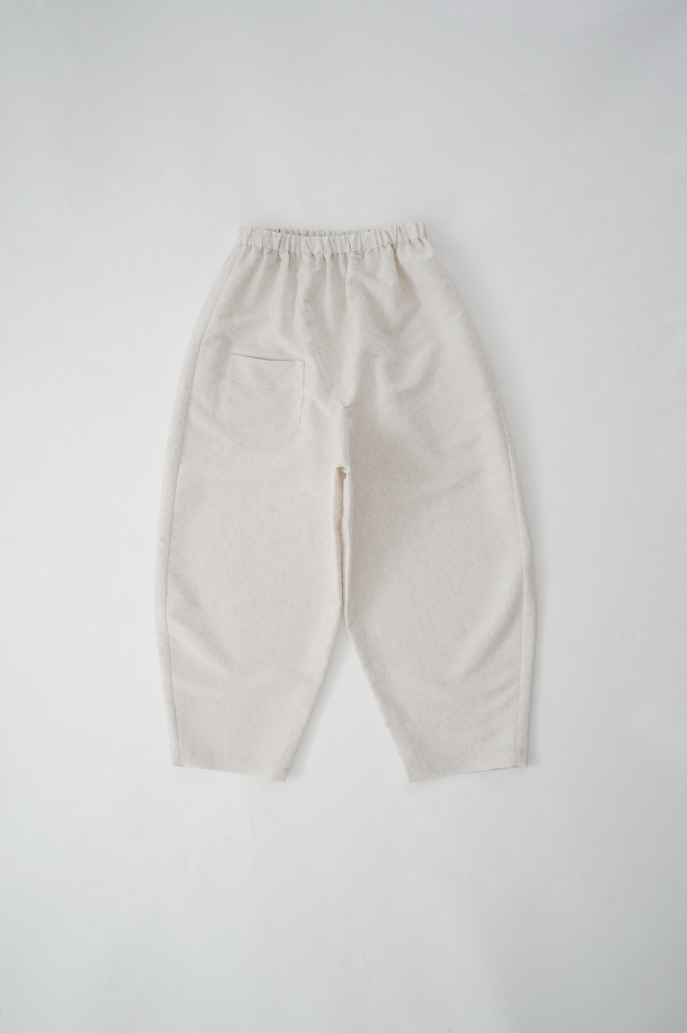 ユイのパンツ。ポリエステル100%のイージーケア素材でありながら、ナチュラルな雰囲気と表情のあるジャガード生地が特徴です。光沢感があり、さりげなく花柄が施されており、スタイリングのポイントになる柄生地です。