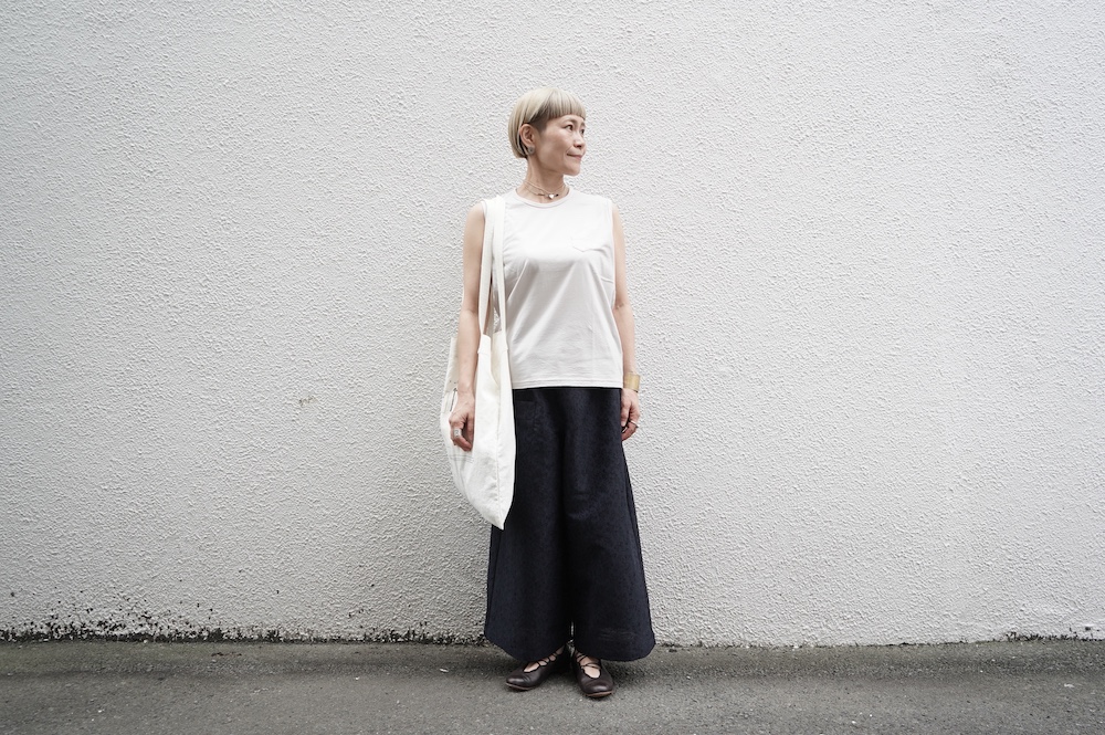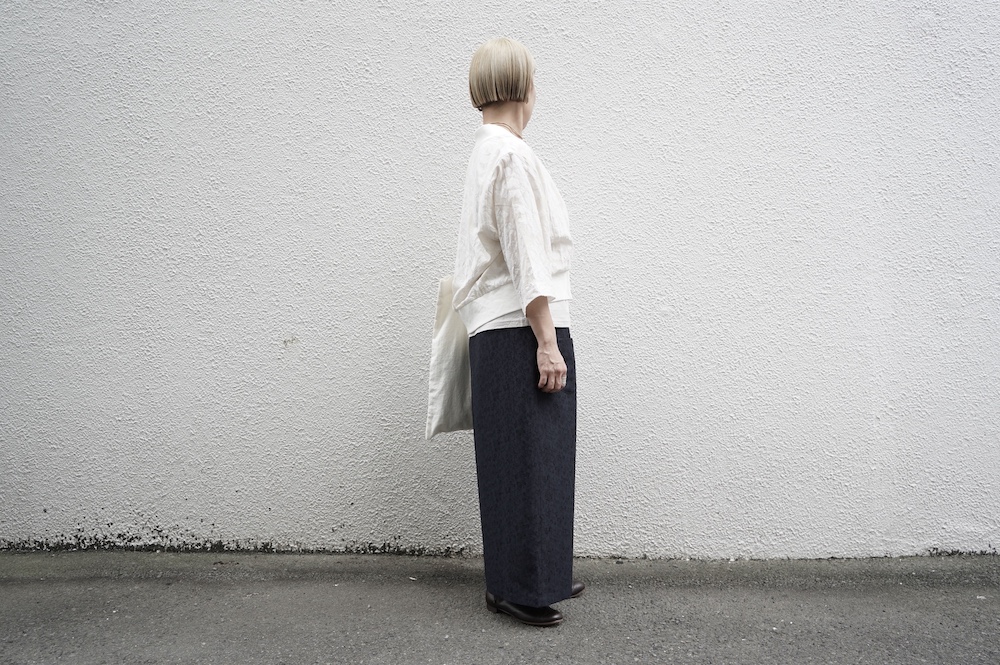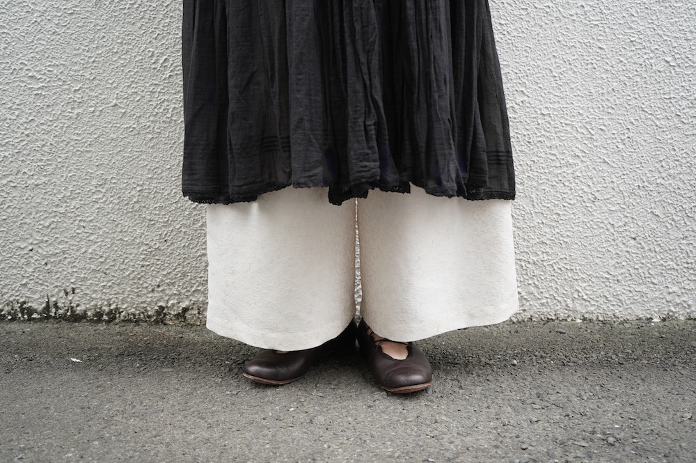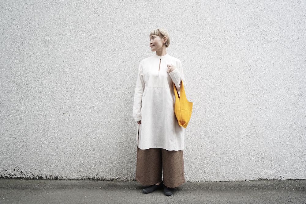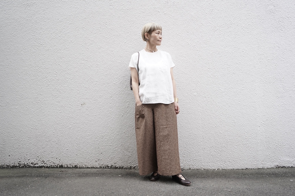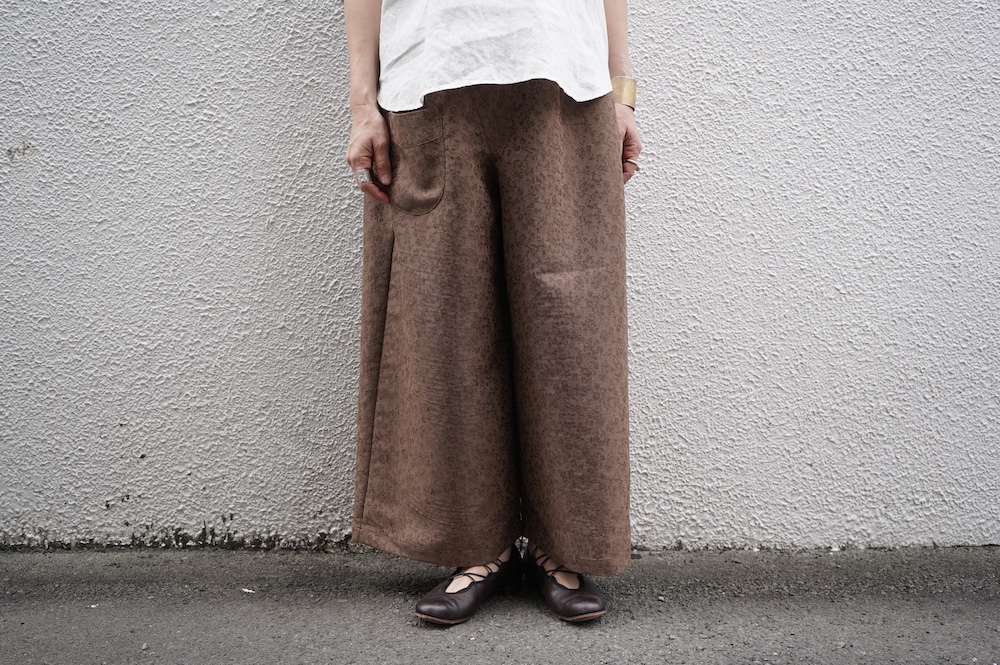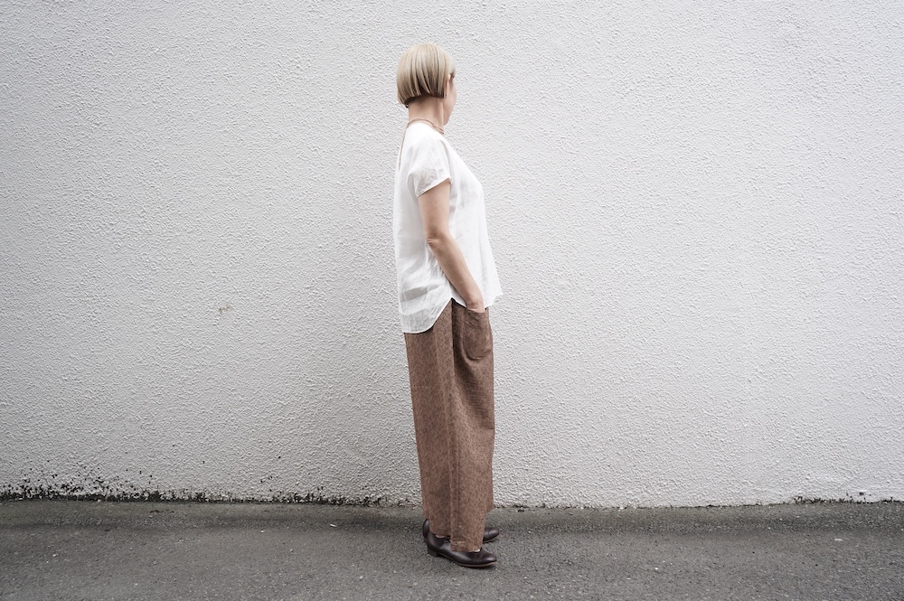 デザインはシンプルなワイドシルエットで、重ね着に便利に使っていただくことを目指して誕生したパンツです。このワイドシルエットは昨年からの新型です。パッチポケットが使用しやすいよう前後どちらを前にしても着用可能です。ワンピースやチュニックなどの丈の長いものに合わせていただくのがメインとして、撮影ではブラウスなども合わせていますので、そちらをぜひ参考にご覧ください。透け感は我々の感覚ではほとんど気にならないと思いますが、自然光でよくよく見て、ぼんやりとシルエットがわかるかどうか程度です。ぜひ普通の着丈にもラフに合わせてお使いください。