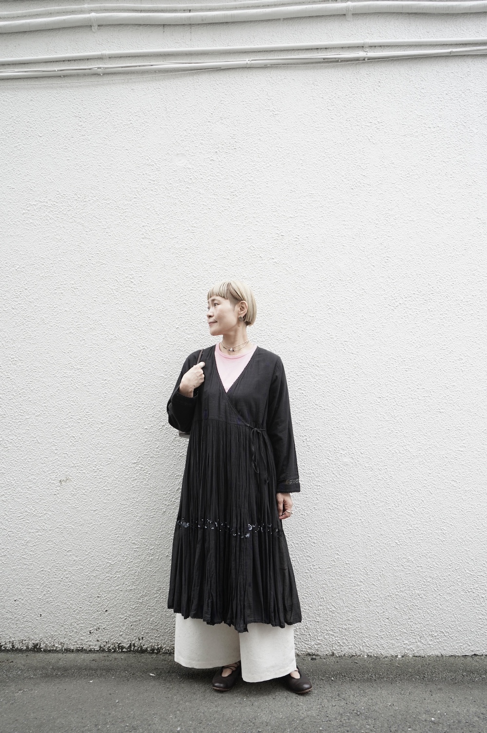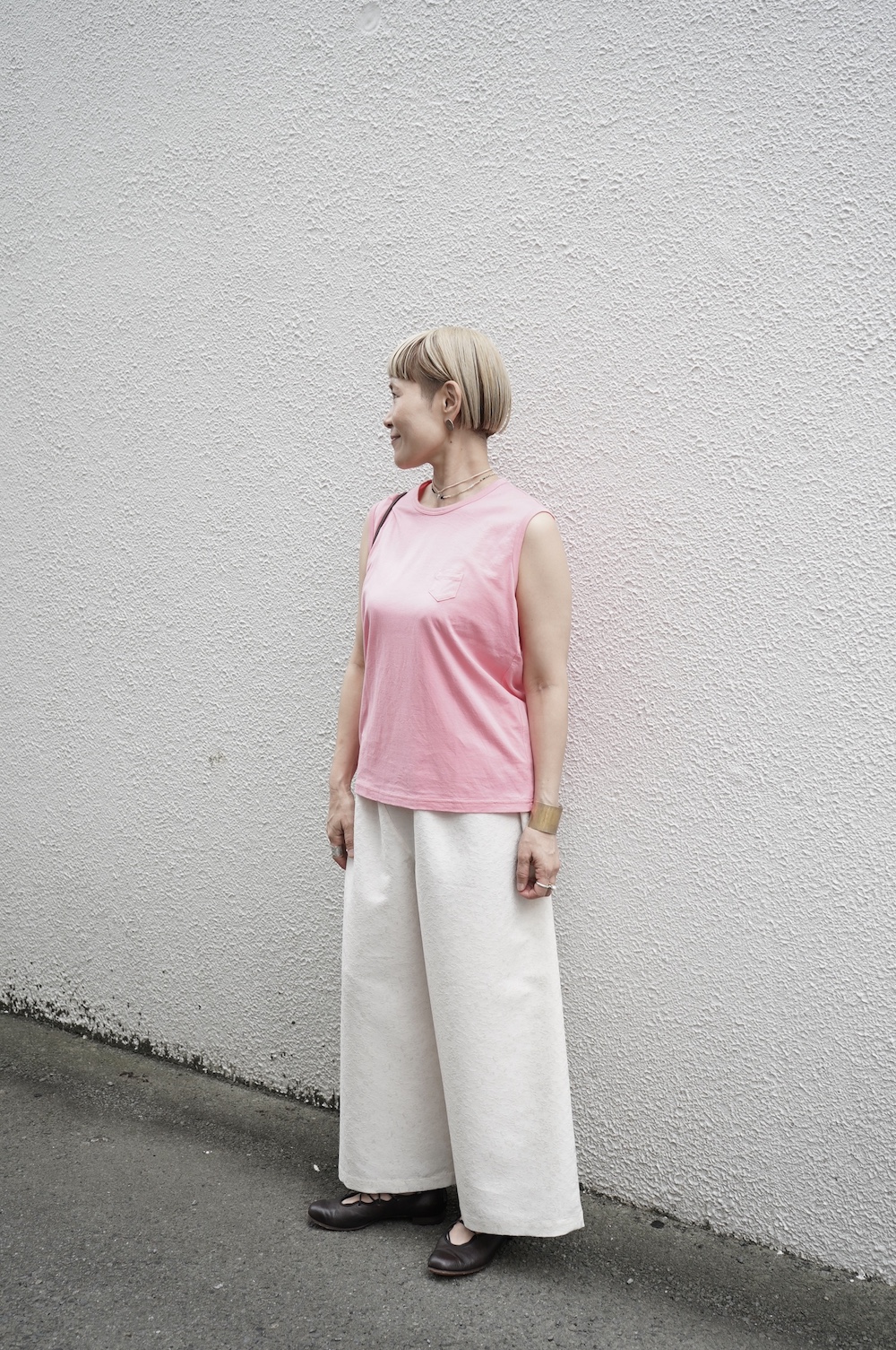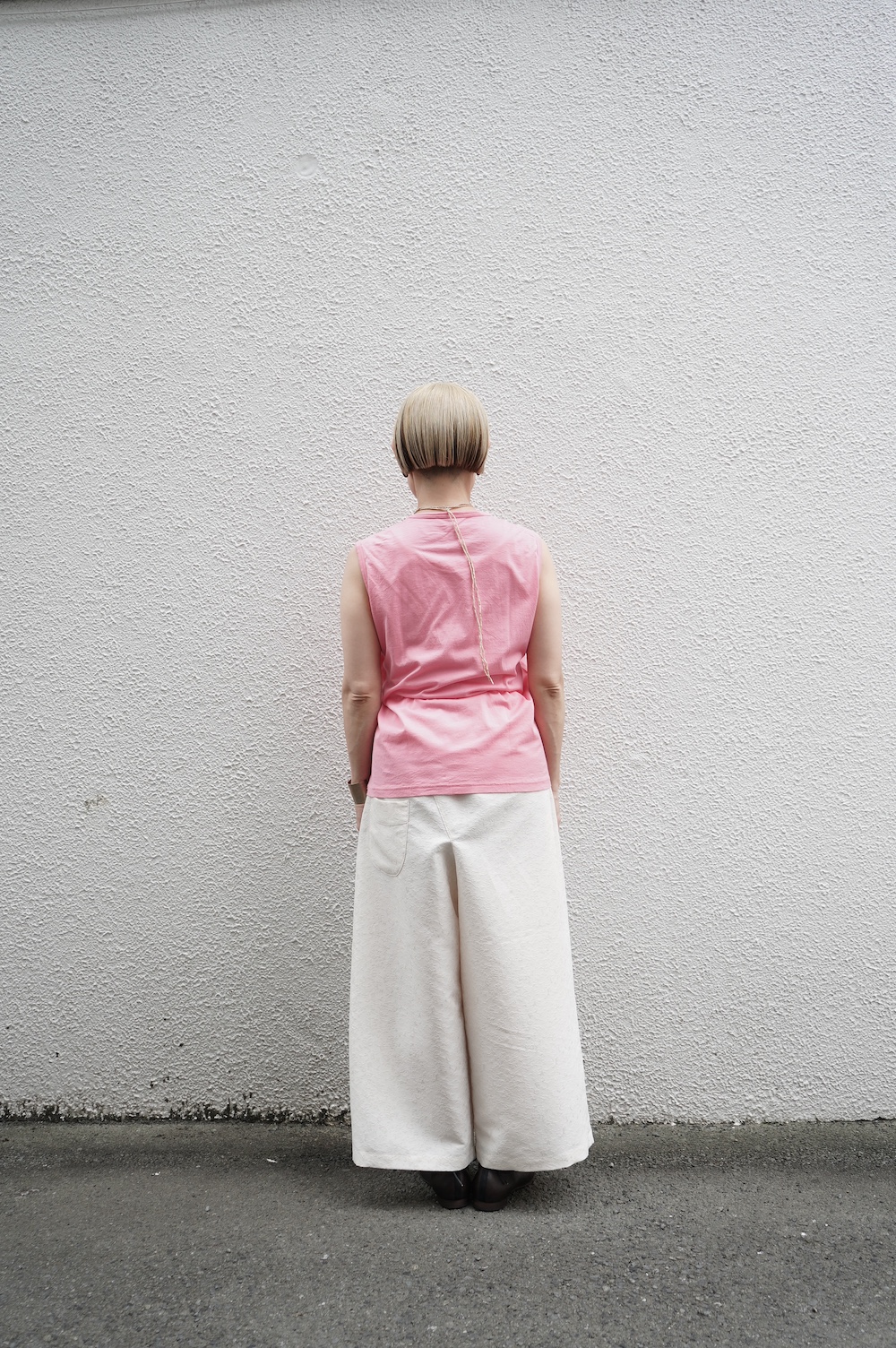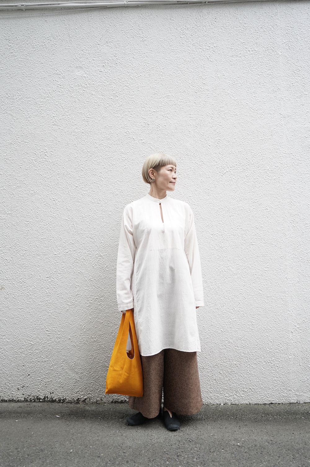 デザインはシンプルなワイドシルエットで、重ね着に便利に使っていただくことを目指して誕生したパンツです。このワイドシルエットは昨年からの新型です。パッチポケットが使用しやすいよう前後どちらを前にしても着用可能です。ワンピースやチュニックなどの丈の長いものに合わせていただくのがメインとして、撮影ではブラウスなども合わせていますので、そちらをぜひ参考にご覧ください。透け感は我々の感覚ではほとんど気にならないと思いますが、自然光でよくよく見て、ぼんやりとシルエットがわかるかどうか程度です。ぜひ普通の着丈にもラフに合わせてお使いください。