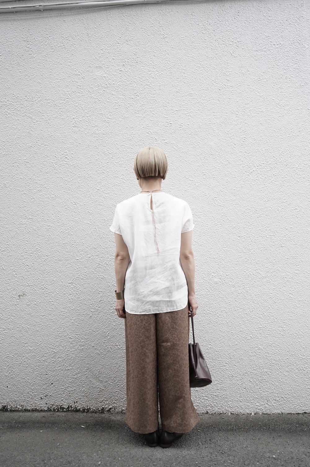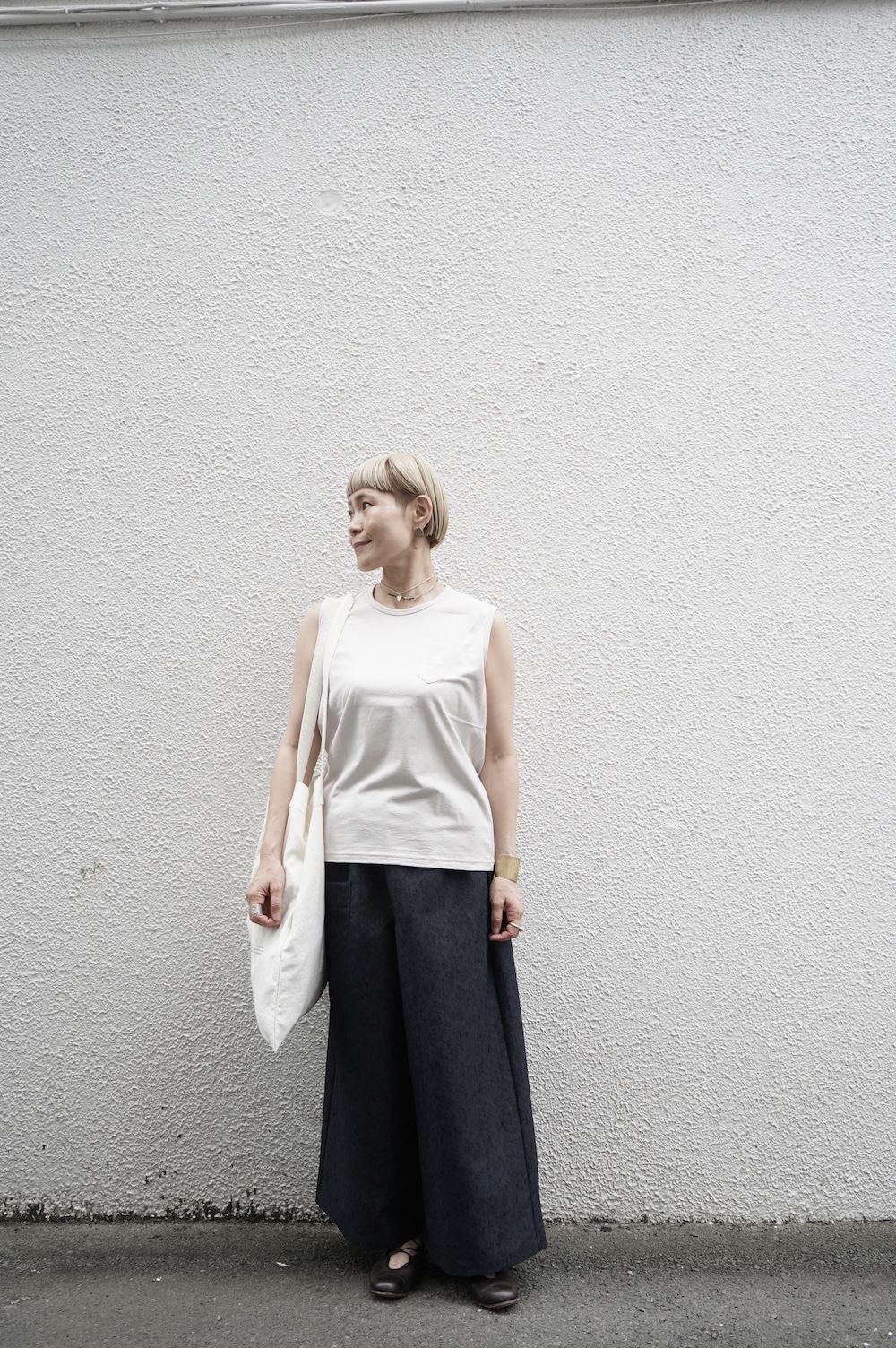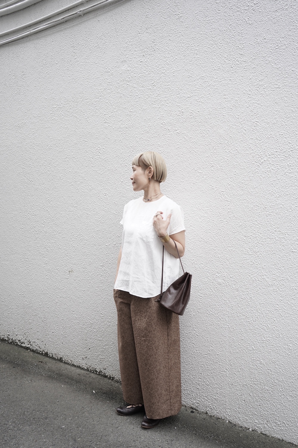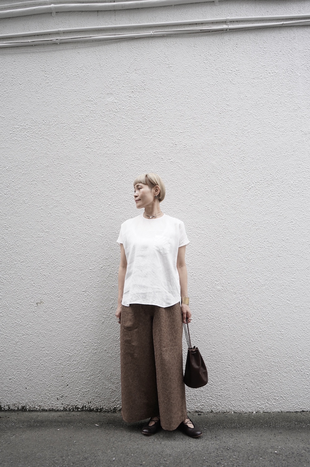 デザインはシンプルなワイドシルエットで、重ね着に便利に使っていただくことを目指して誕生したパンツです。このワイドシルエットは昨年からの新型です。パッチポケットが使用しやすいよう前後どちらを前にしても着用可能です。ワンピースやチュニックなどの丈の長いものに合わせていただくのがメインとして、撮影ではブラウスなども合わせていますので、そちらをぜひ参考にご覧ください。透け感は我々の感覚ではほとんど気にならないと思いますが、自然光でよくよく見て、ぼんやりとシルエットがわかるかどうか程度です。ぜひ普通の着丈にもラフに合わせてお使いください。