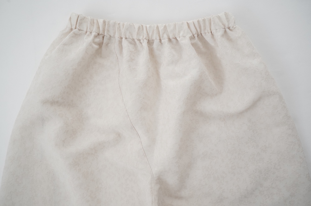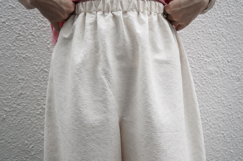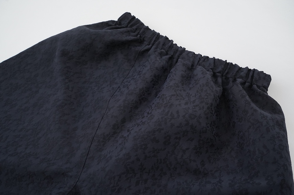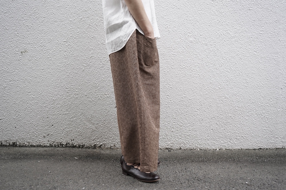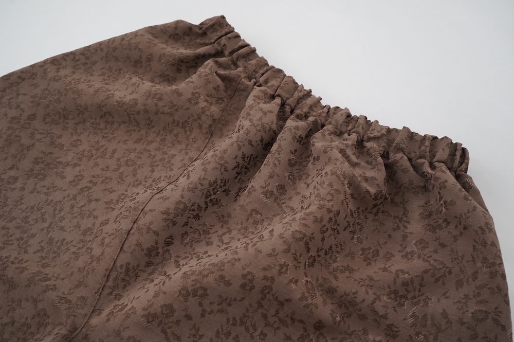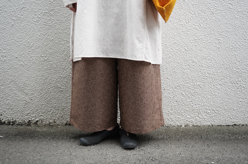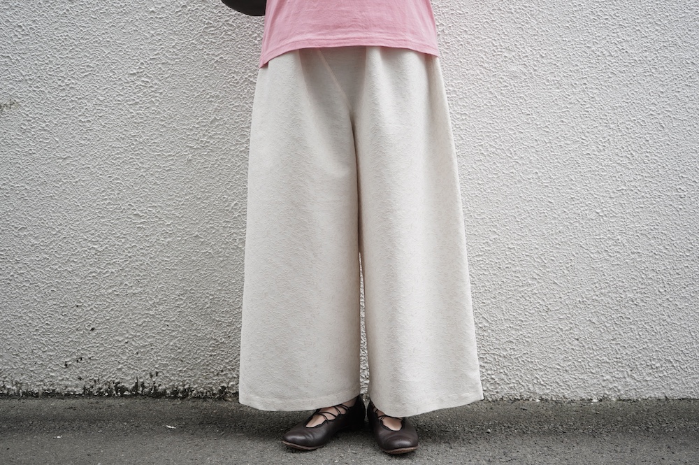 ユイのパンツ。ポリエステル100%のイージーケア素材でありながら、ナチュラルな天然素材とも相性の良いジャガード生地を使用しています。光沢感があり、花柄がさりげなく施されており、スタイリングに馴染みのいい素材です。