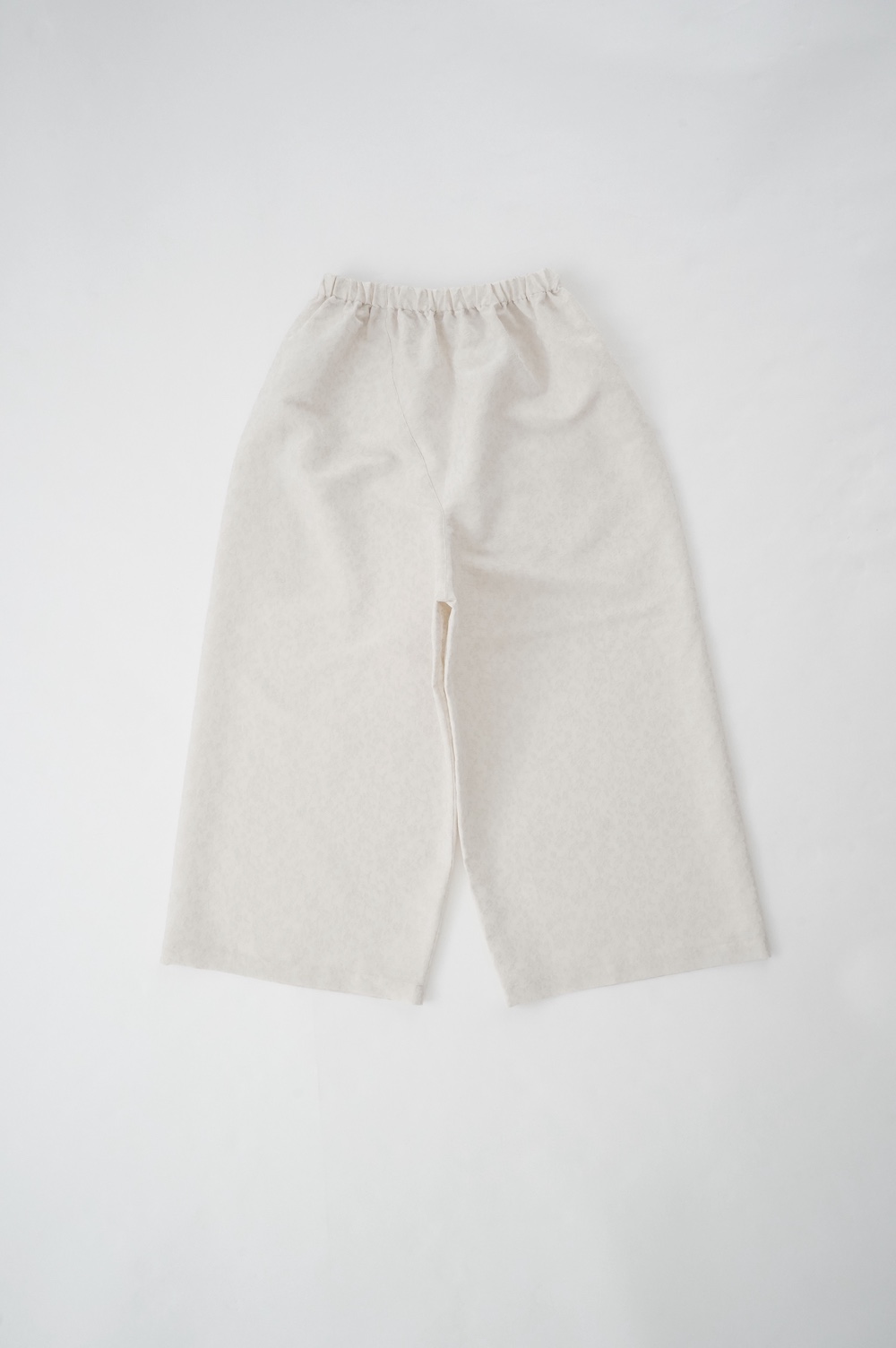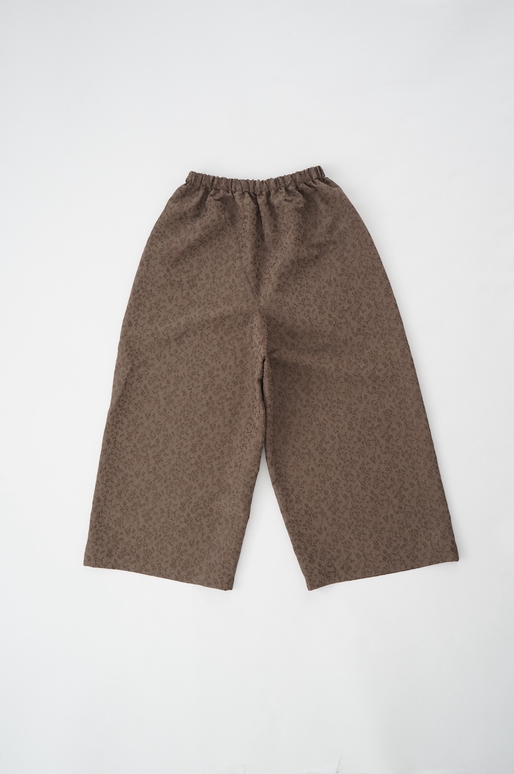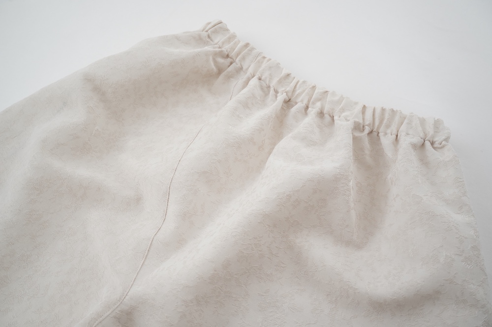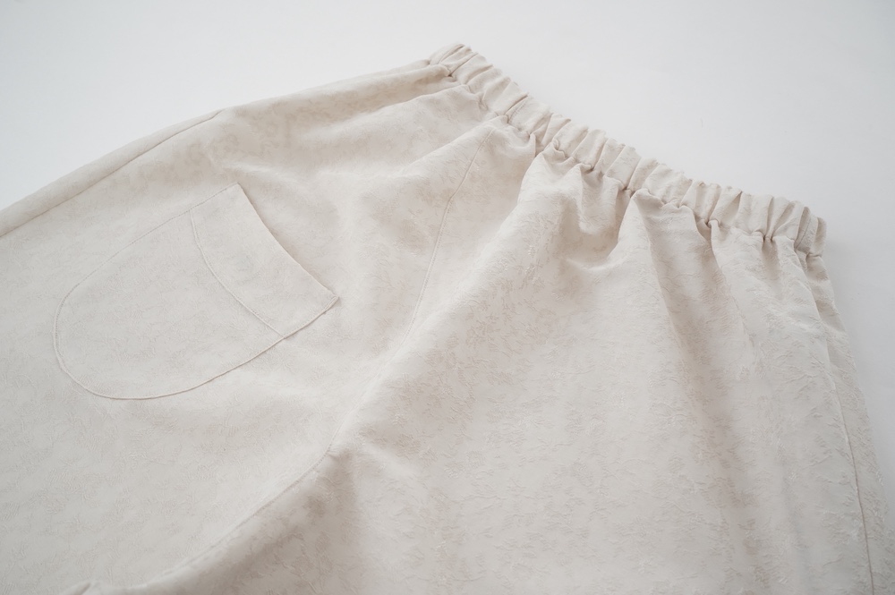ユイのパンツ。ポリエステル100%のイージーケア素材でありながら、ナチュラルな天然素材とも相性の良いジャガード生地を使用しています。光沢感があり、花柄がさりげなく施されており、スタイリングに馴染みのいい素材です。