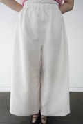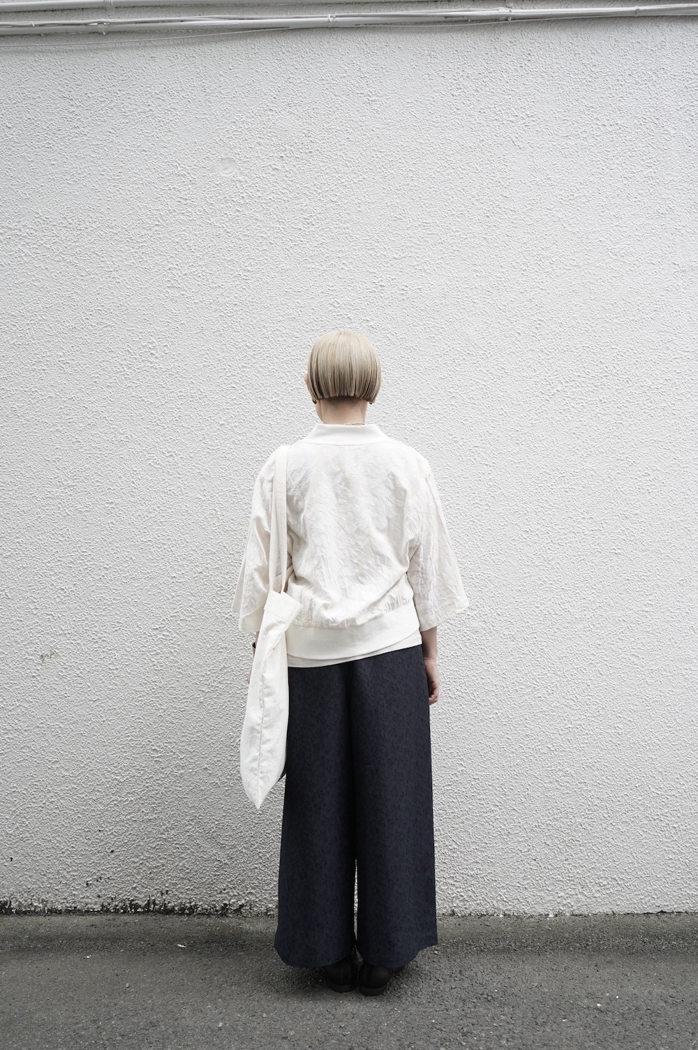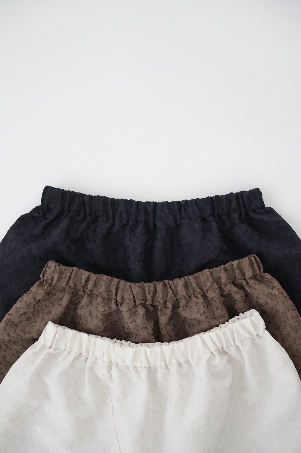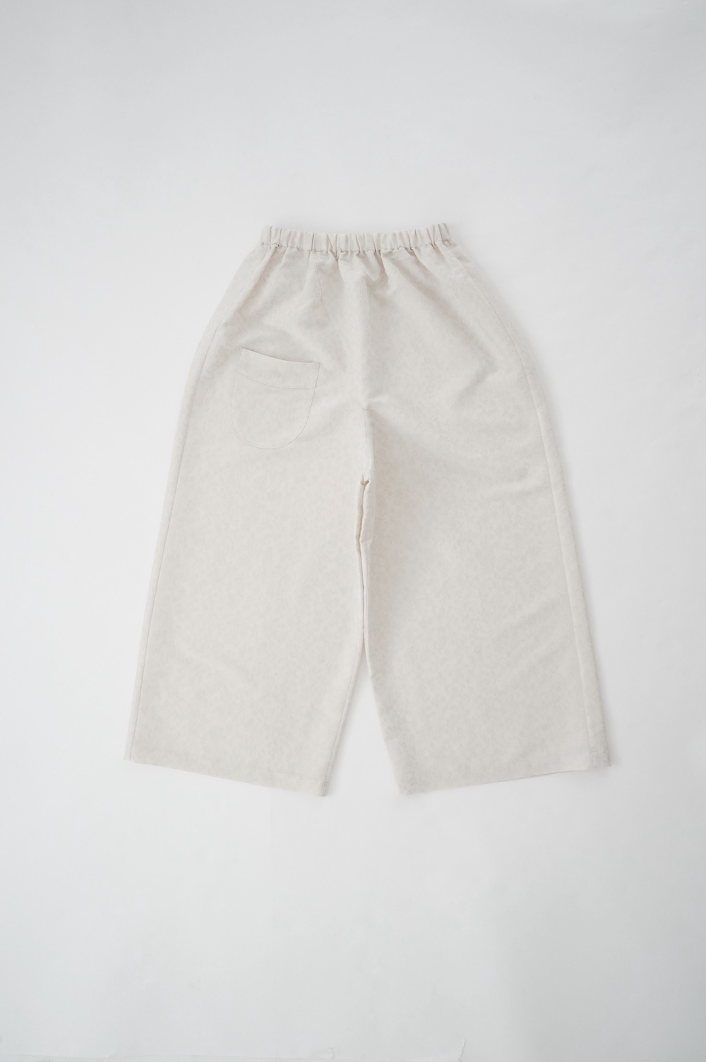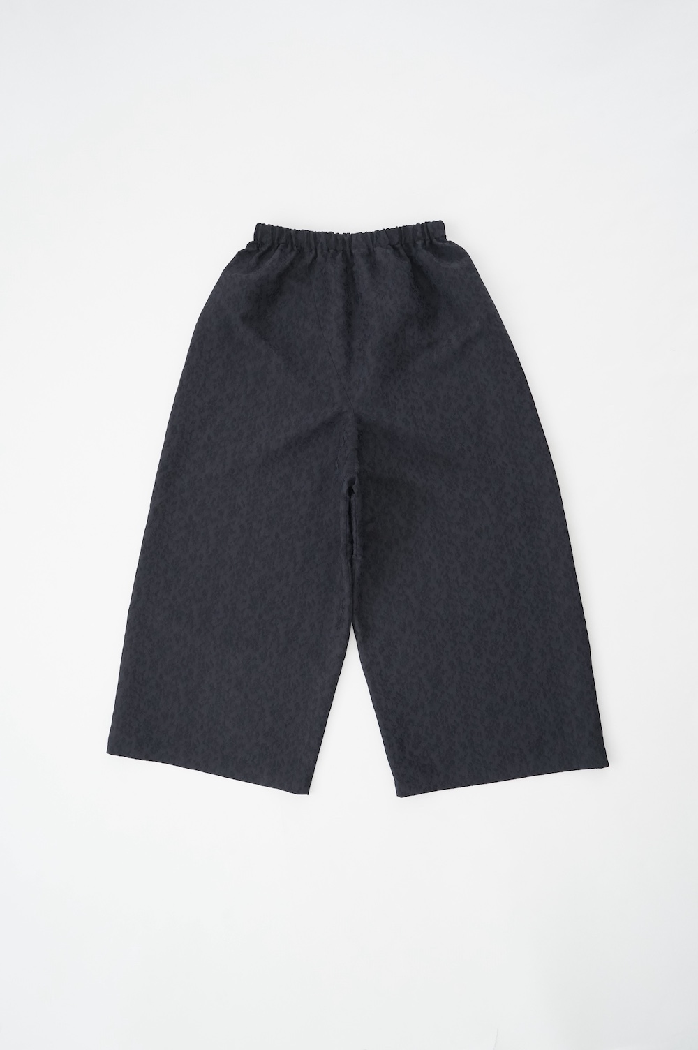 ユイのパンツ。ポリエステル100%のイージーケア素材でありながら、ナチュラルな天然素材とも相性の良いジャガード生地を使用しています。光沢感があり、花柄がさりげなく施されており、スタイリングに馴染みのいい素材です。